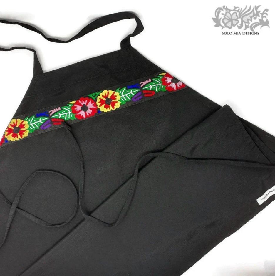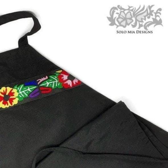 Our Black Polyester Apron with Hibiscus Mola Jacquard Ribbon adds a festive twist to a classic household essential. Its 100% polyester construction makes it both comfortable and easy to care for, while the mola-style pattern embodies the look of handcrafted and vintage. Measuring 32" long, 28" wide at the waist, 12.5" wide at each strap and 30" long for waist ties, it fits most people.