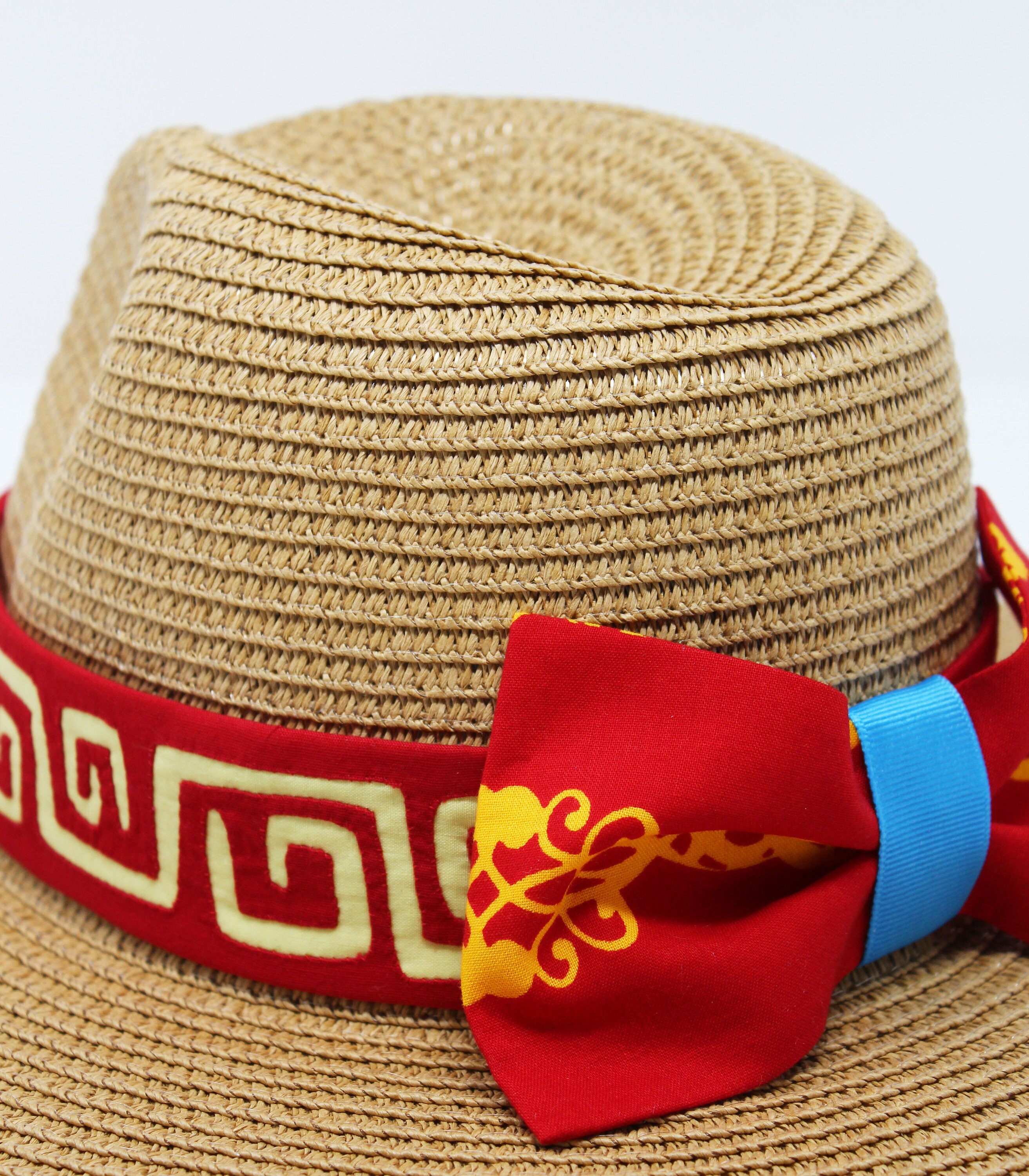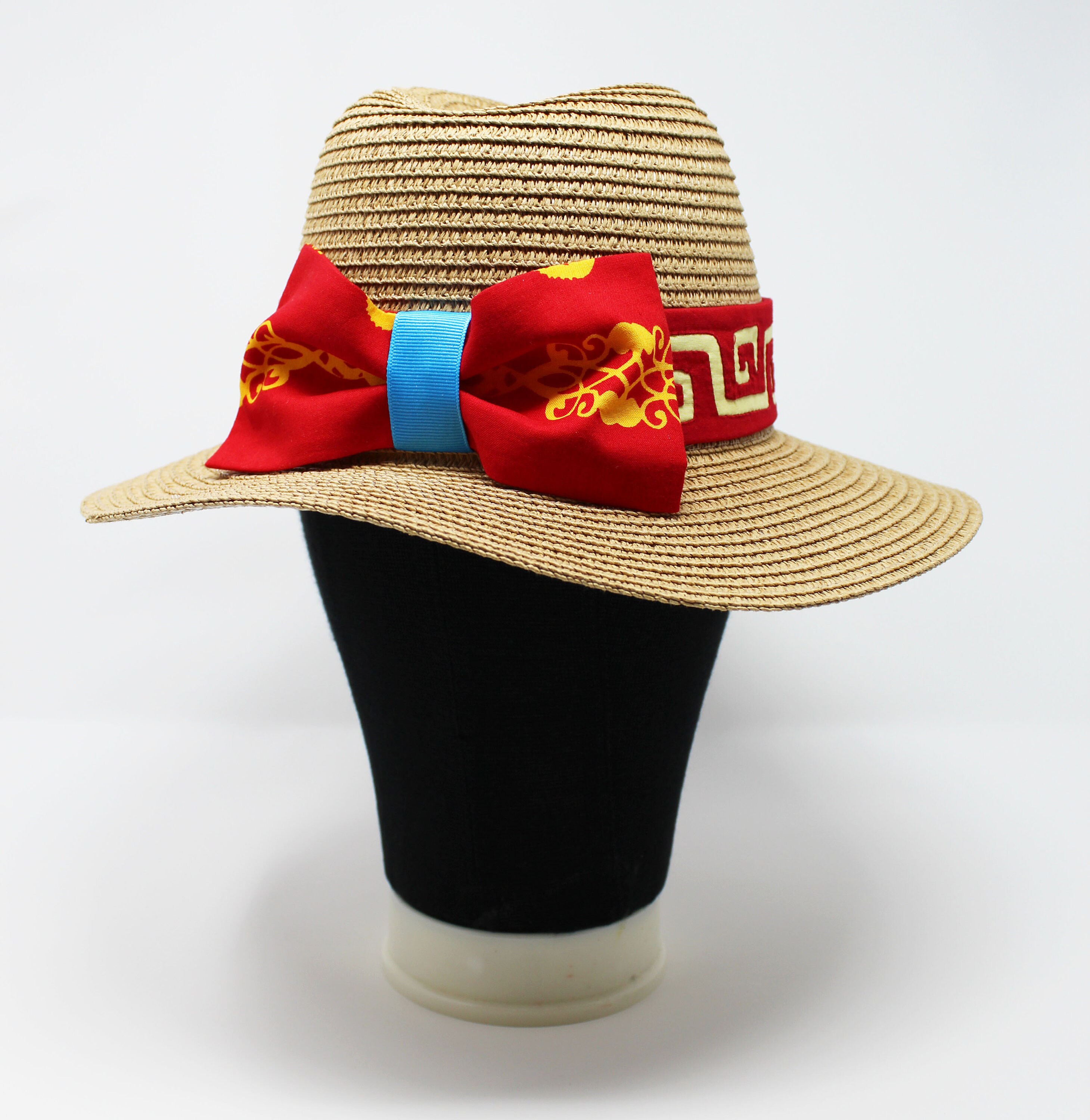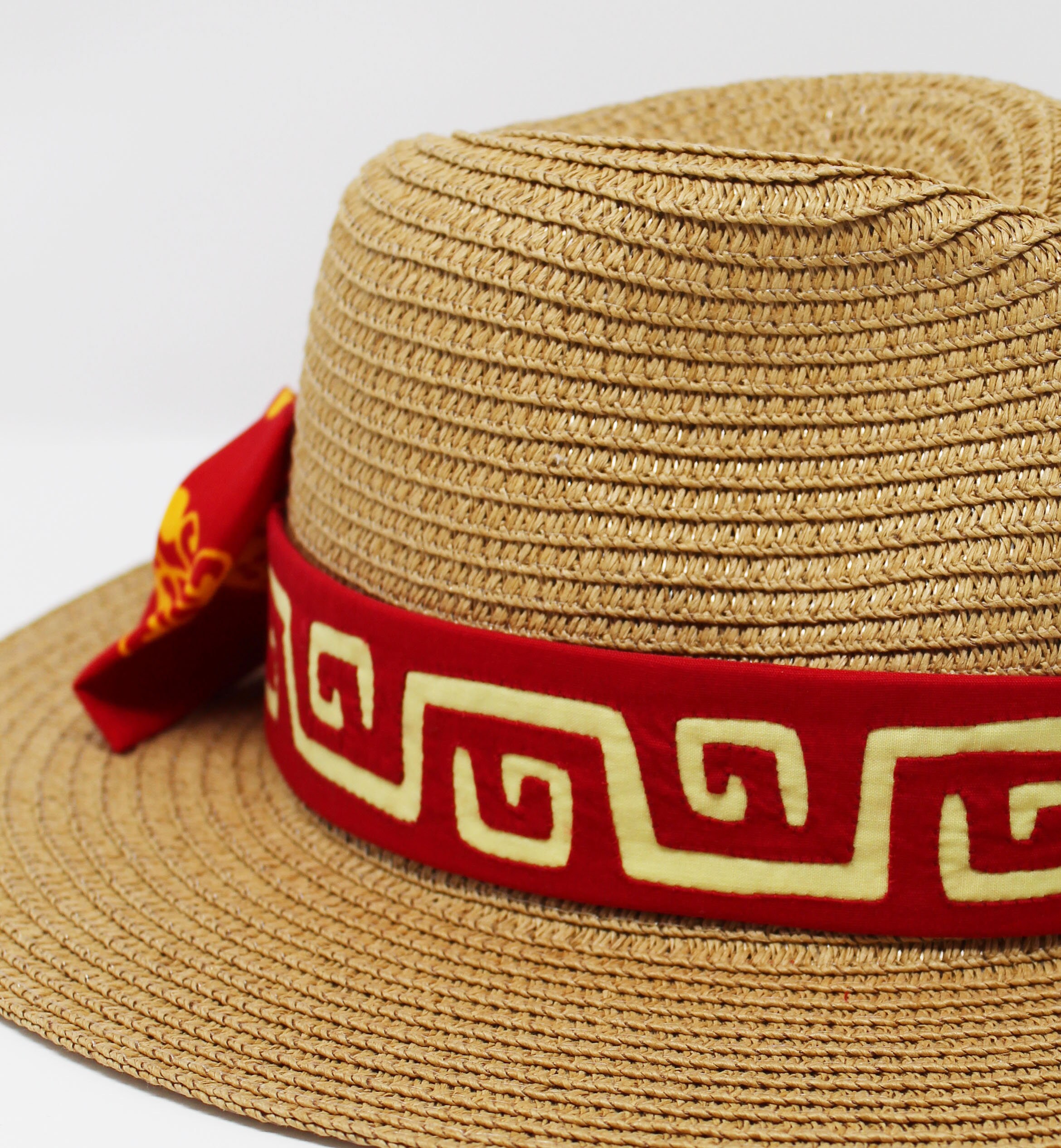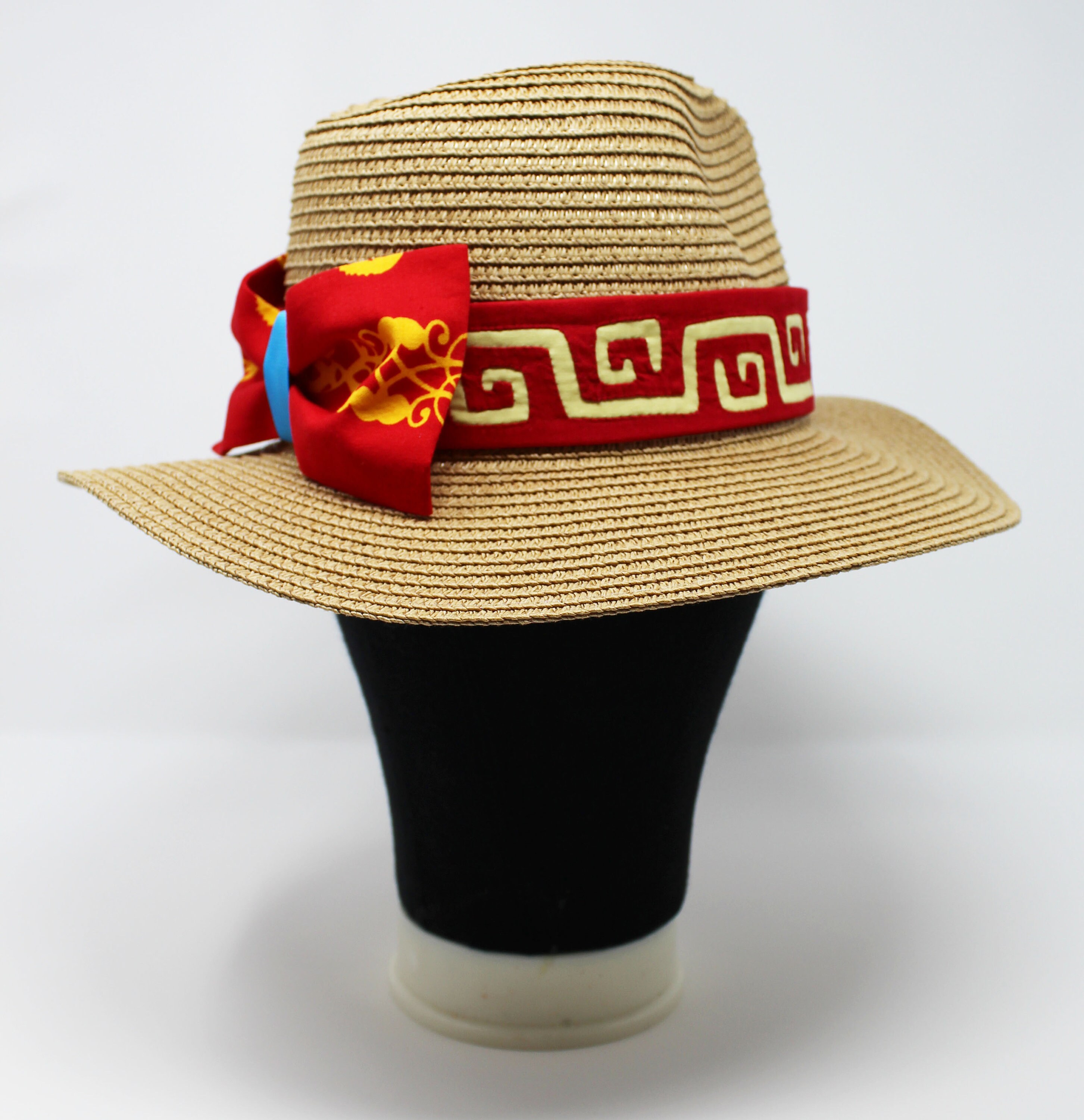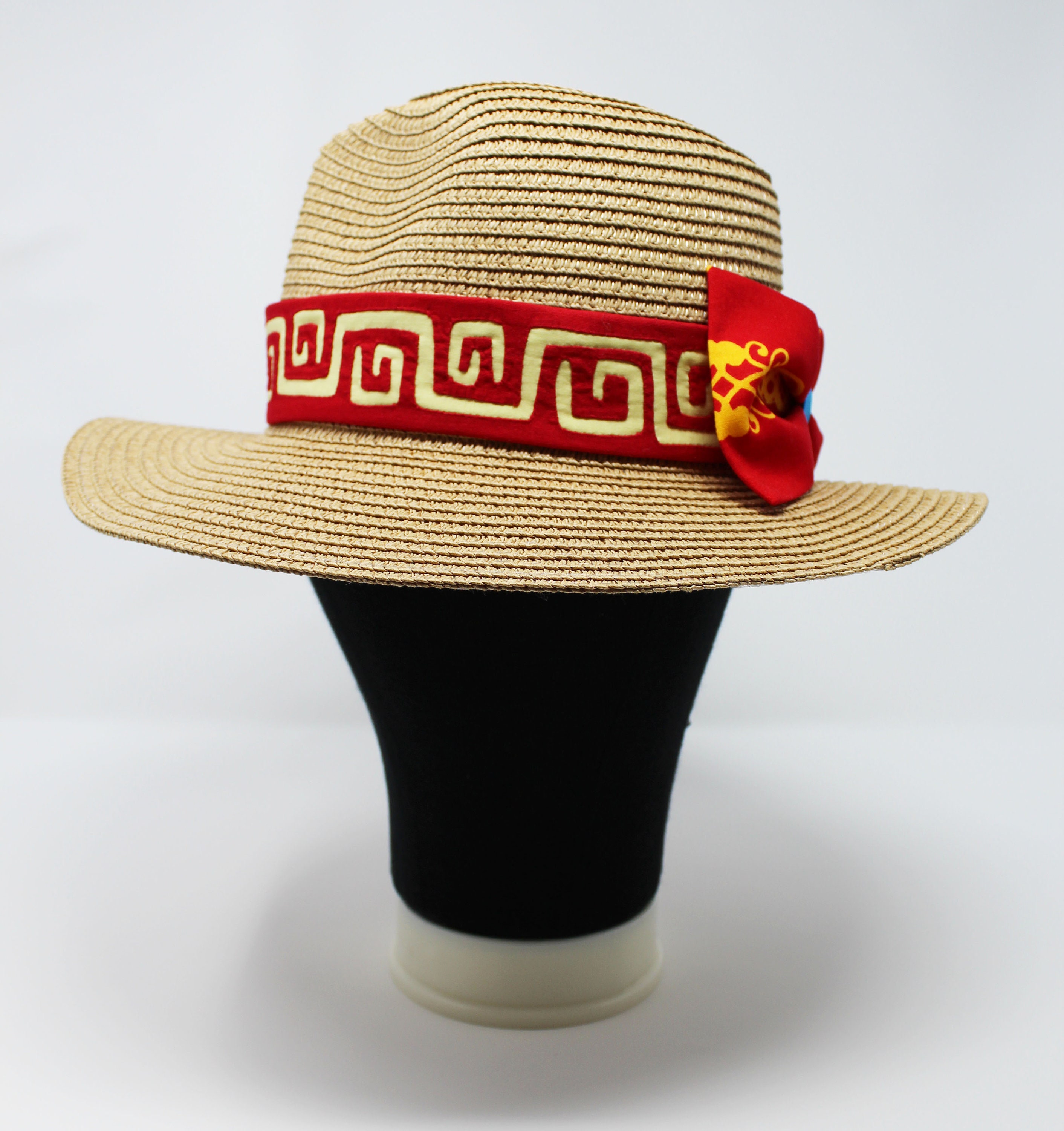 Tan straw hat that is trimmed with a lined, geometric mola strip and a musue bow.