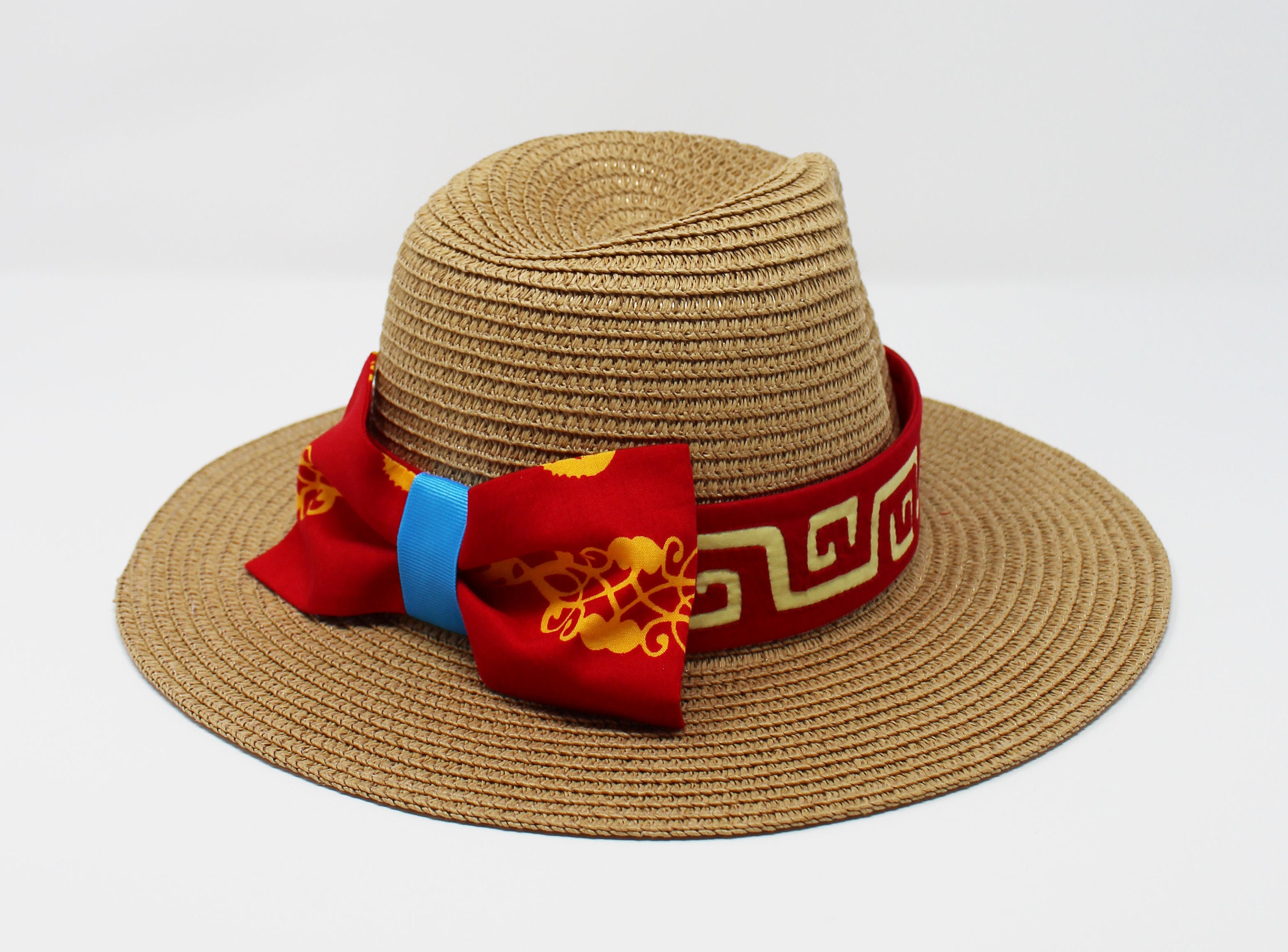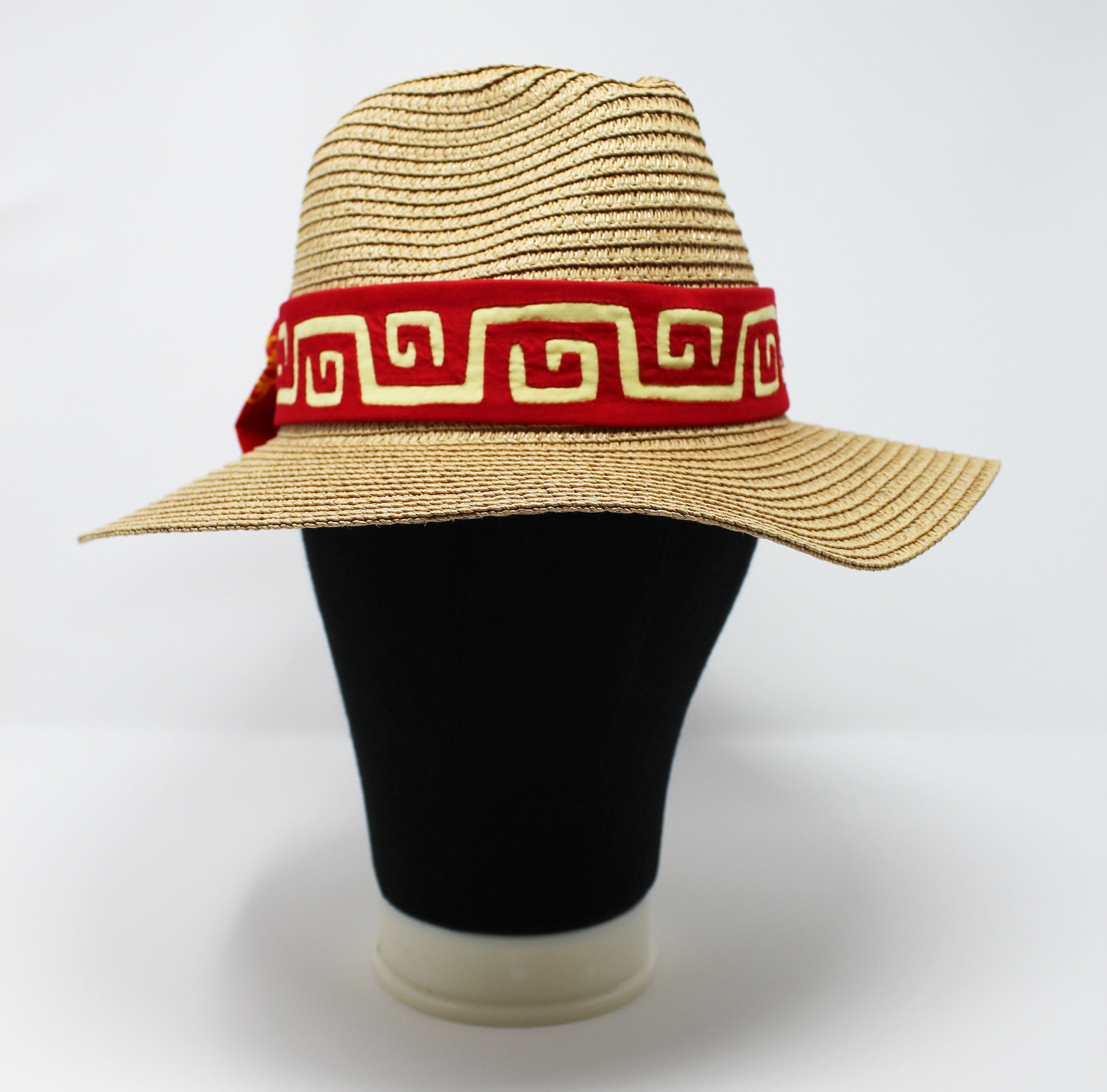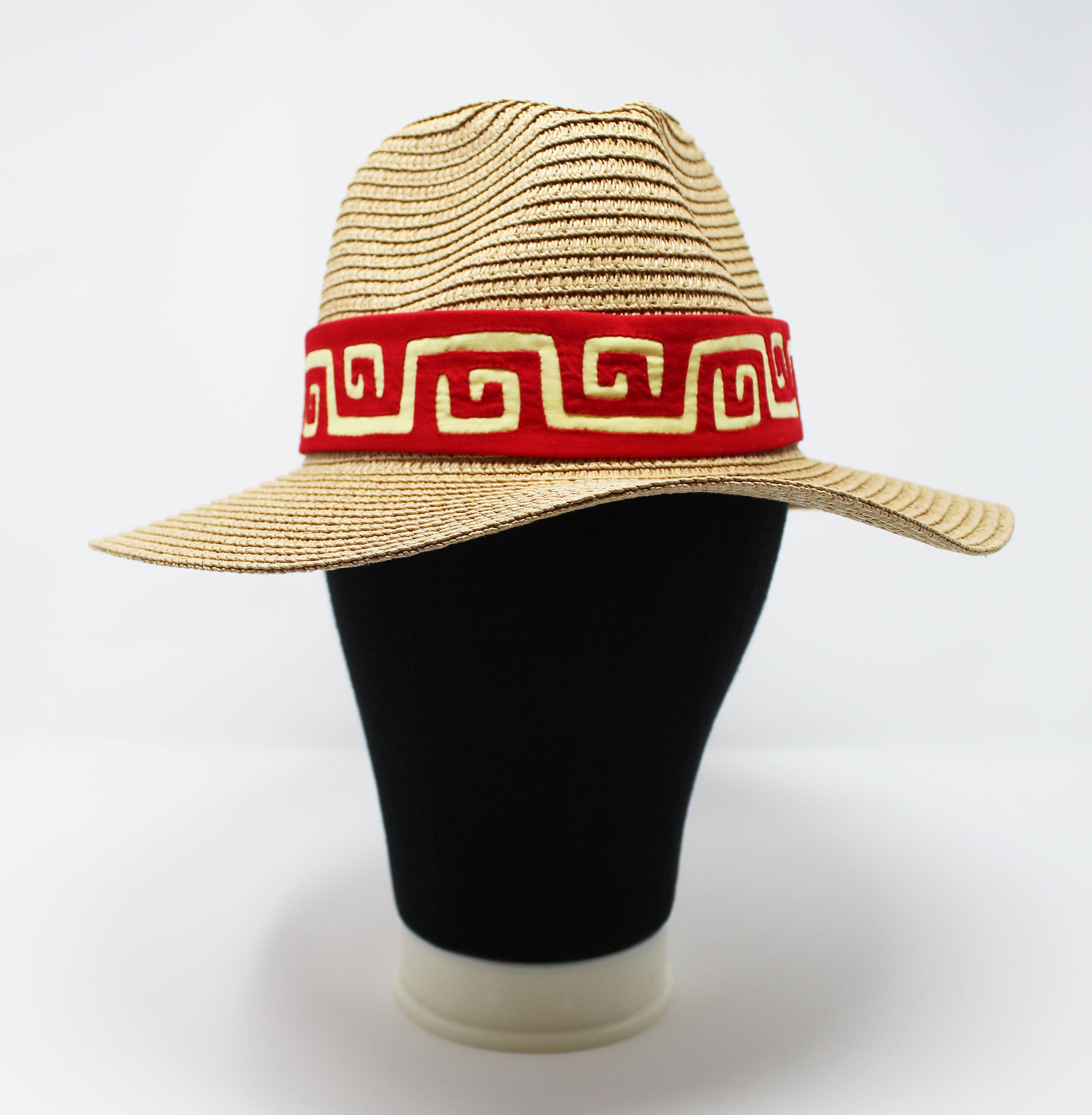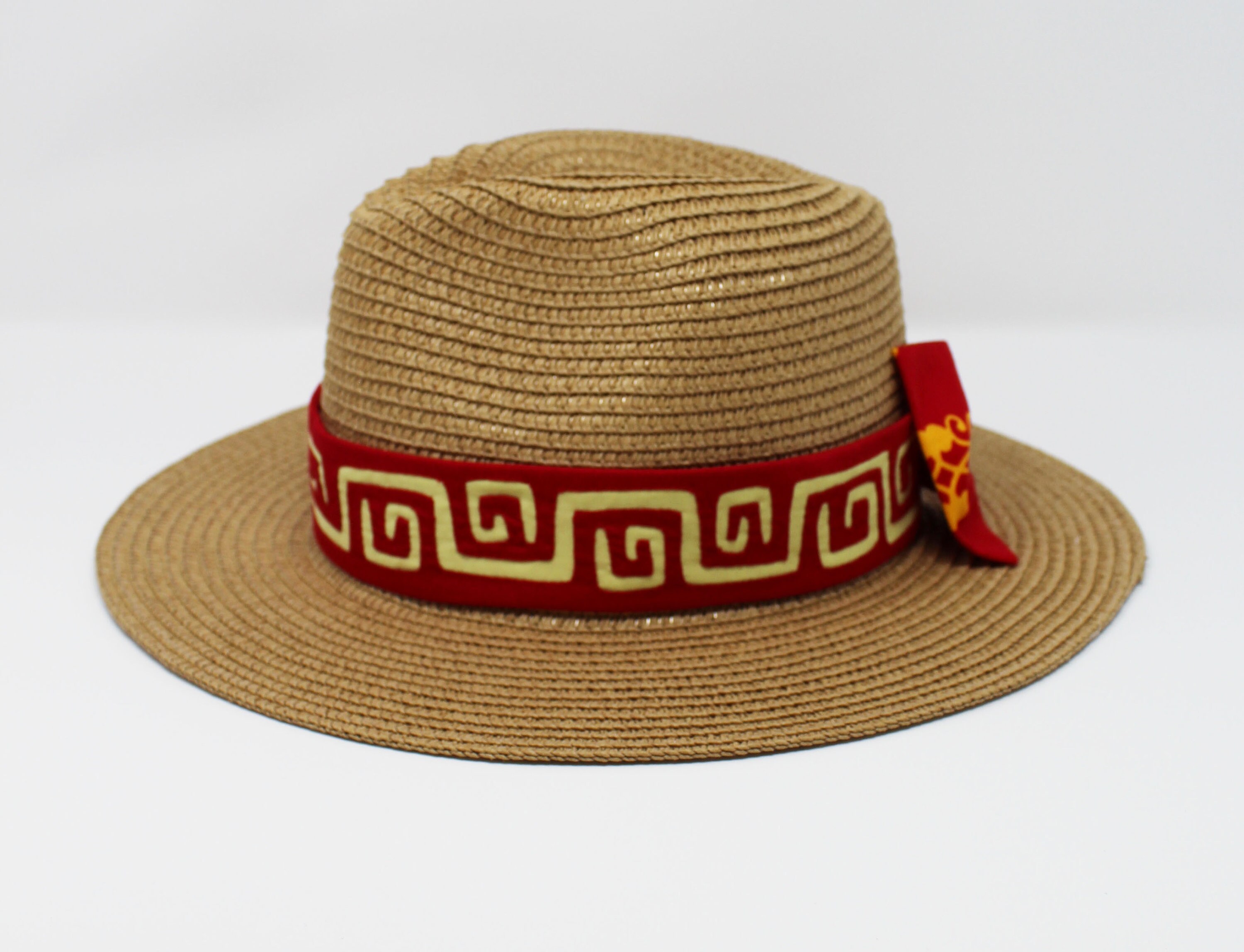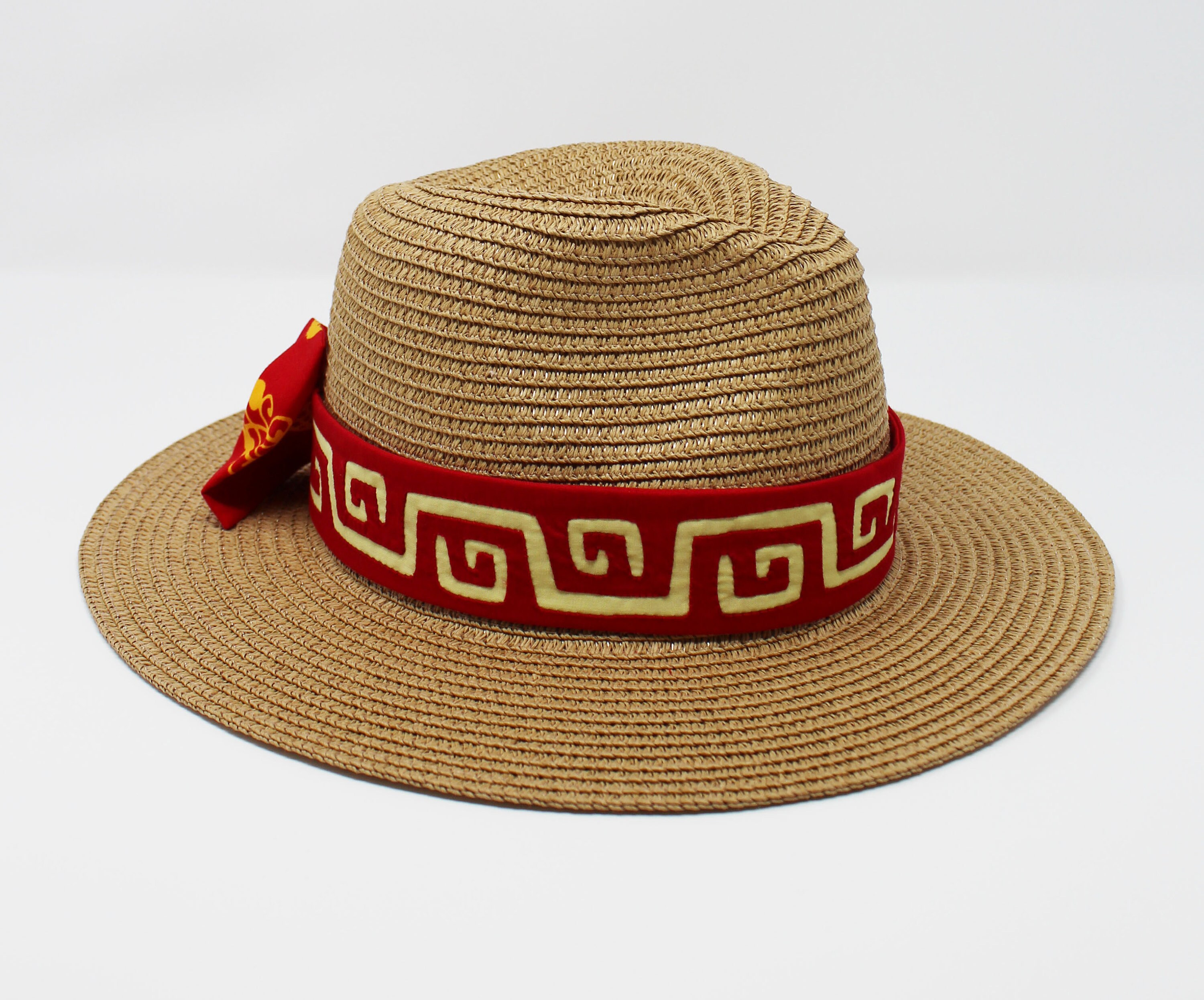 Tan straw hat that is trimmed with a lined, geometric mola strip and a musue bow.
