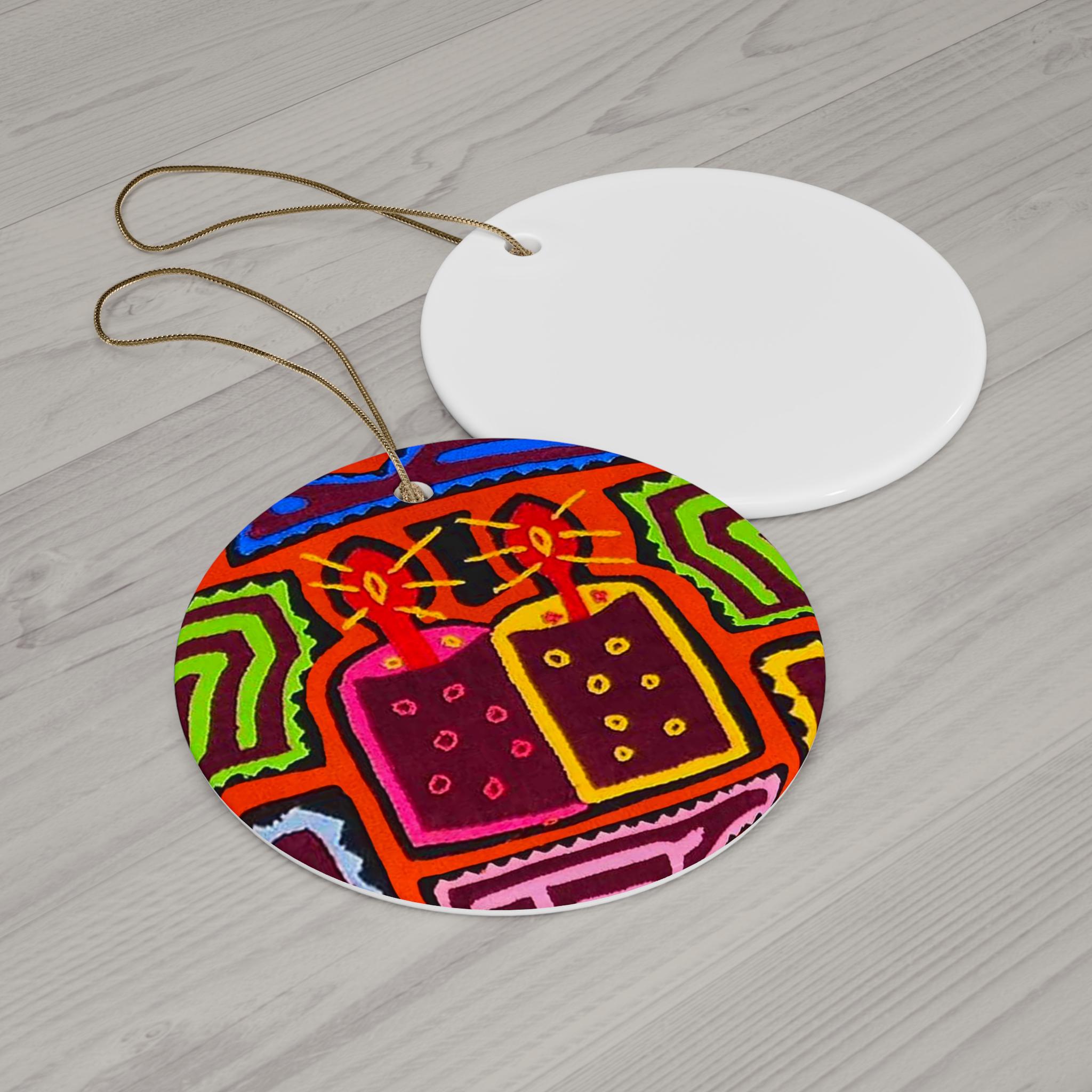 Panama mola Christmas candles ornament featuring vibrant colors and a glossy finish. Perfect for adding a touch of festive spirit to your holiday decor. Ideal for those who appreciate unique and colorful decorations for Christmas.