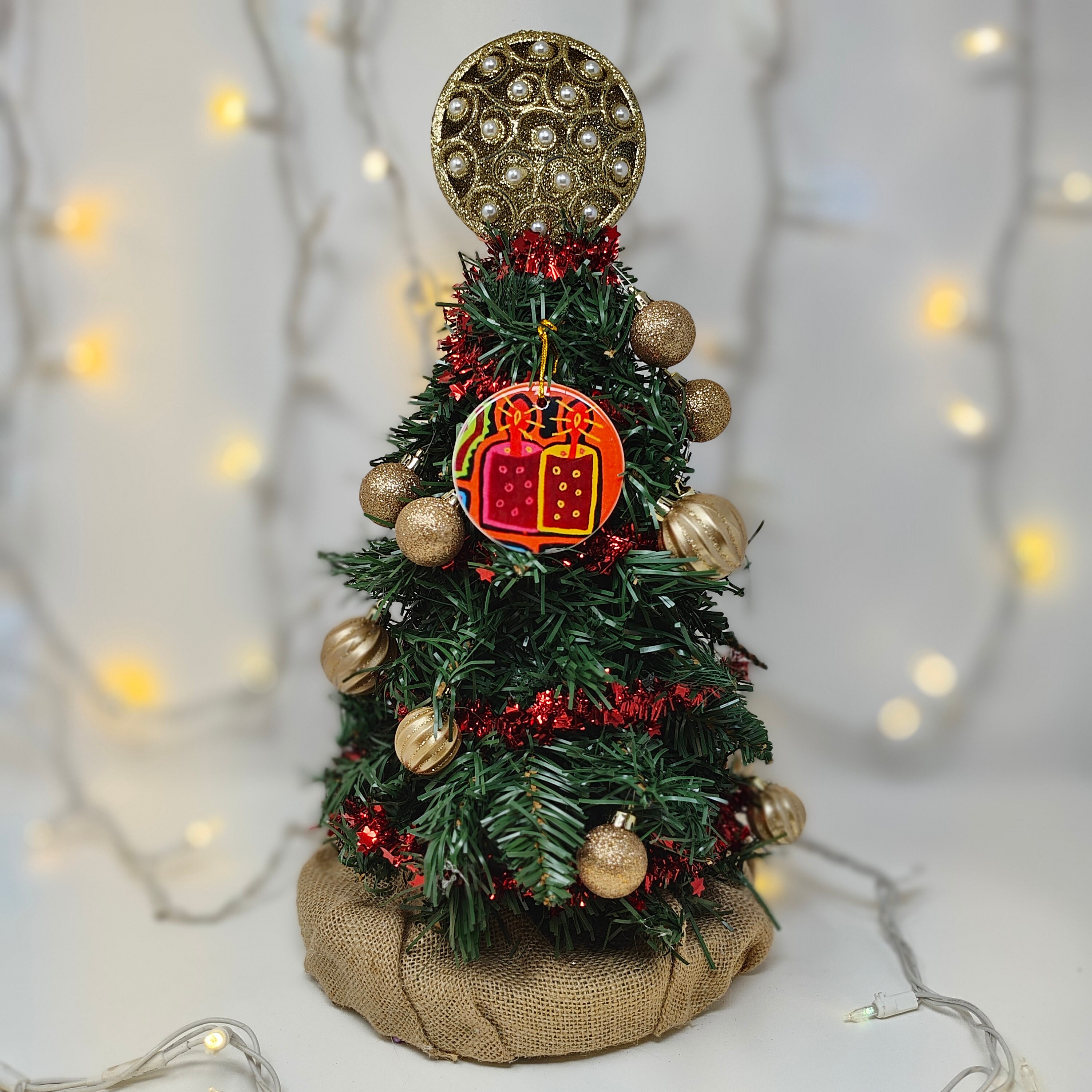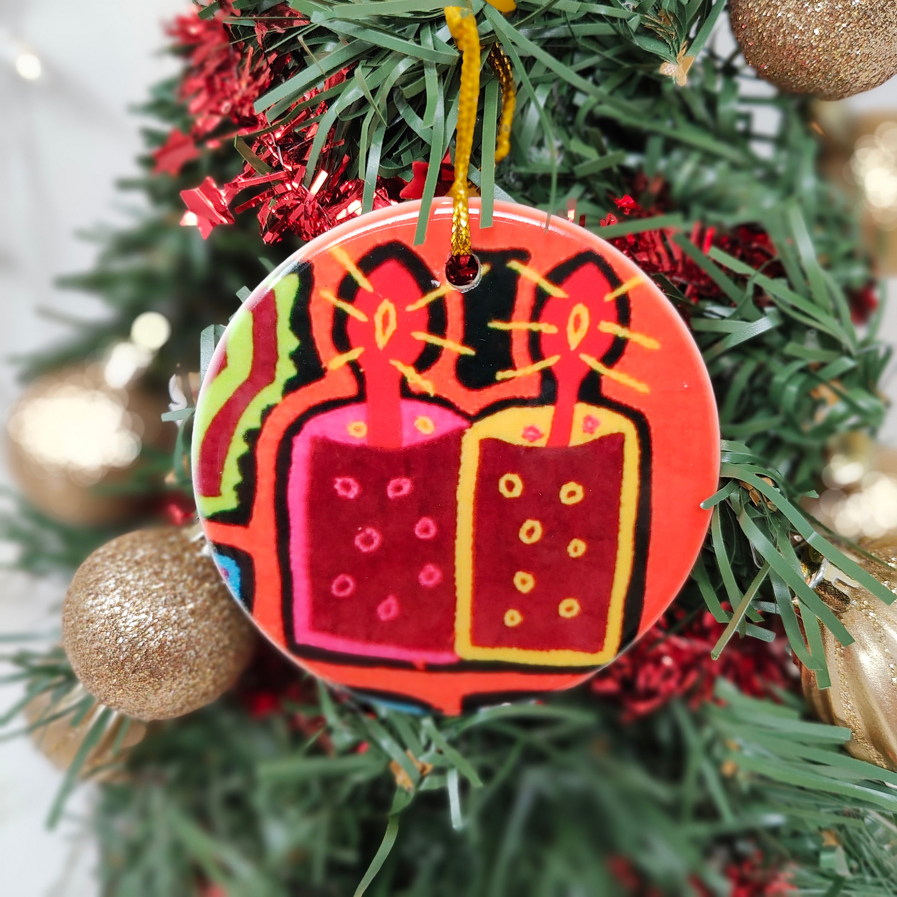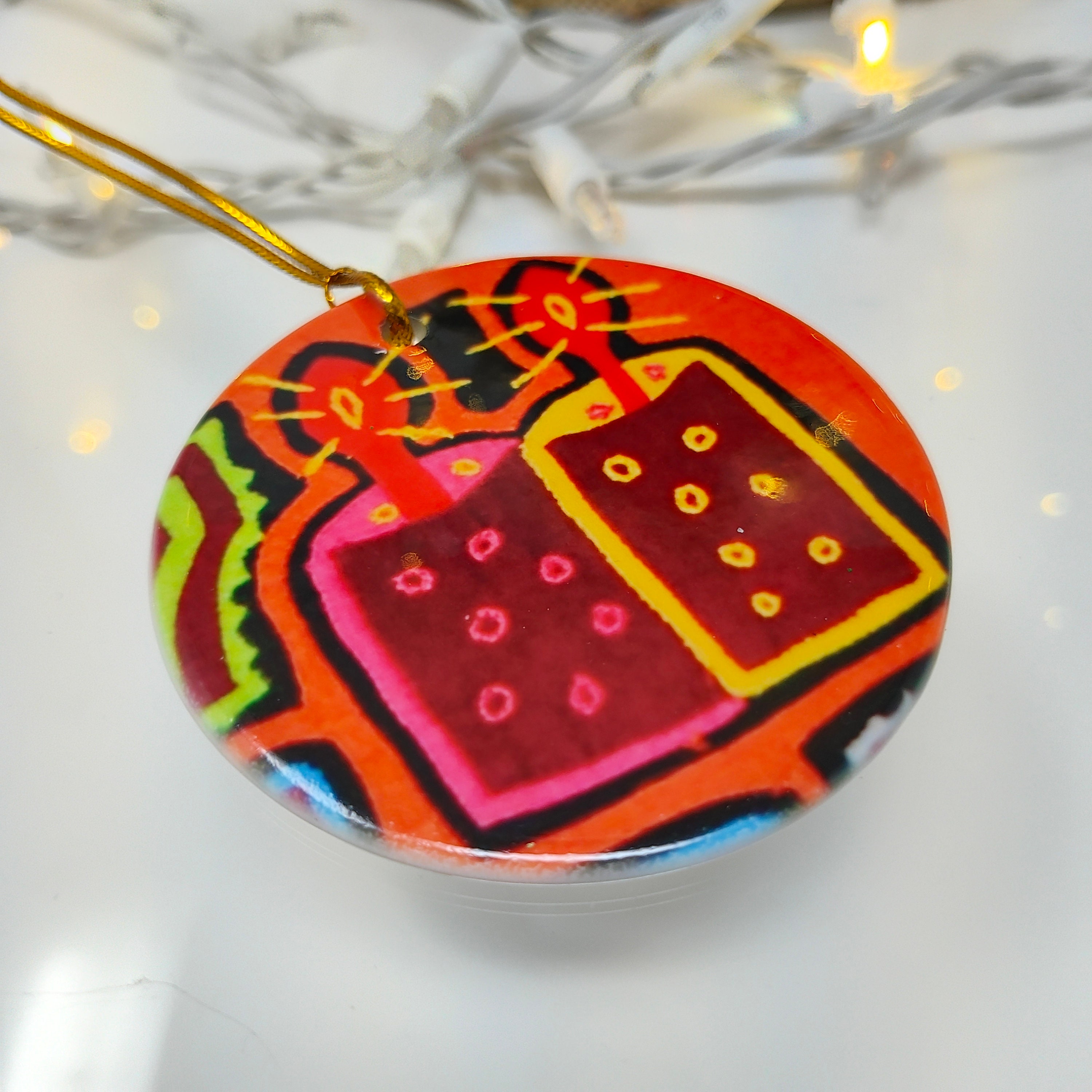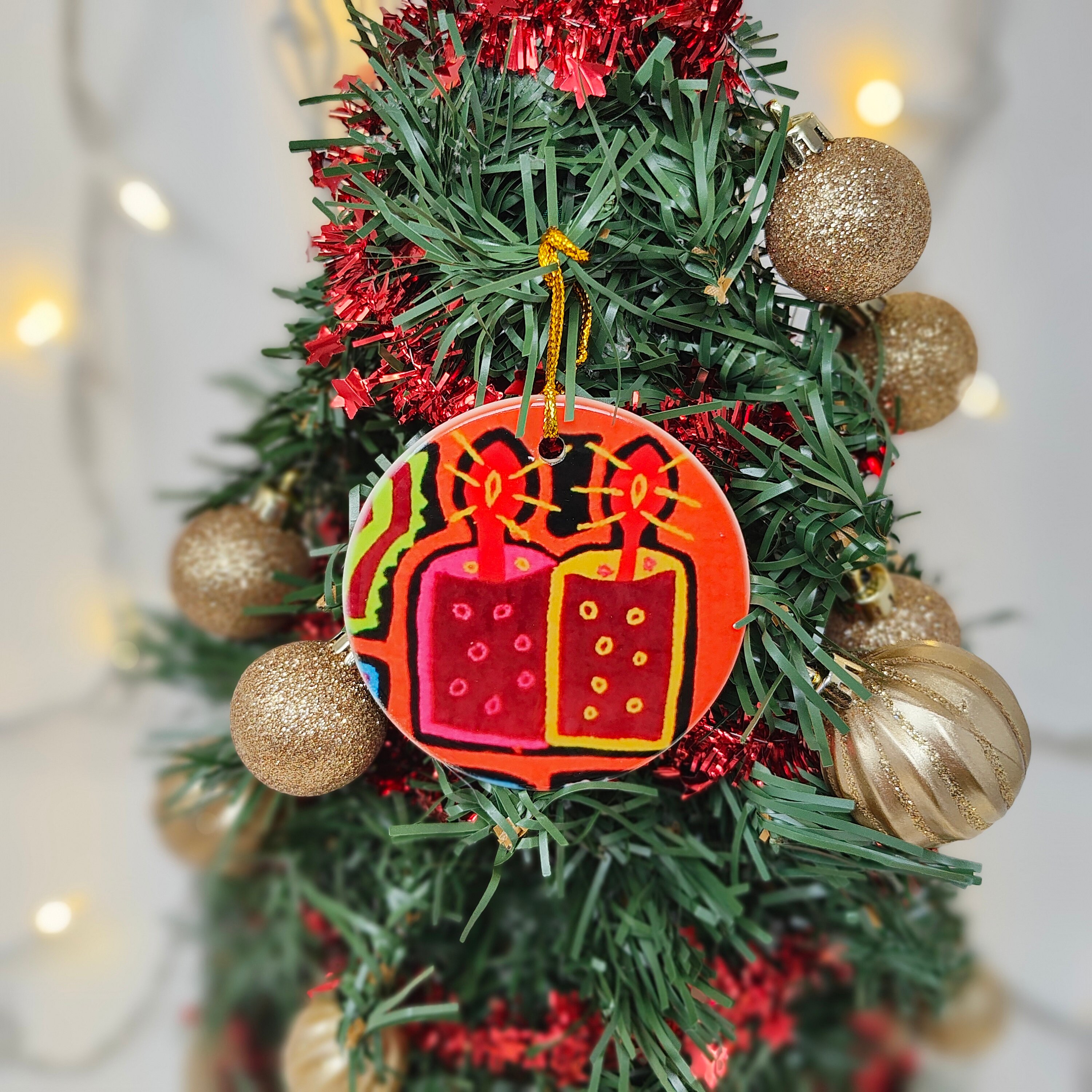 These custom-made Christmas ornaments can be the perfect heirloom to use year after year, generation after generation. It features a Christmas candle mola, the textile art from the Guna tribe of Panama.
