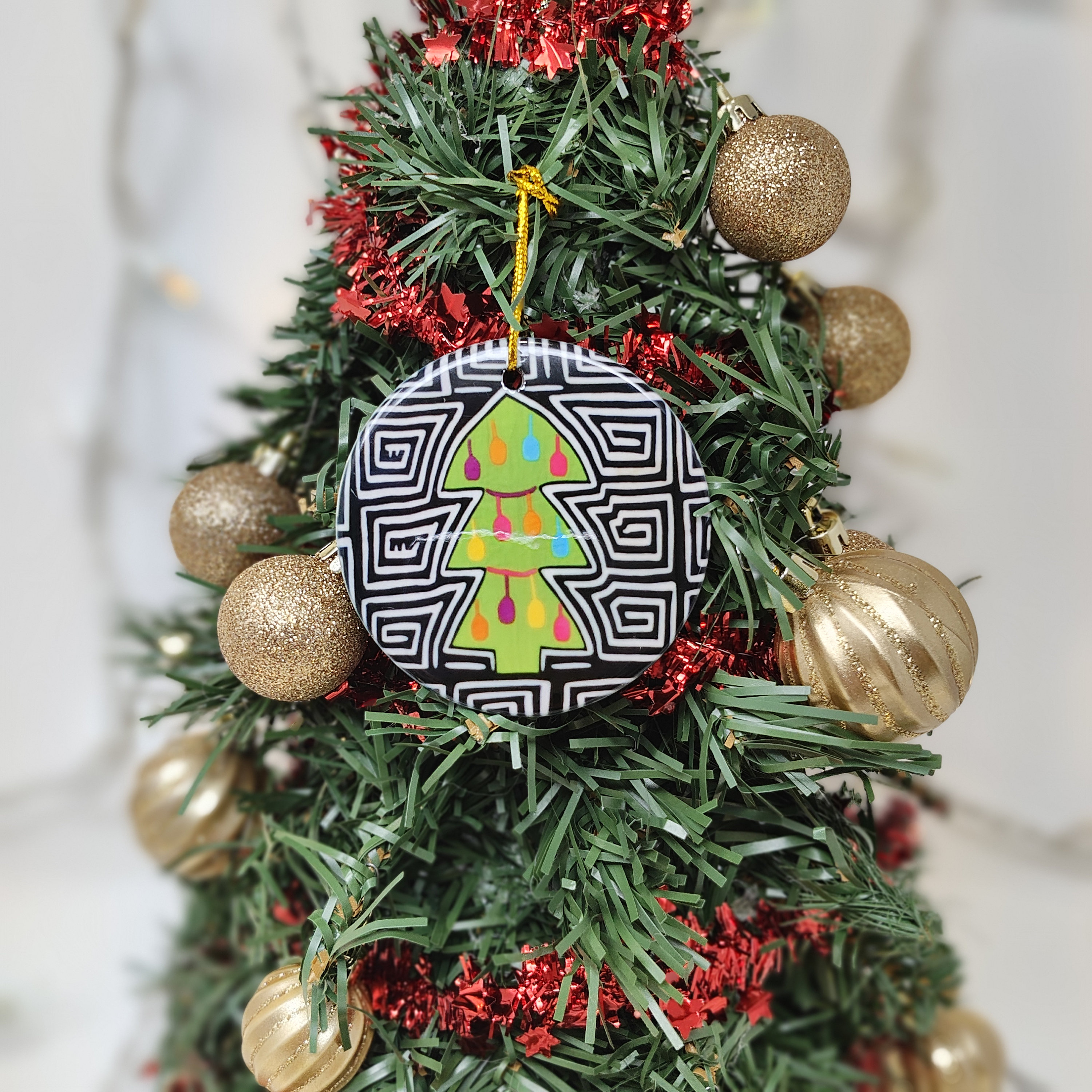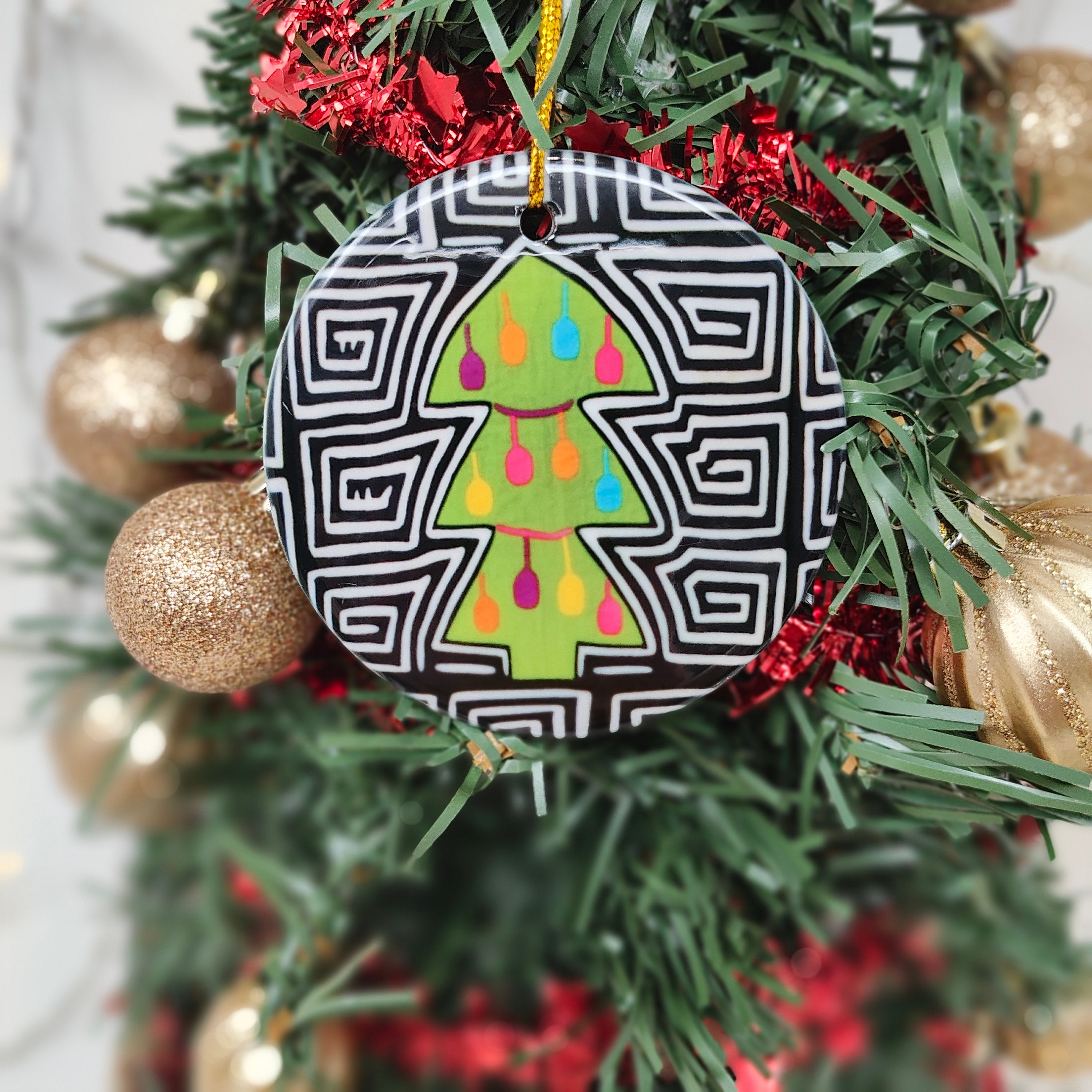 These custom-made Christmas ornaments can be the perfect heirloom to use year after year, generation after generation. It features a Christmas tree mola, the textile art from the Guna tribe of Panama.
