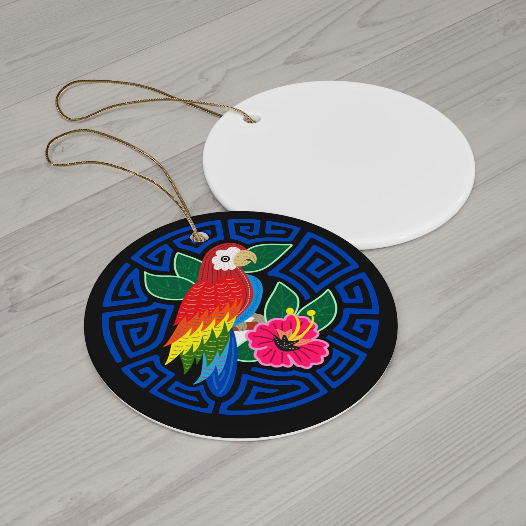 Bright, glossy ceramic ornament featuring a bold parrot and hibiscus set against a geometric blue maze. The strong colors pop on the smooth, one-piece ceramic surface and the gold-toned hanging string adds a touch of warmth. Lightweight yet sturdy at 3mm thick, this single-sided ornament brings a lively, tropical accent to a tree, window, or wall hook. Hang it among other keepsakes to spark conversation and a little island daydream every time you pass by.
