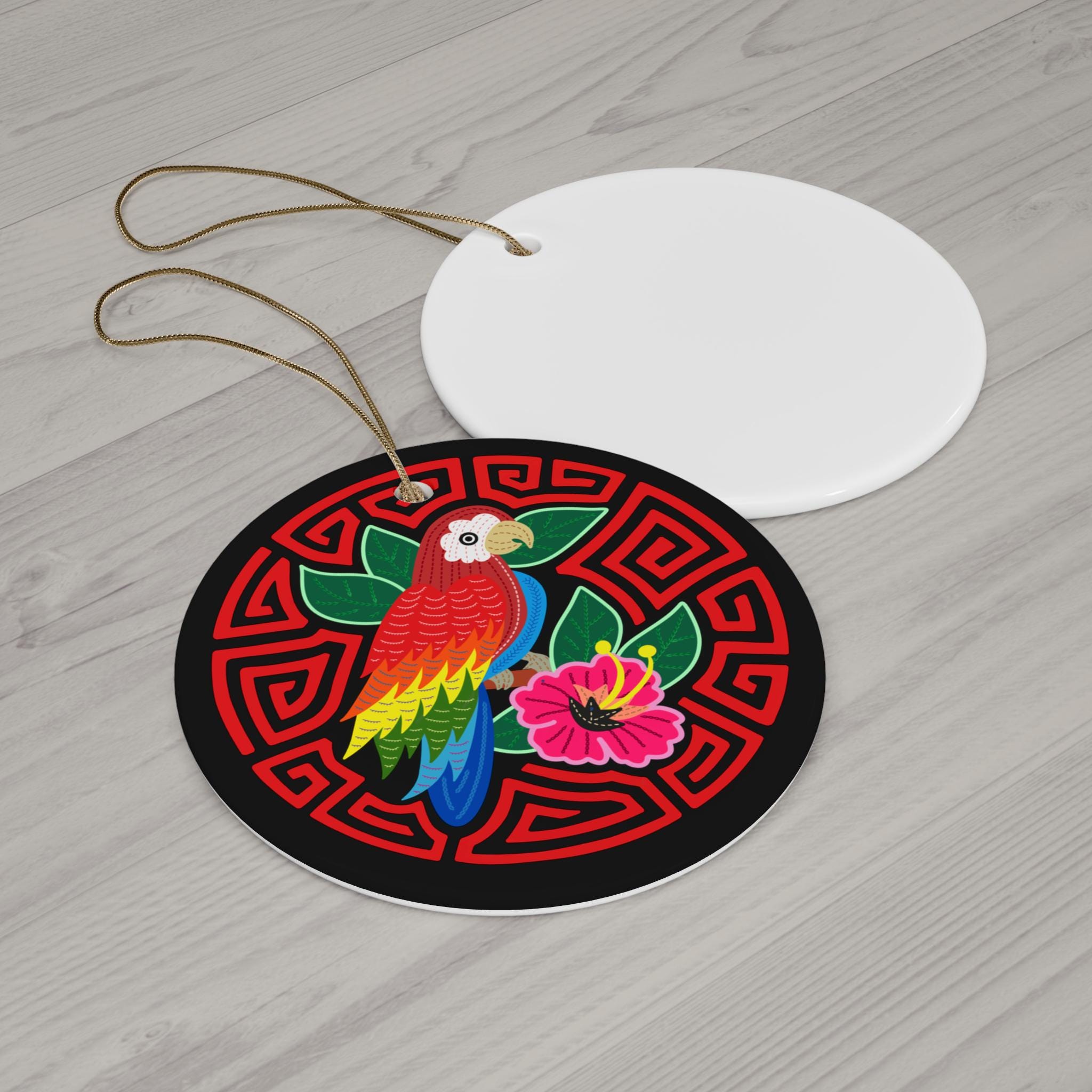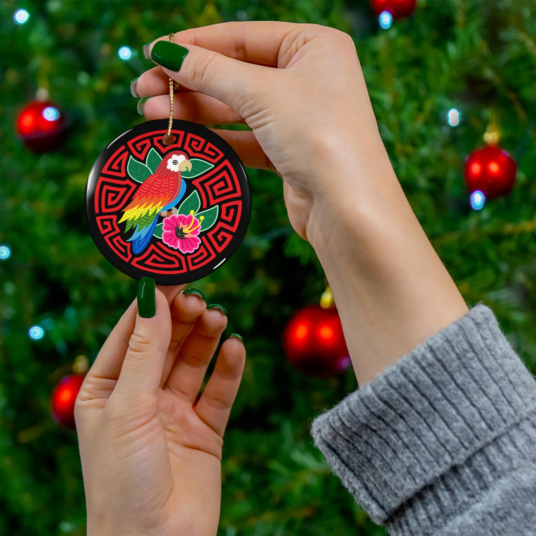 A bright, lively ceramic ornament that brings a splash of tropical color to holiday trees, windows, or wall hooks. The glossy, one-sided print showcases a vivid parrot and hibiscus set against a bold red geometric background, finished with a gold-toned hanging string. Lightweight but sturdy, the solid one-piece ceramic holds its shine through seasons and celebrations, making it an energetic accent for seasonal decorating or year-round displays.