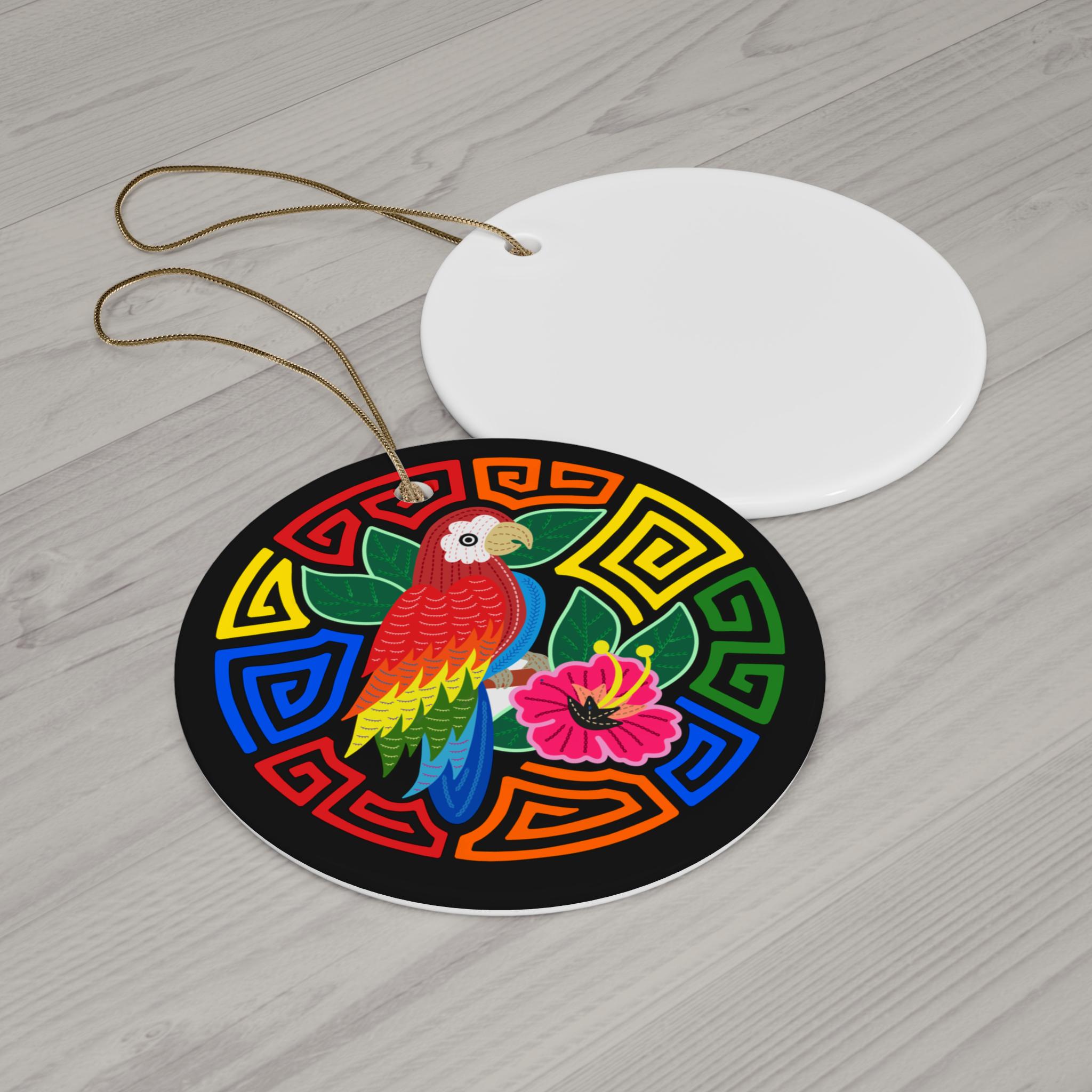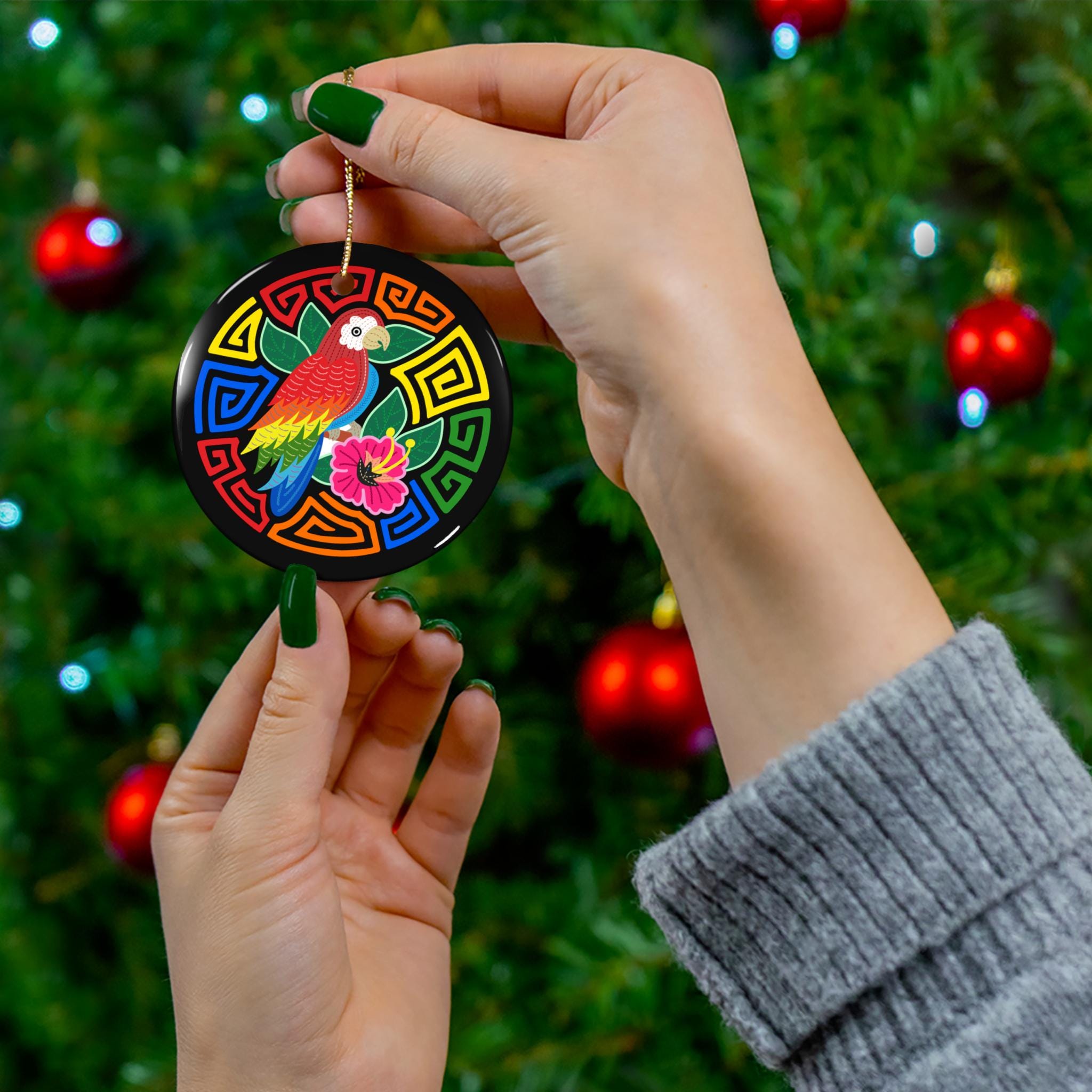 Bright, ceramic holiday ornament featuring a colorful parrot and tropical motif rendered in crisp, glossy detail. The one-sided print pops against a deep black background framed by bold geometric accents in rainbow hues. It hangs from a gold-toned string and brings a playful, sunlit energy to a tree, wreath, or a window nook. Lightweight yet solid, the durable ceramic surface keeps colors vivid year after year, adding a splash of island charm to winter gatherings or everyday decor.