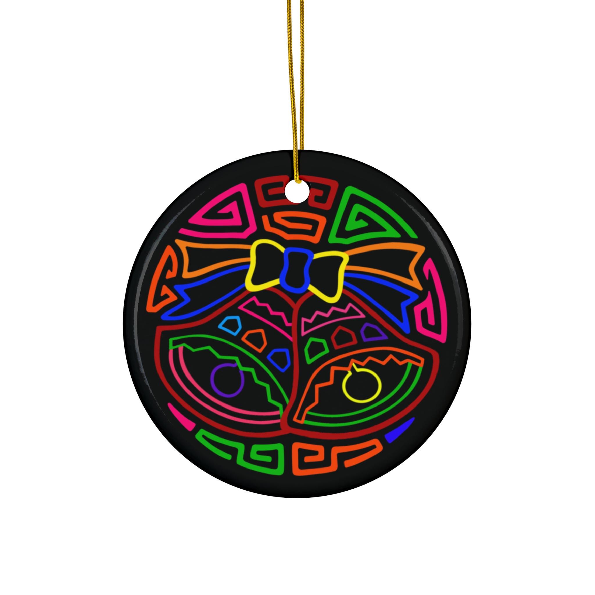 Bright, glossy ceramic ornament that brings a playful charm to holiday trees, windows, or cozy corners. The single-sided print shows a bold, colorful mola bell motif outlined in vivid, saturated hues against a deep black background, so the design really pops. Lightweight yet sturdy 3mm ceramic with a gold-toned hanging string makes it easy to display. Each ornament arrives as a single piece, ready to hang and brighten a room or stocking with joyful color.