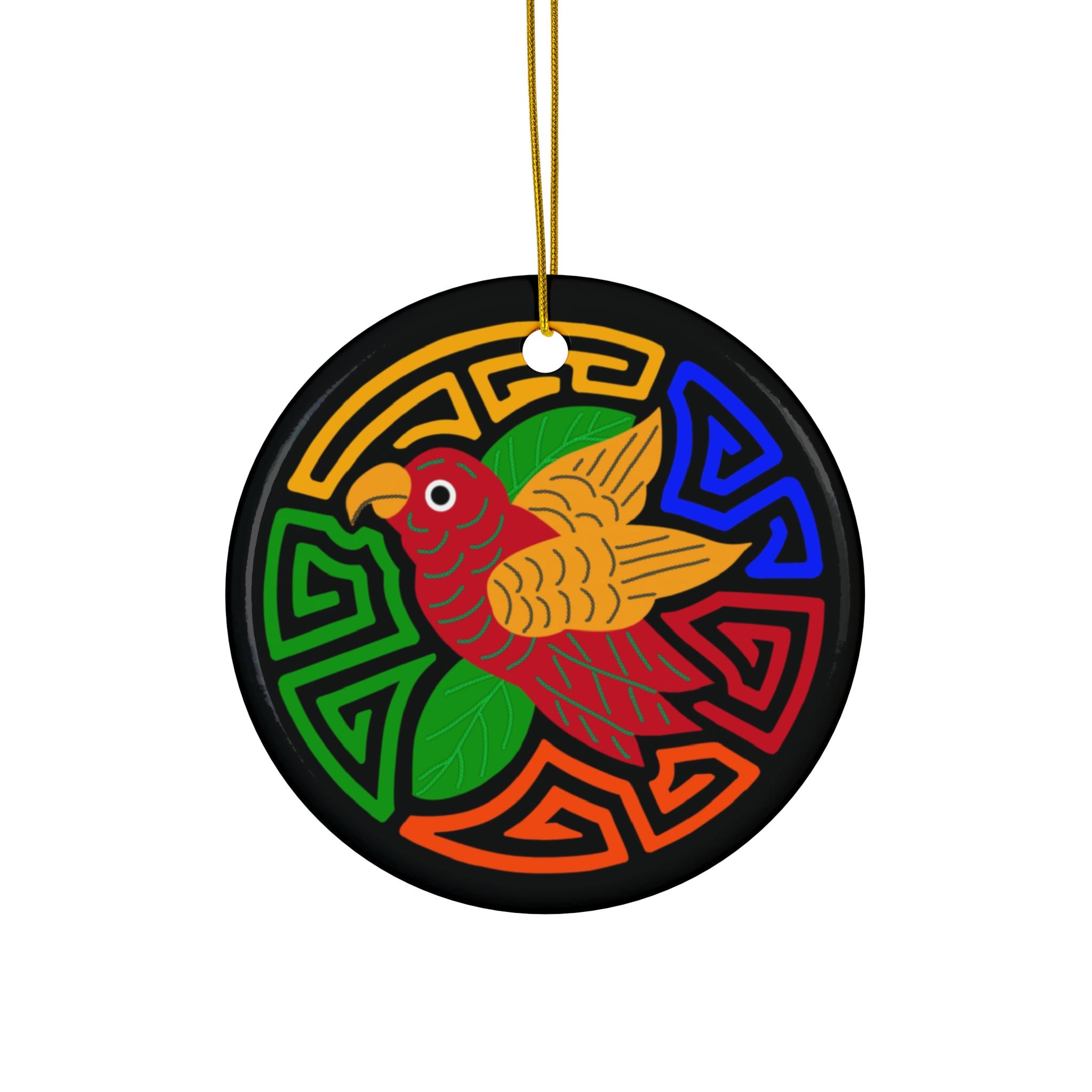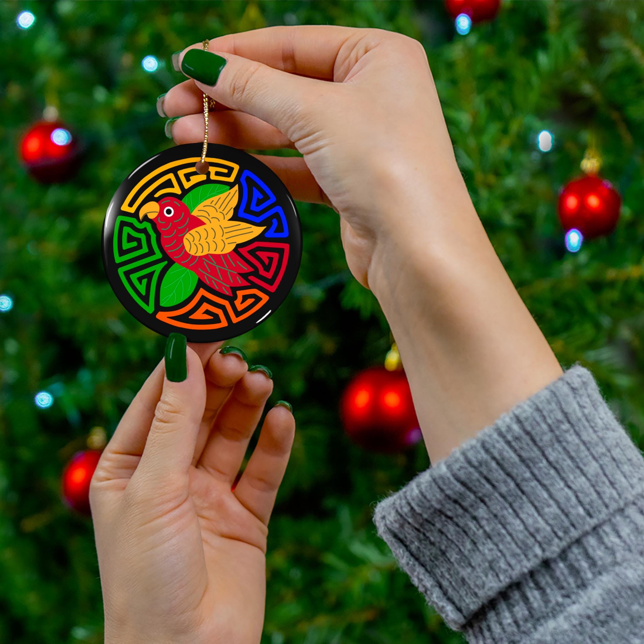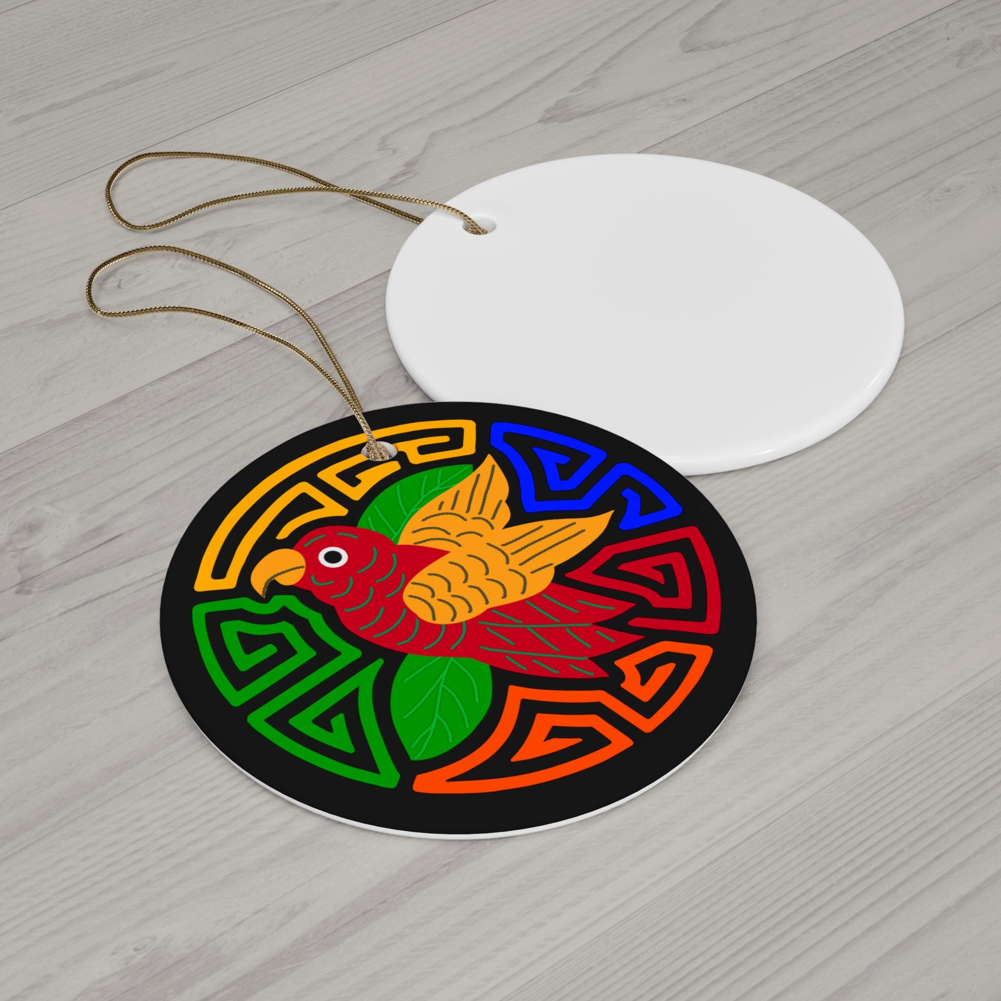 Bright, glossy ceramic ornament that brings a splash of color and handcrafted charm to holiday trees, windows, or small wall displays. The one-sided print shows a bold, stylized bird set against a vivid geometric background in rich primary hues. Lightweight yet sturdy at 3mm thick, each ornament arrives ready to hang with a gold-toned string threaded through a pre-drilled hole. The shiny finish makes colors pop and gives a festive, polished look that fits both modern and folk-inspired spaces.