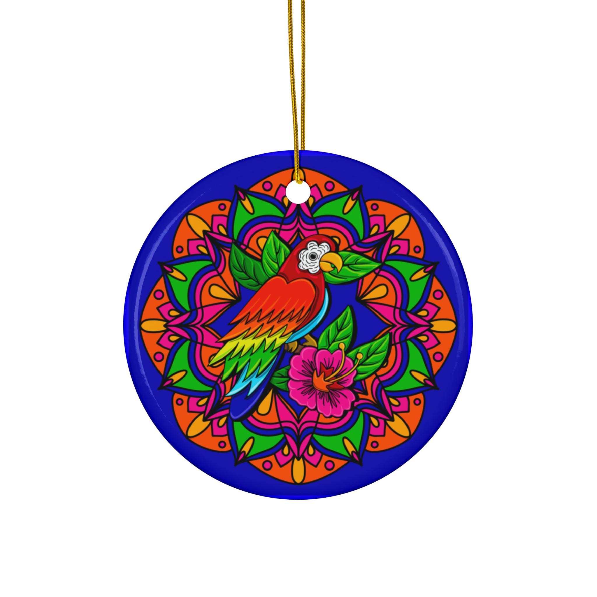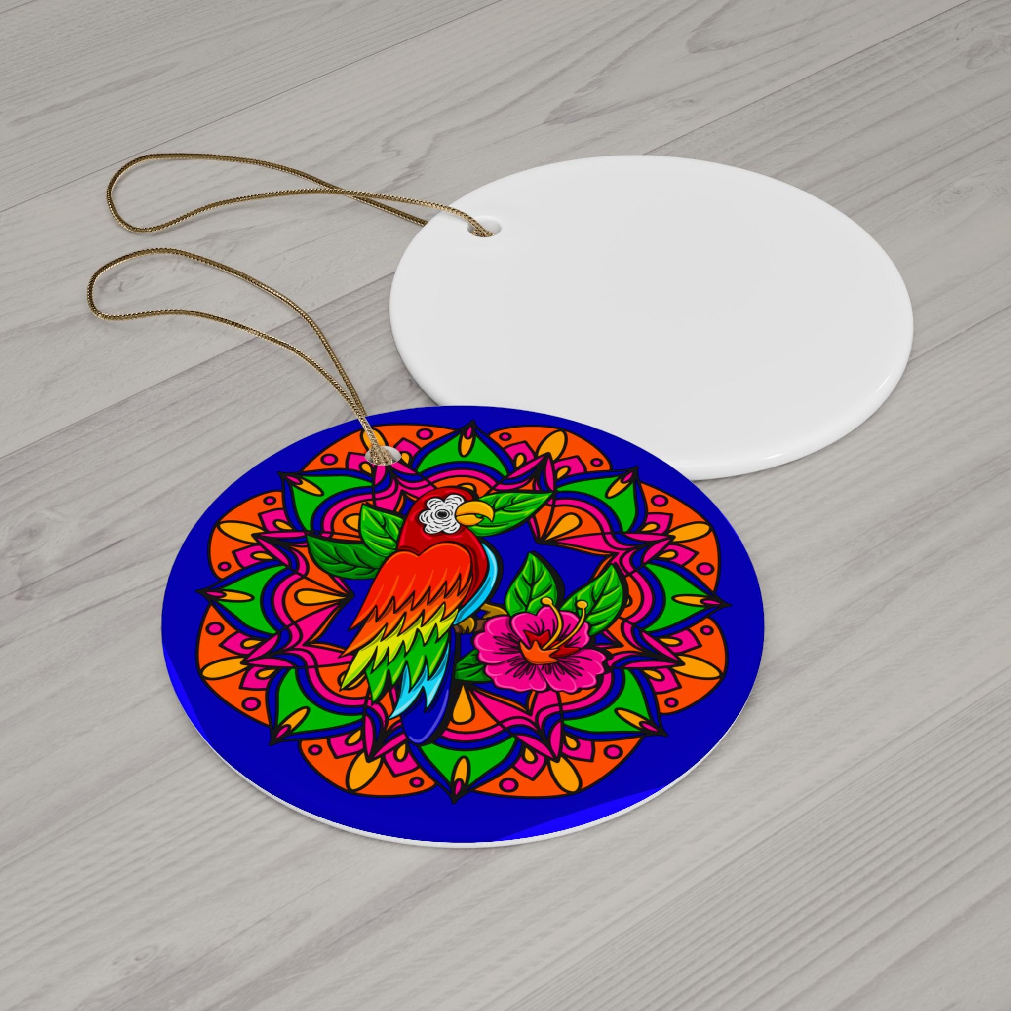 Bright, glossy ceramic ornament that brings a pop of color and joyful energy to holiday trees, windows, or anywhere that could use a cheerful accent. The one-sided print features a vibrant tropical parrot set against a bold mandala of saturated blues, pinks, oranges, and greens. Lightweight yet sturdy 3mm ceramic sits flush with a glossy finish that amplifies the artwork’s contrast and detail. A pre-drilled hole and gold-toned hanging string are included so the ornament arrives ready to display. Each pack contains a single ornament.