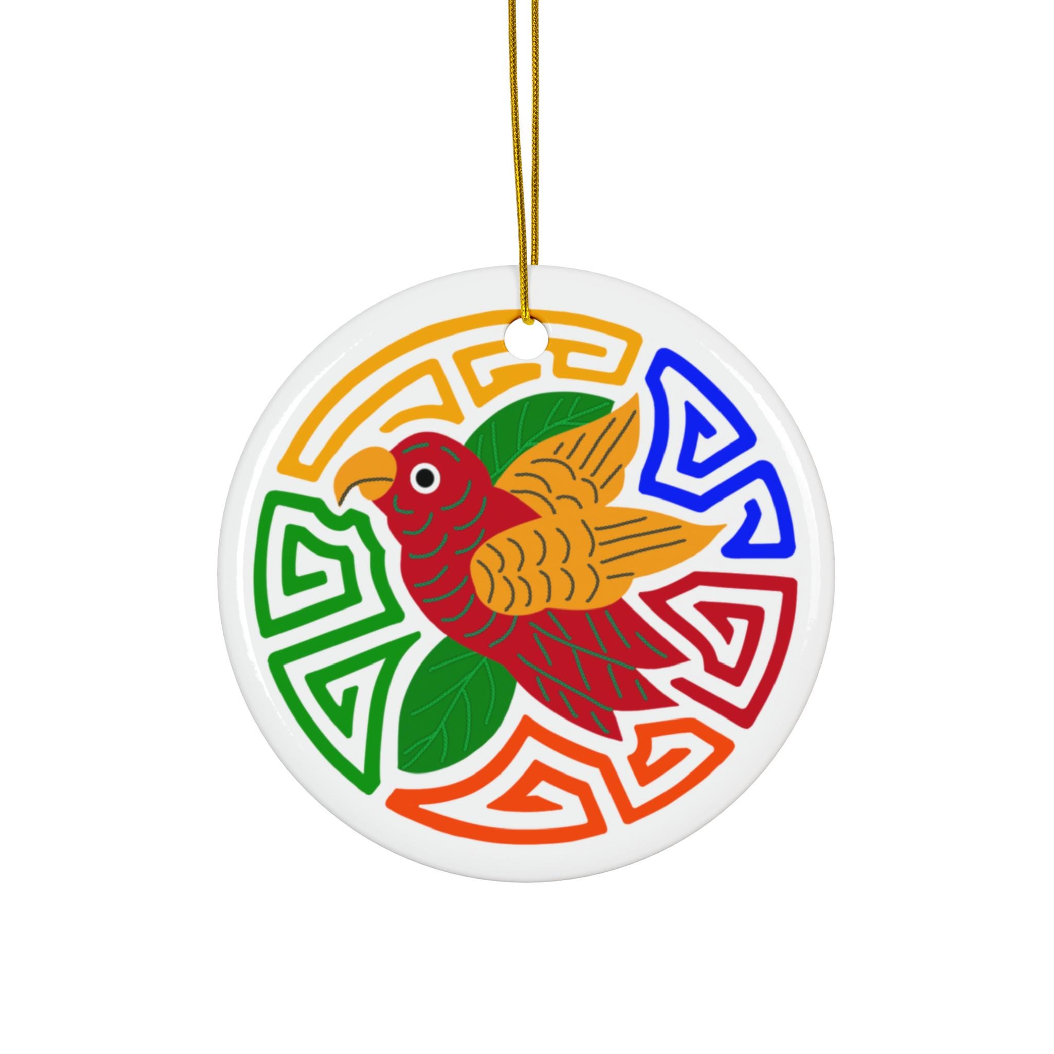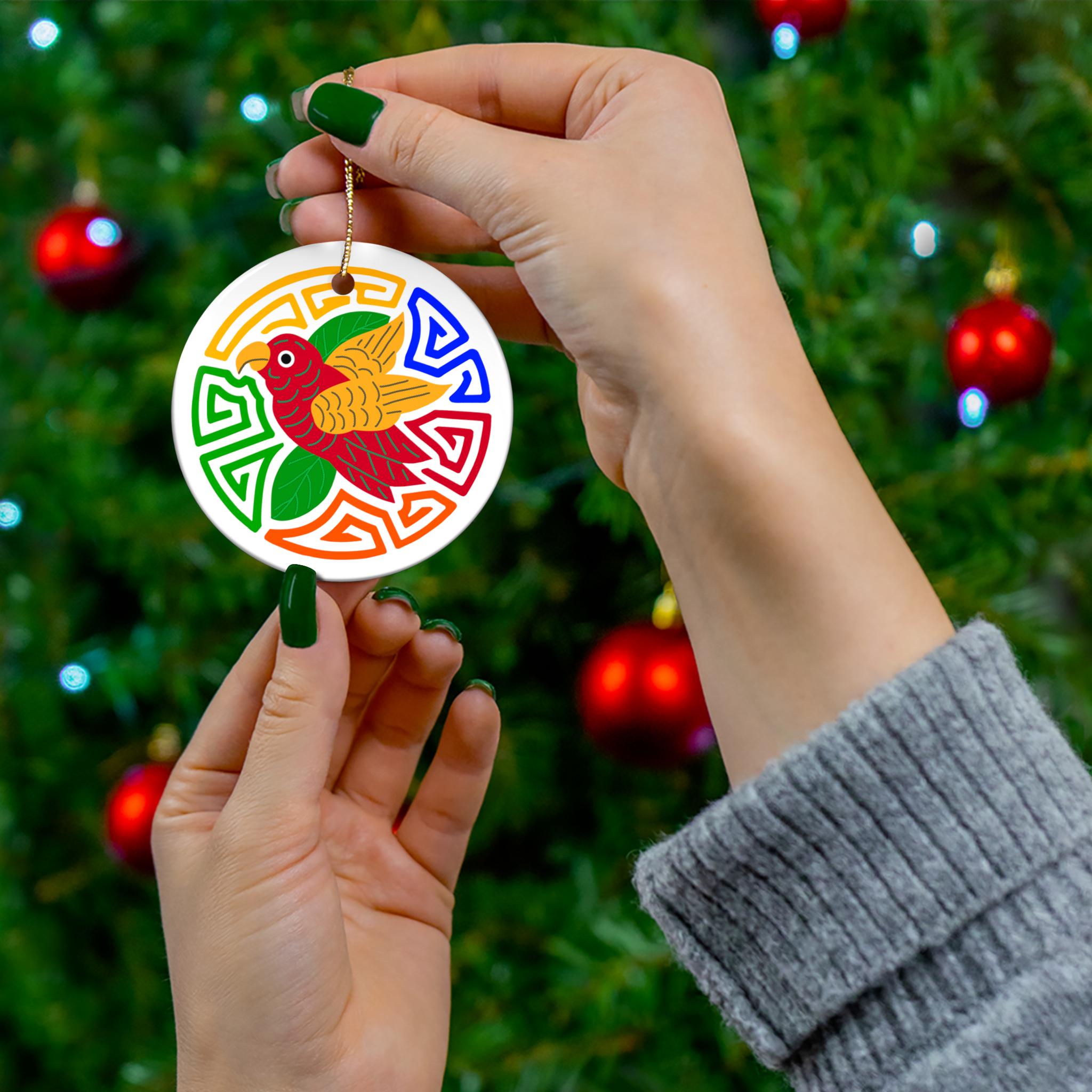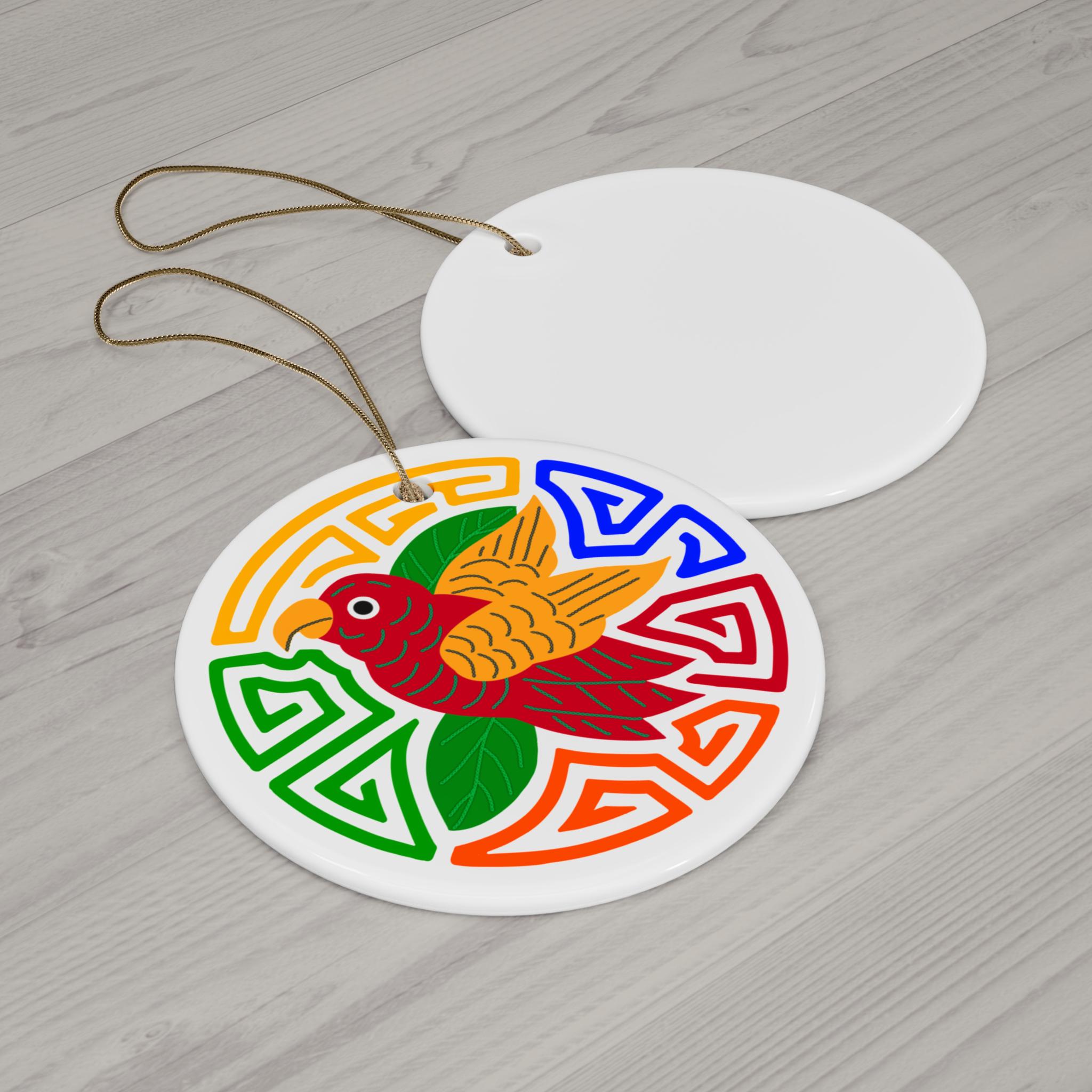 Bring a burst of color and joyful symbolism to your space with this glossy ceramic ornament. The one-sided design features a vibrant parrot motif set within a lively geometric wreath—bright reds, greens, blues and oranges pop against the pristine white ceramic. Lightweight yet solid, the ornament comes with a gold-toned hanging string threaded through a pre-drilled hole, ready to hang on a tree, wall hook, or window. Each piece is printed with crisp, saturated inks and sealed with a glossy finish that catches light and attention. These single-piece ceramic ornaments feel substantial in the hand and keep their color and shine season after season.
