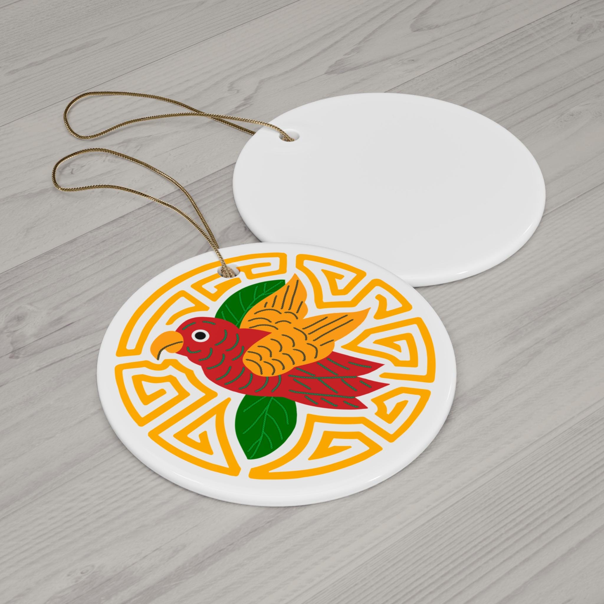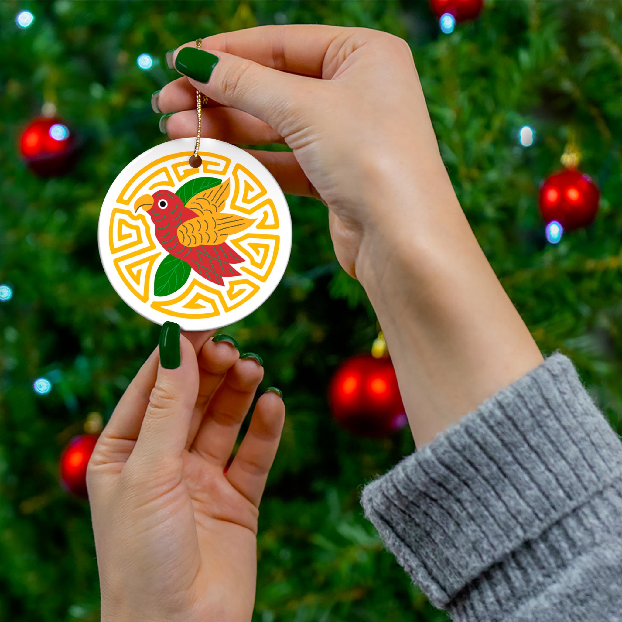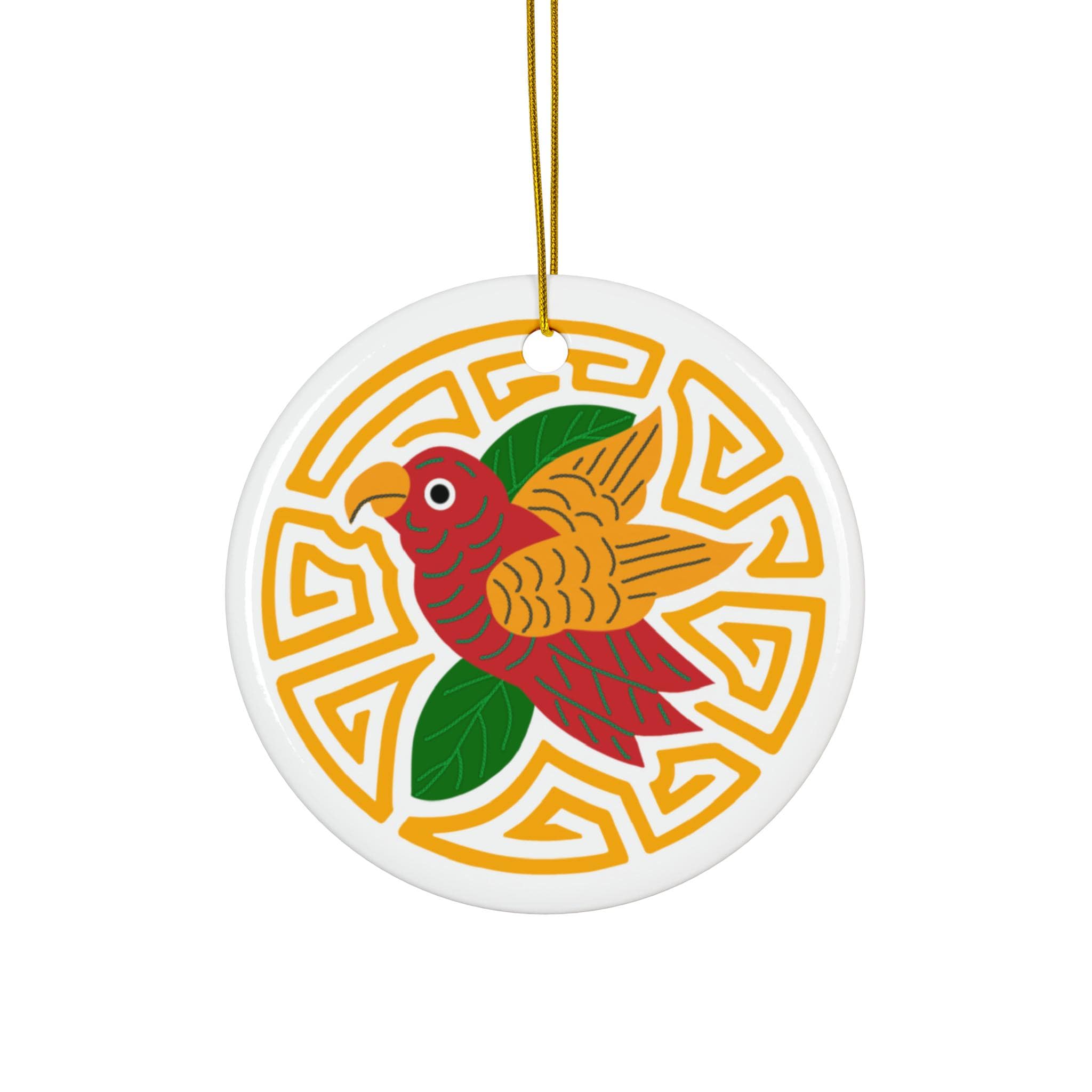 Bright, ceramic holiday ornaments that bring a playful burst of color to any space. Each glossy, 3mm thick ornament features a single-sided, high-definition print—here showcasing a bold, stylized bird with rich reds, golds, and green leaves set against a warm geometric background. A pre-drilled hole and included gold-toned hanging string make it easy to display on trees, wreaths, or as year-round wall accents. The solid one-piece construction holds up to handling and keeps the print crisp and vibrant through seasons. Sold individually and available in four shapes so you can mix-and-match a cheerful collection.