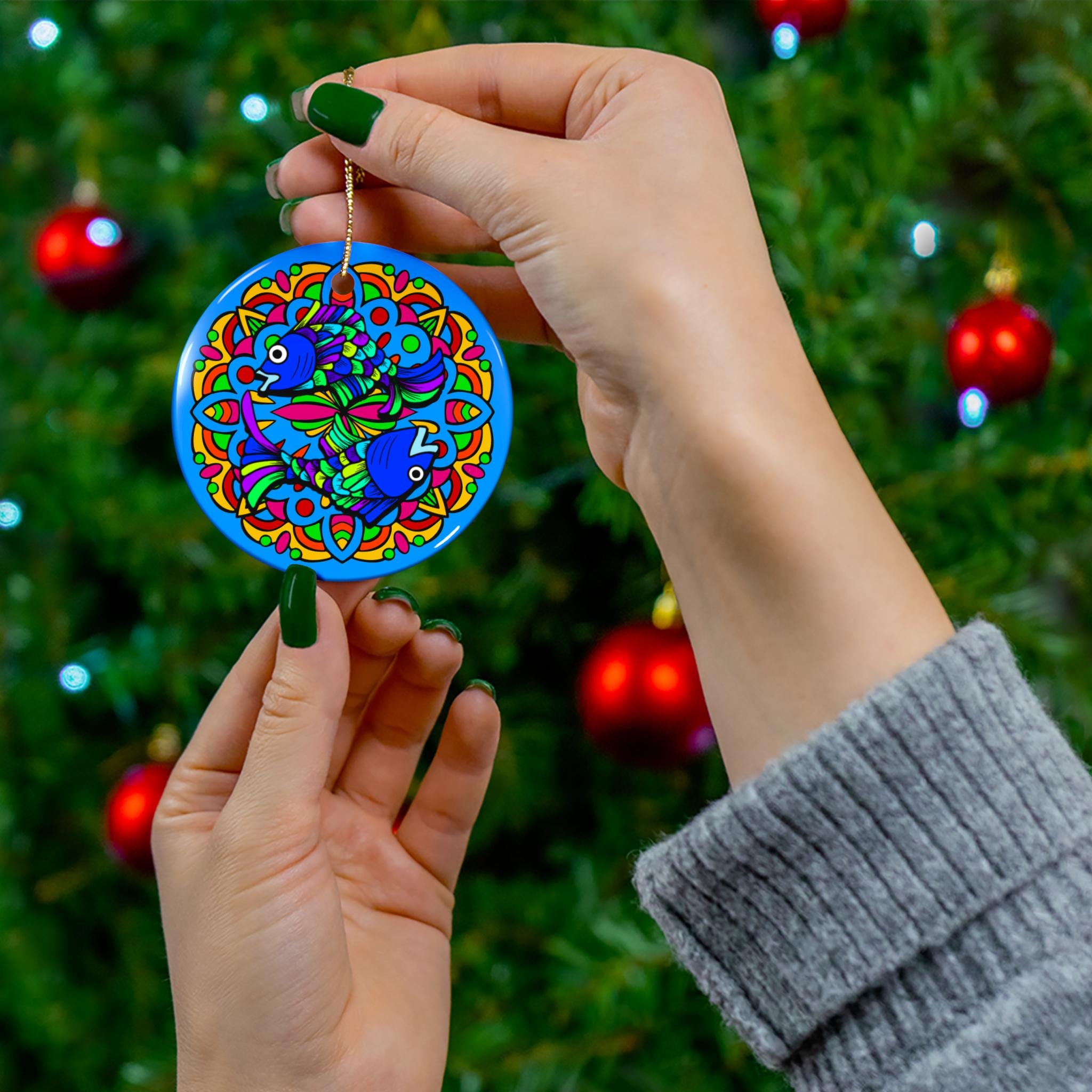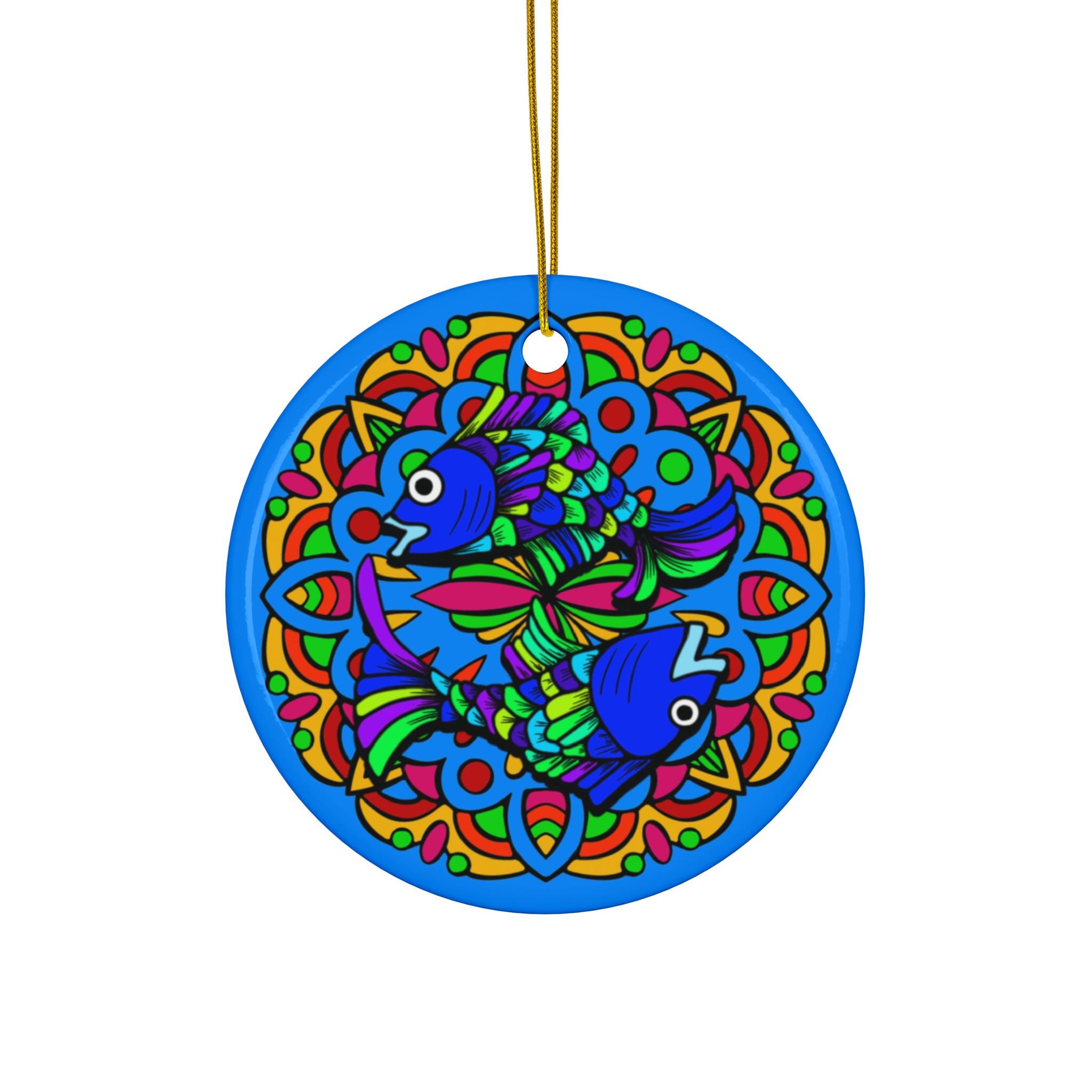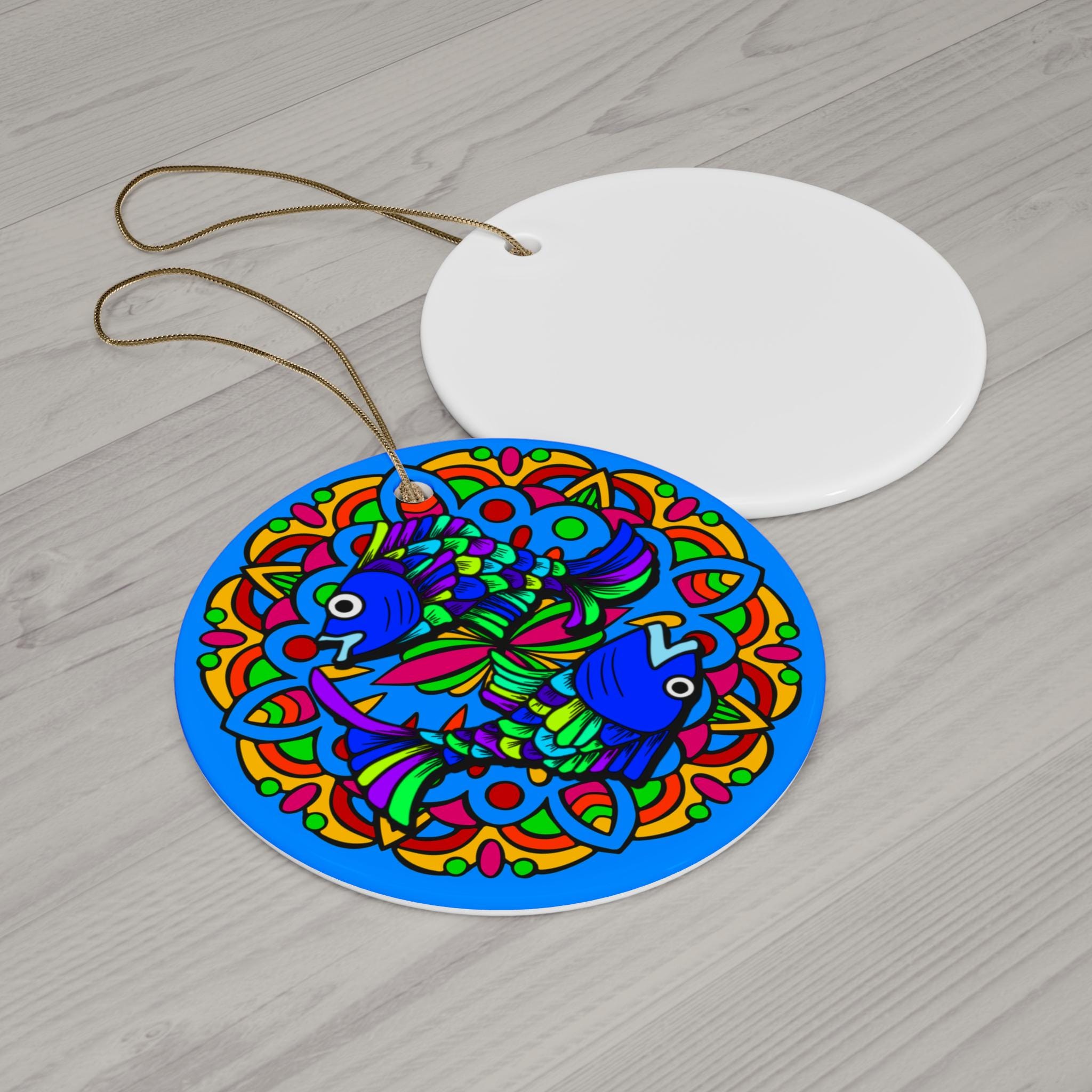 Hand-painted color and joyful symmetry meet everyday cheer in this ceramic ornament. Bright blues, greens and warm accent hues form a playful mandala-like fish motif that catches the eye from across a room. Lightweight yet solid, the glossy one-sided print sits on a durable 3mm ceramic disc with a neat hole and gold-toned string ready to hang. It adds a splash of color to a tree, window, or wall and brings a little handcrafted energy to holiday gatherings, housewarmings, or seasonal decorating rituals.
