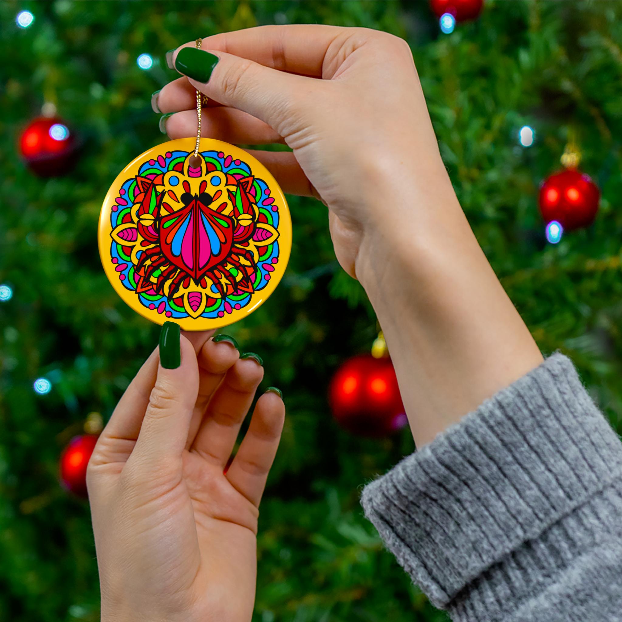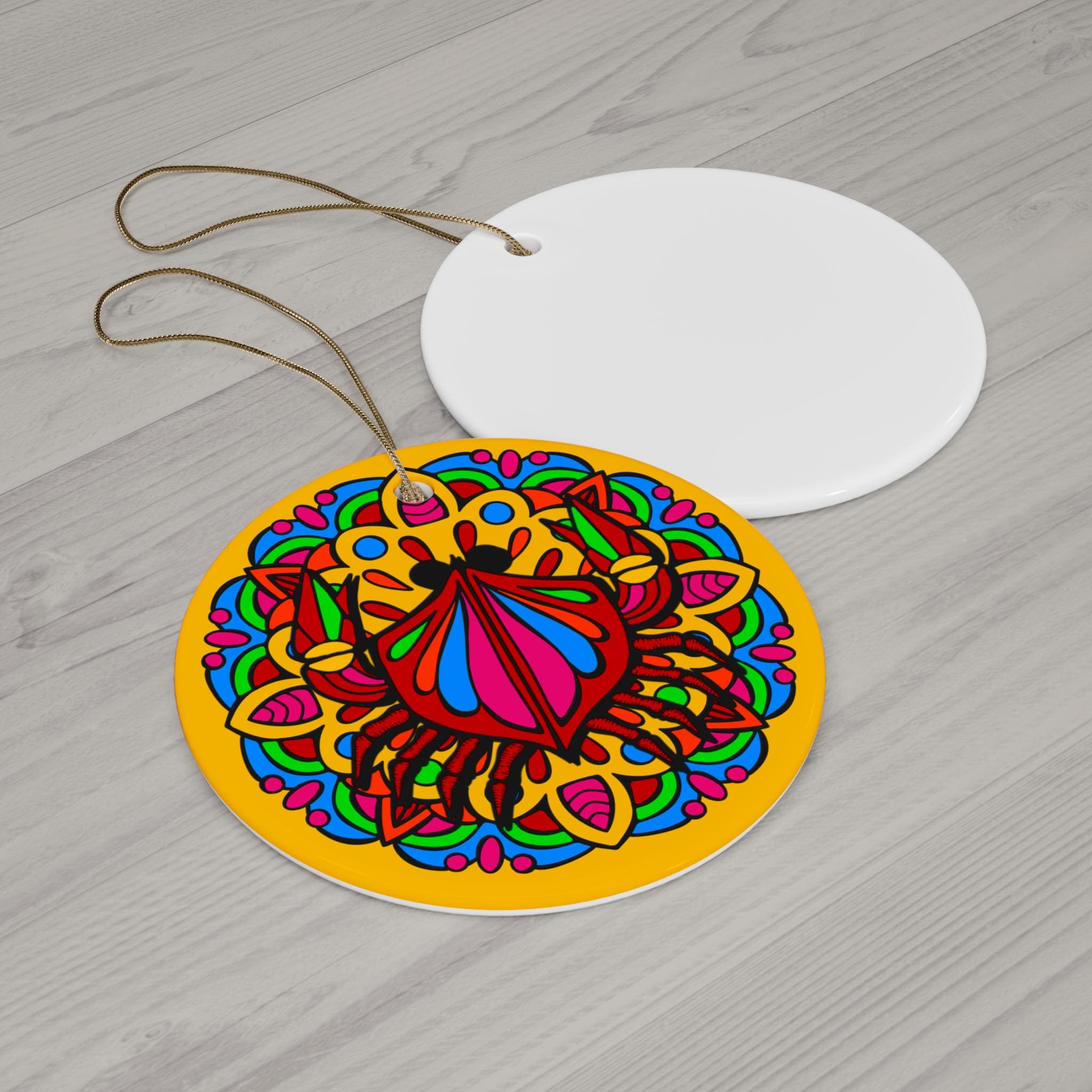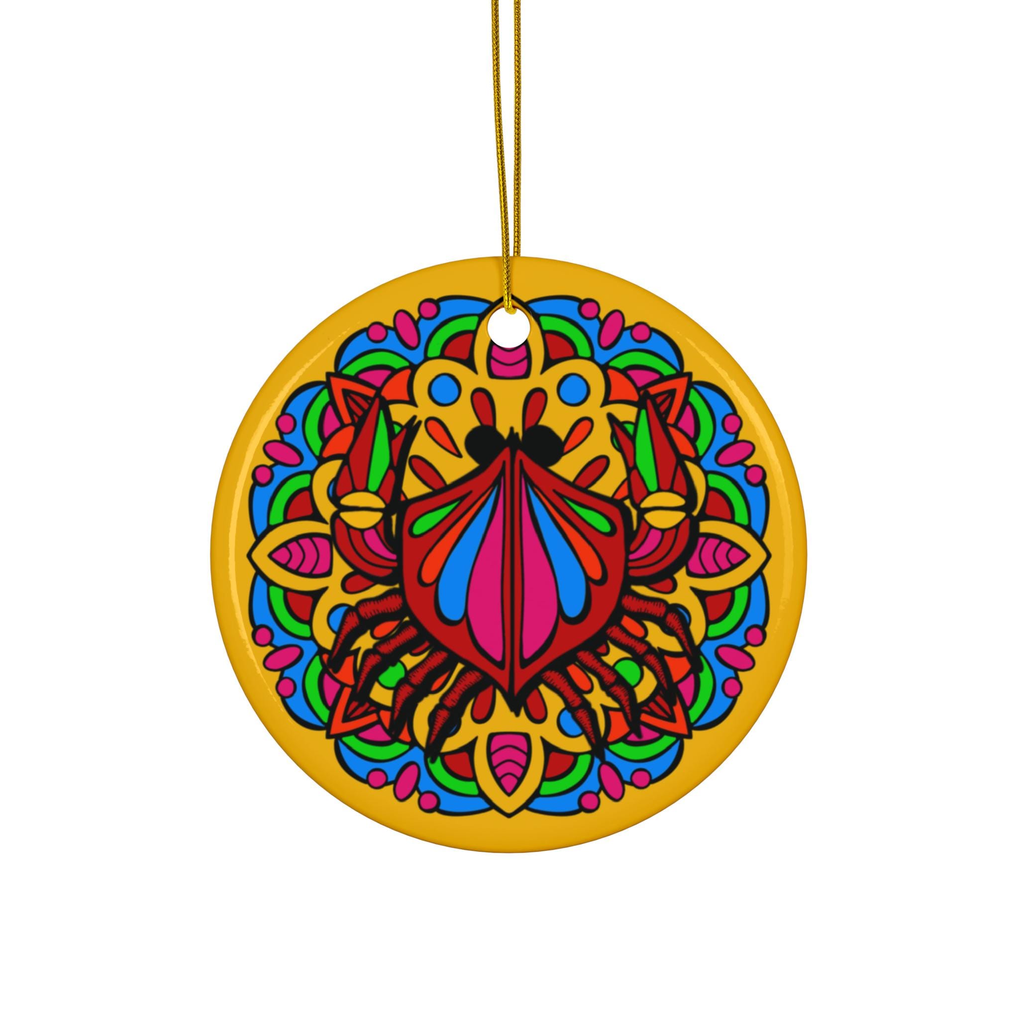 A bright, hand-drawn mandala ornament that brings a playful, colorful pulse to mantels, windows, and holiday branches. The glossy ceramic surface makes each hue sing — jewel reds, magentas, and teal pops nestle into a sunflower-gold background. Lightweight and sturdy, it hangs from a gold-toned string and carries a tiny personality into small spaces: a cheerful nod on a tree, a burst of color in a sunny kitchen window, or a keepsake tucked into a gift package. It feels handcrafted without being fragile — joyful, bold, and made to be noticed every time light catches its glossy finish.