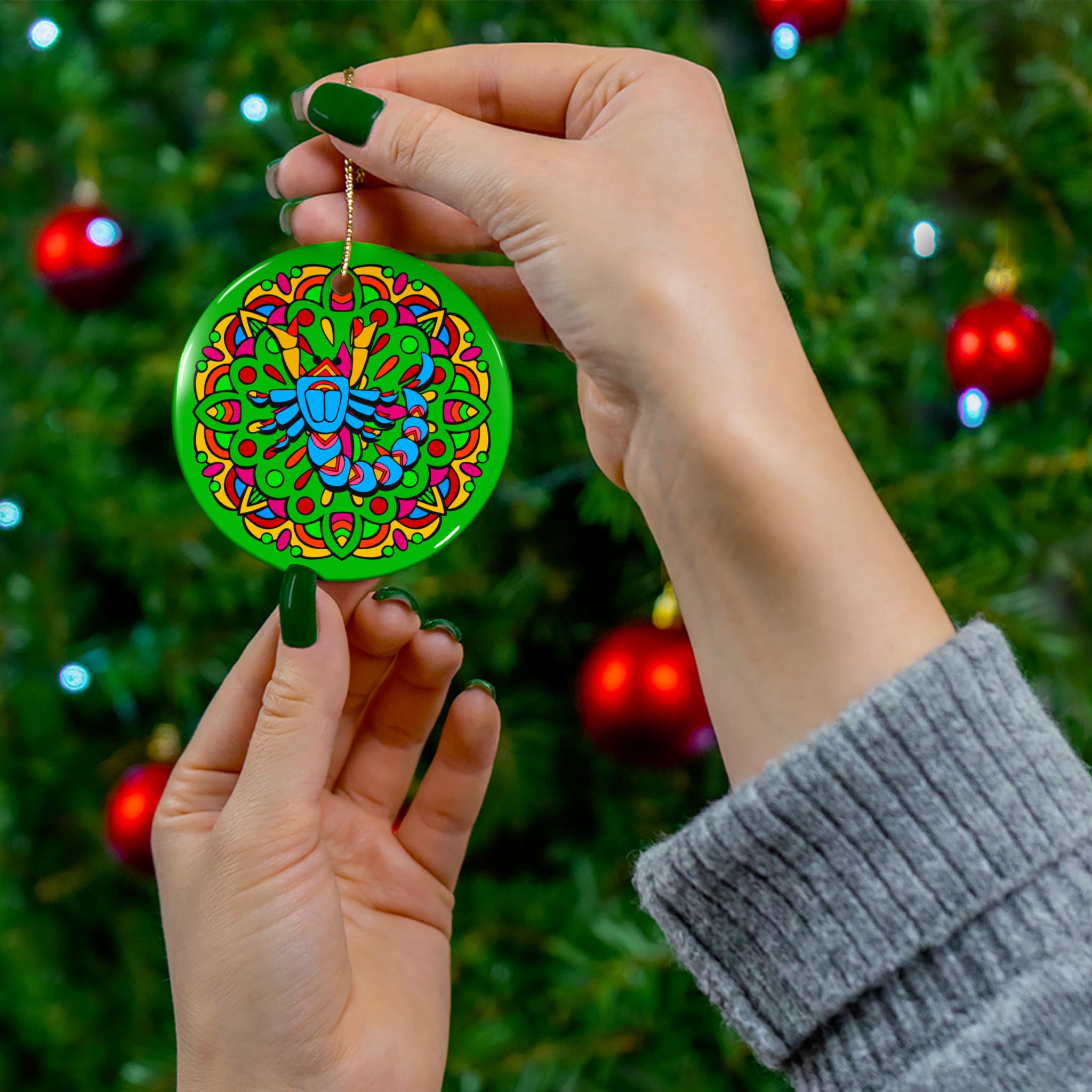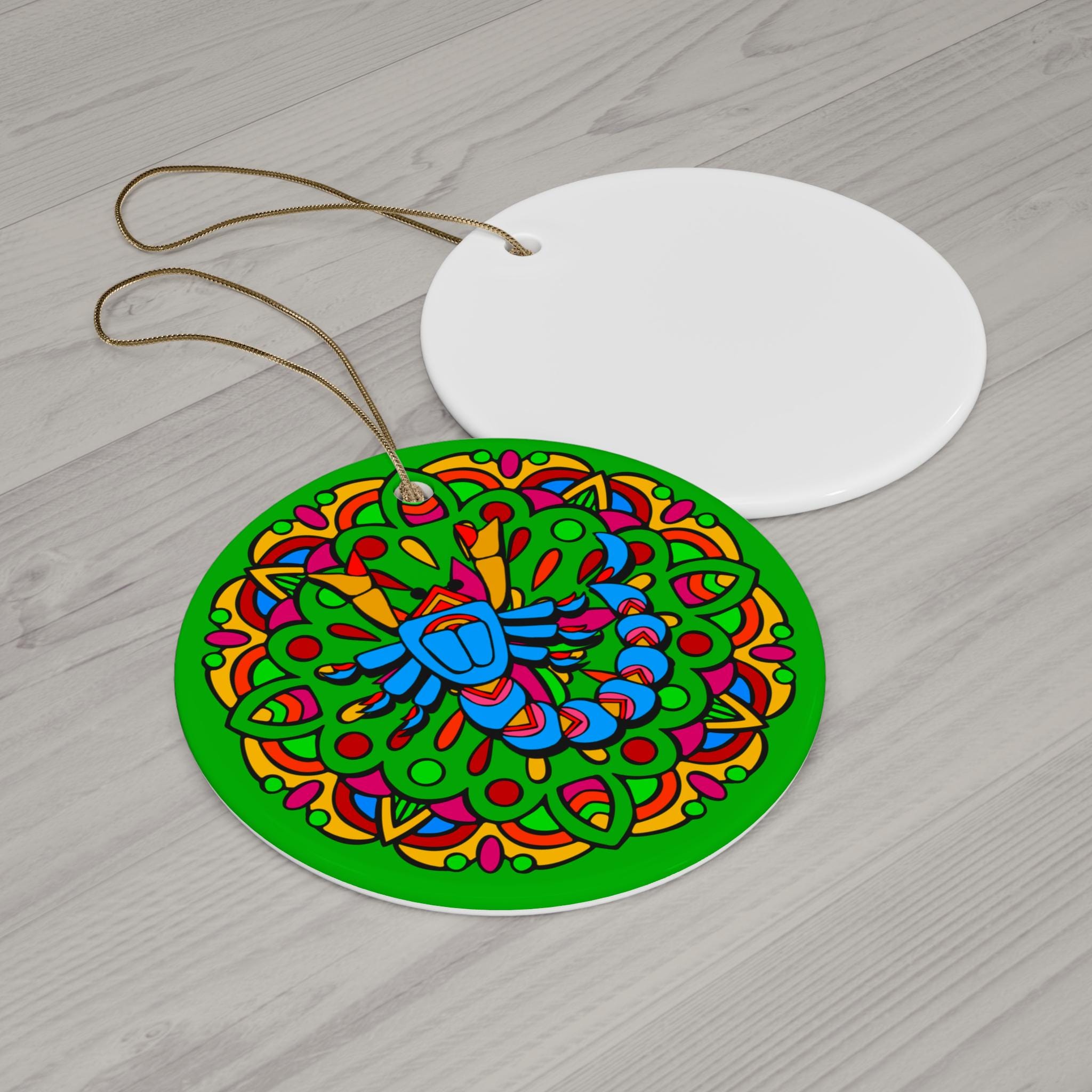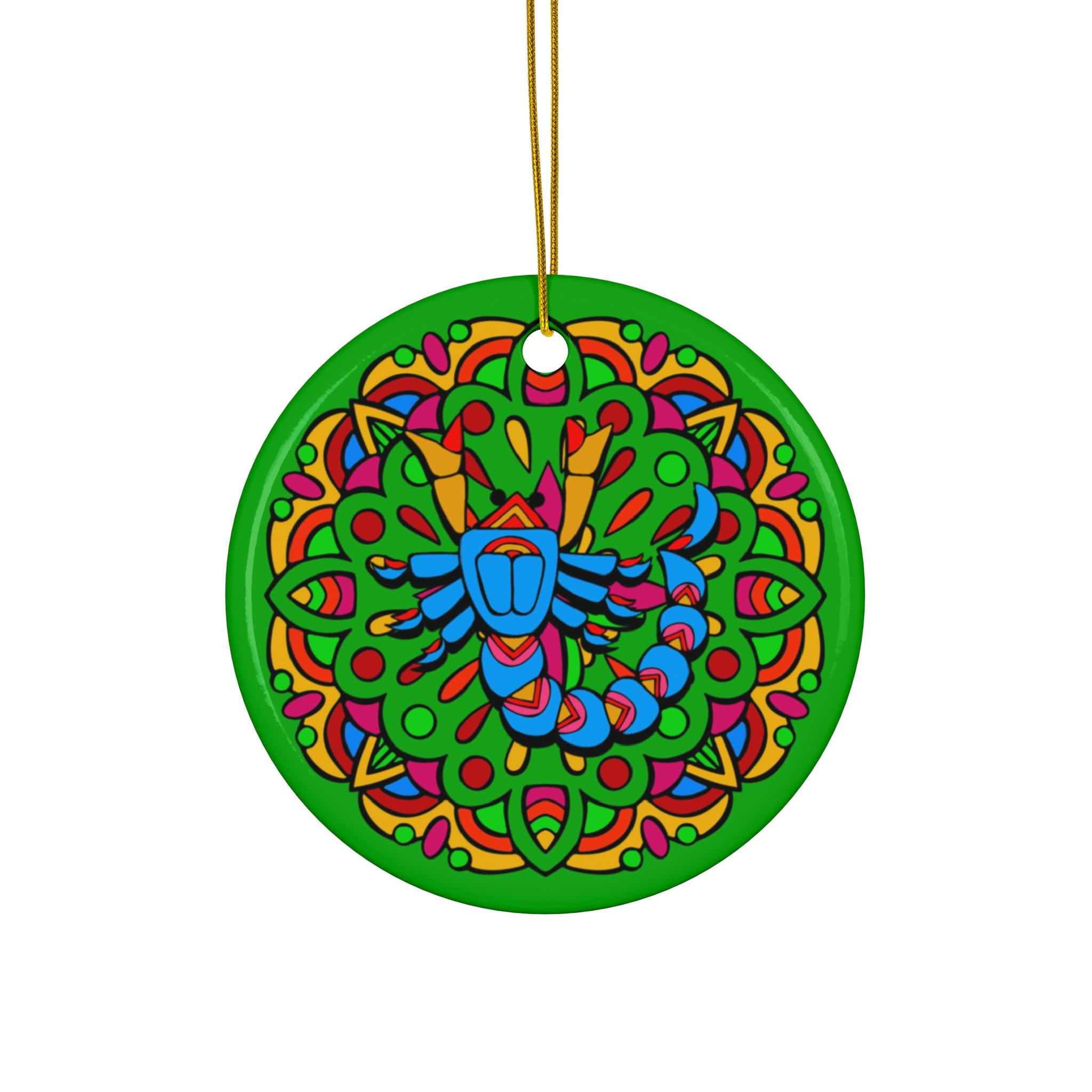 Bright, glossy ceramic ornament that brings lively color and playful pattern to holiday trees, window displays, or everyday nooks. The one-sided print showcases a bold, hand-drawn mandala with a whimsical scorpion motif at its center—rich greens, blues, reds and yellows pop against the glossy surface. A gold-toned hanging string threads through a pre-drilled hole, so it’s ready to hang straight out of the package. Lightweight but solid, the 3mm ceramic piece feels sturdy and holds color without glued layers that can peel. Each purchase includes a single ornament to match the mood of your decor.