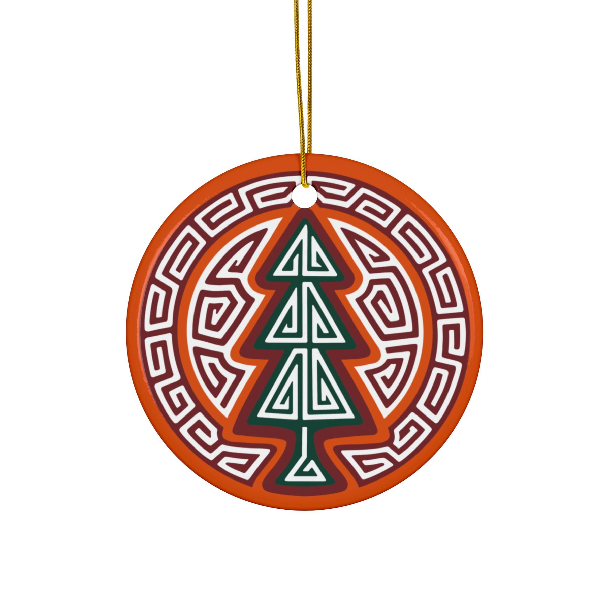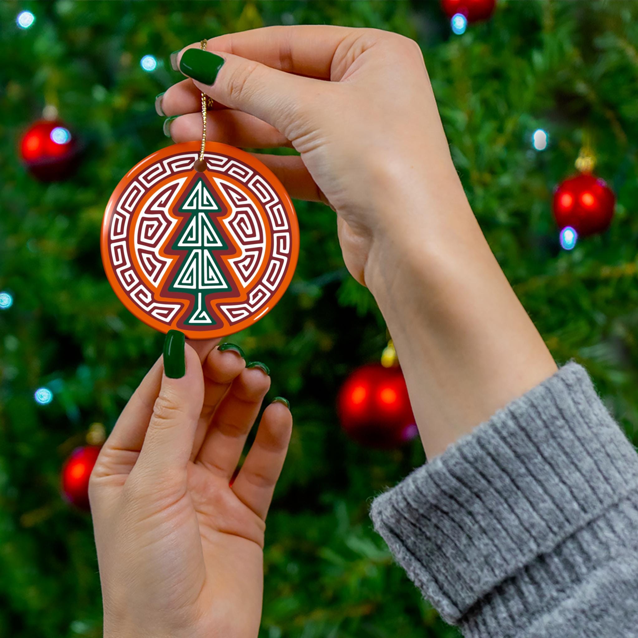 A hand-decorated ceramic ornament that brings bold color and folk-inspired charm to your tree, mantel, or wall. The design features a stylized evergreen rendered in layered greens and outlined accents, set against a warm orange field framed by a repeating geometric border. The glossy ceramic surface makes the colors sing, while the included gold-toned hanging string adds a classic, festive touch. Lightweight but solid, this single-sided ornament carries an artisanal, slightly rustic vibe—great for adding a splash of pattern and personality to seasonal displays or year-round nooks.