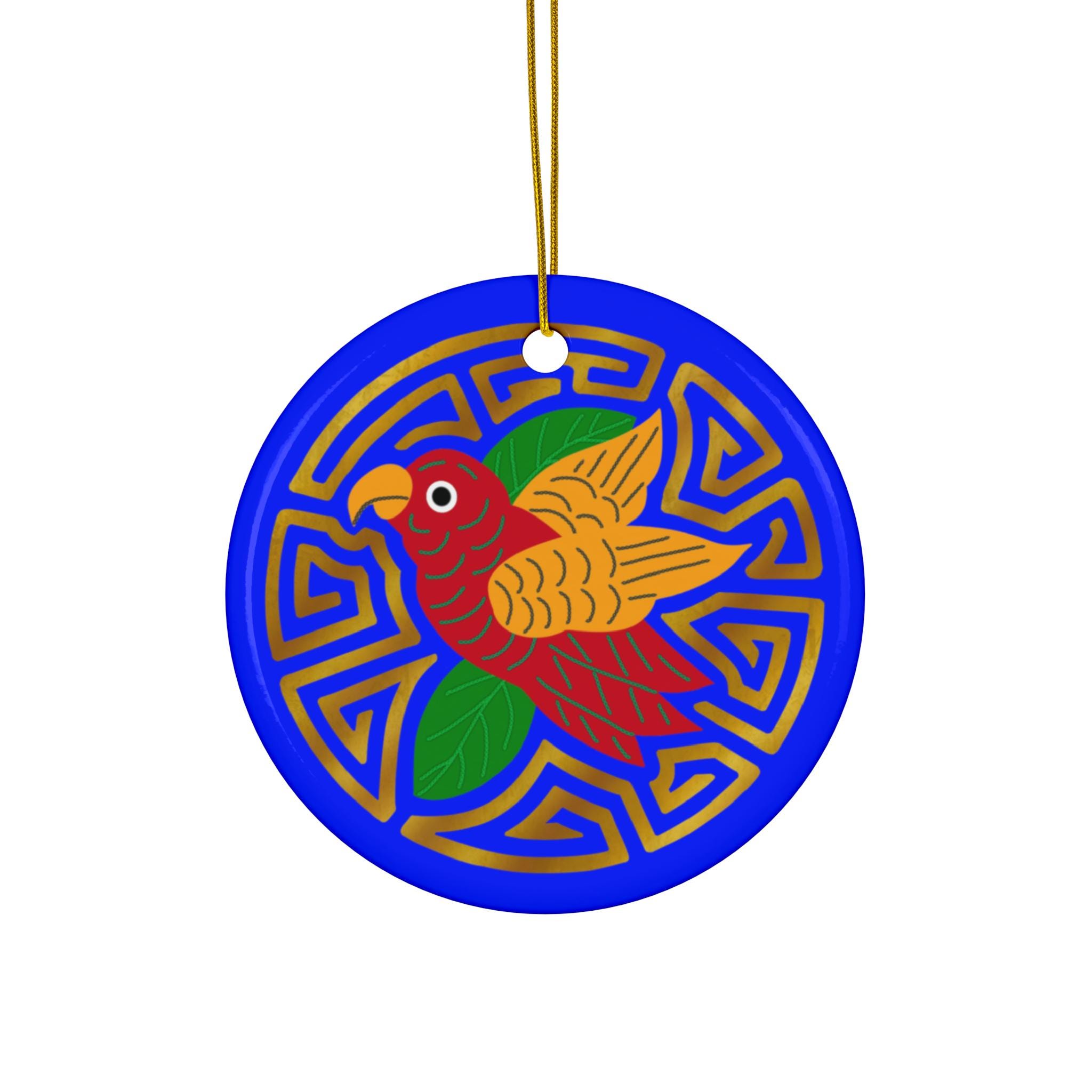 Hand-painted warmth captured in glossy ceramic. This round ornament shows a vibrant red and gold bird framed by geometric blue and gold motifs—bright, bold, and full of motion. Hang it on a tree branch, in a sunny window, or from a mantel garland to bring a splash of color and an artisanal vibe to your space. The one-piece ceramic feels substantial in your hand, and the gold-toned string adds a subtle, festive gleam. Each piece is single-sided, so the design reads clearly from the front and becomes a cheerful focal point where it hangs.