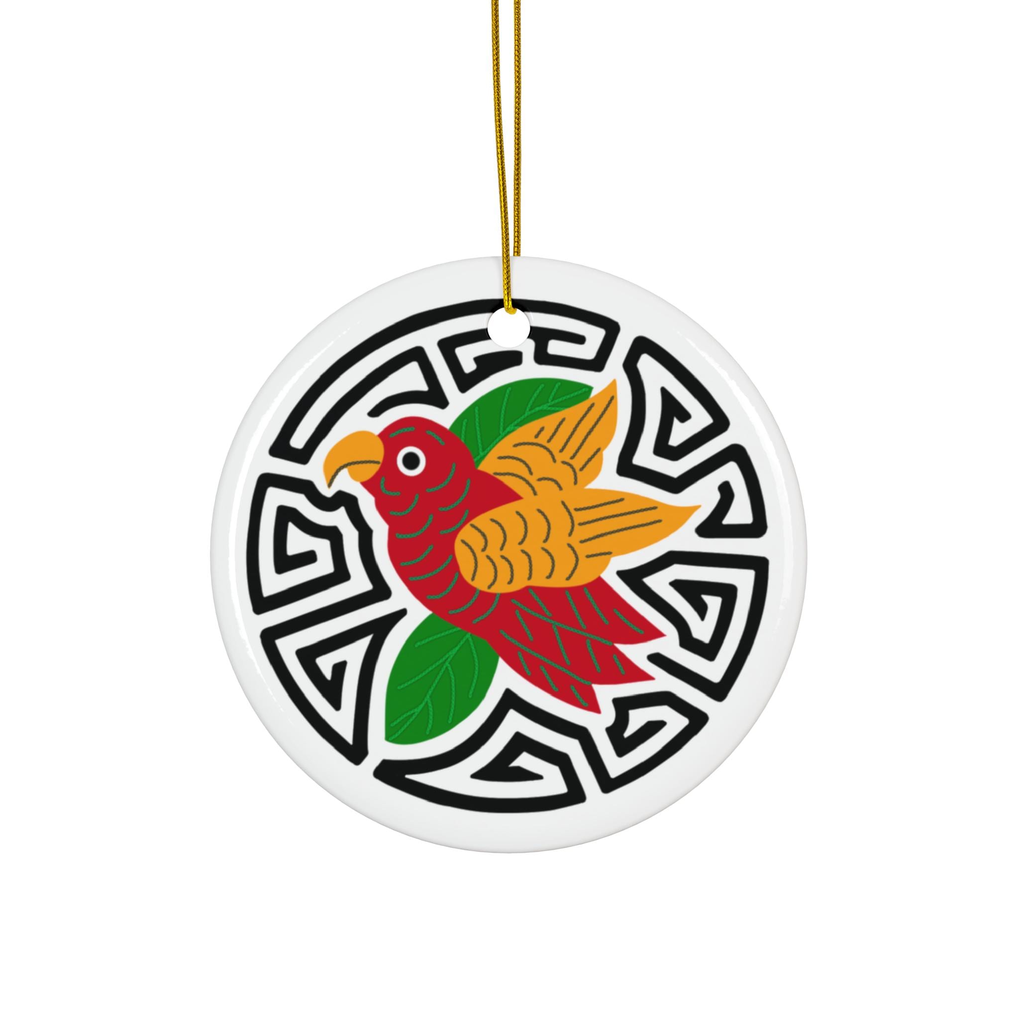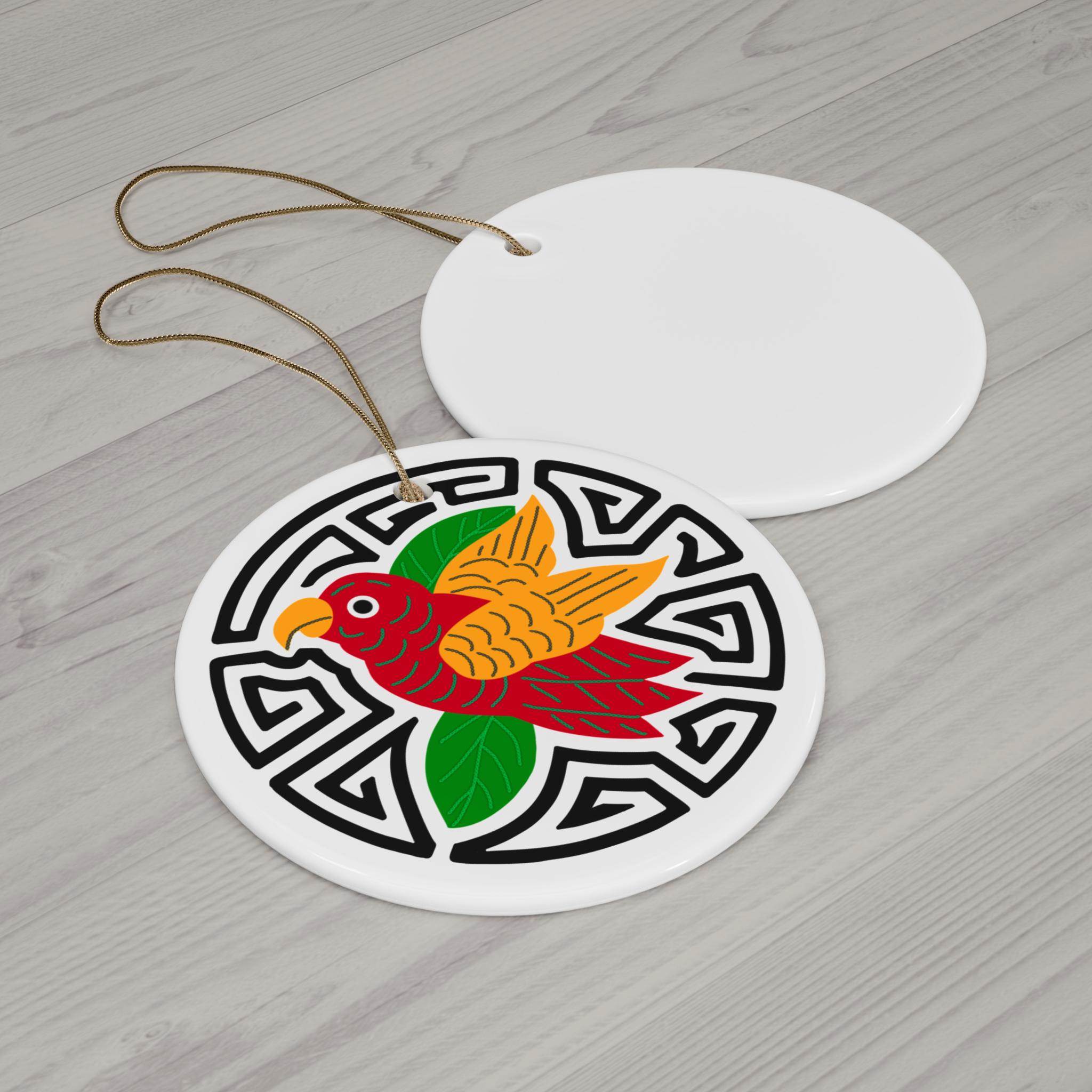 Bright, joyful ceramic ornament that brings color and personality to any tree, window, or wall. The glossy, one-sided print showcases a stylized red and gold bird perched on green leaves, set against a bold black geometric background. Lightweight but sturdy at 3mm thick, each ornament arrives ready to hang with a gold-toned string threaded through a pre-drilled hole. This single-piece ceramic keeps colors crisp and edges clean, adding a handcrafted-feel accent to holiday décor, seasonal displays, or everyday cozy corners.