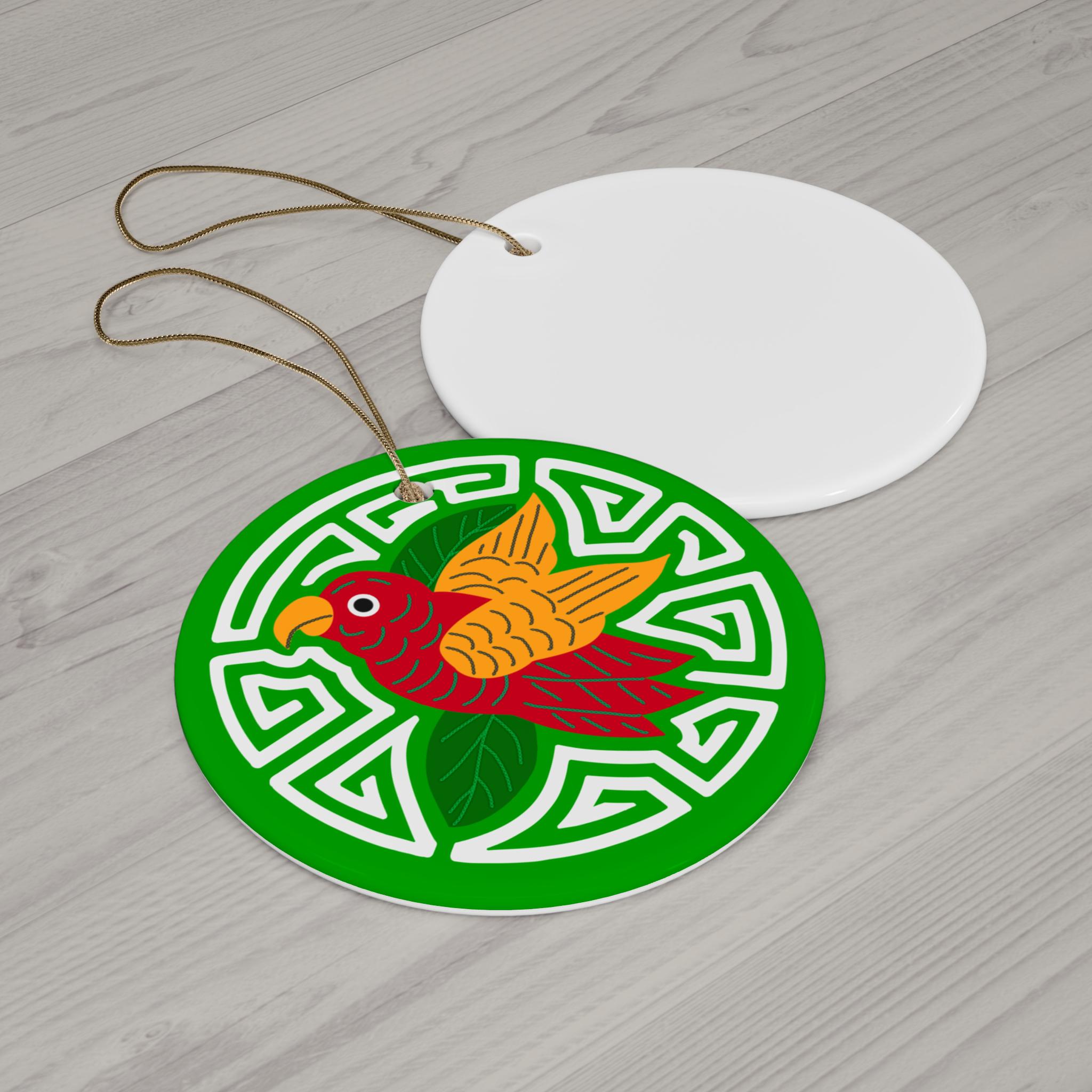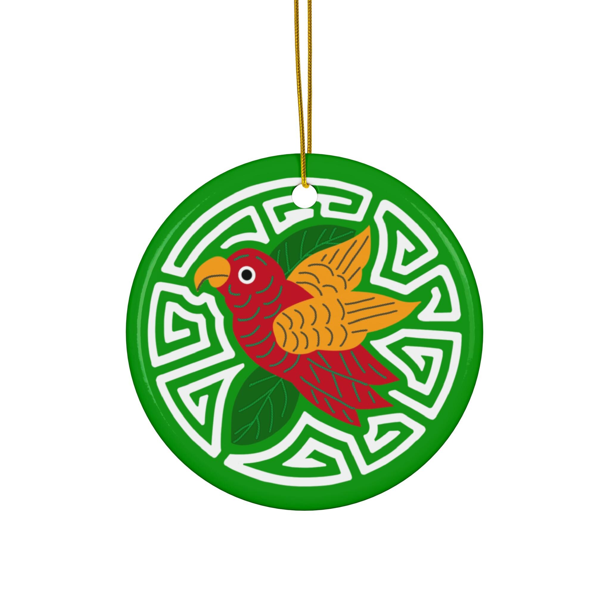 A bright, glossy ceramic ornament that brings a splash of color and folk-art charm to holiday trees, windows, or gift tags. The one-sided print features a vibrant red-and-gold bird resting on stylized green leaves and set against a lively geometric ring — colors that stay crisp thanks to modern printing techniques. Each disc-shaped ornament is made from a single piece of durable 3mm ceramic with a polished finish and a pre-drilled hole threaded with a gold-toned string for immediate hanging. Lightweight and eye-catching, it slips easily into seasonal décor, advent displays, or a curated collection of meaningful keepsakes.