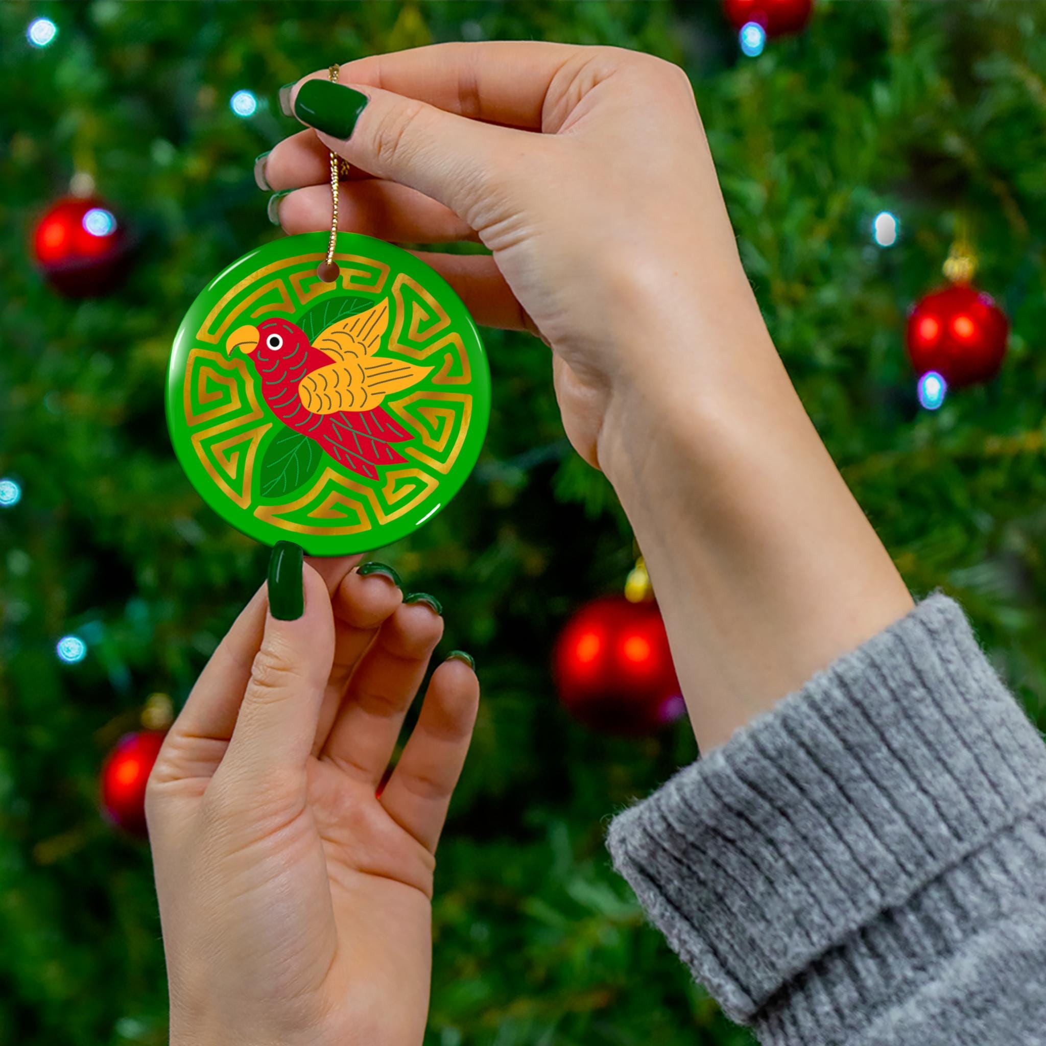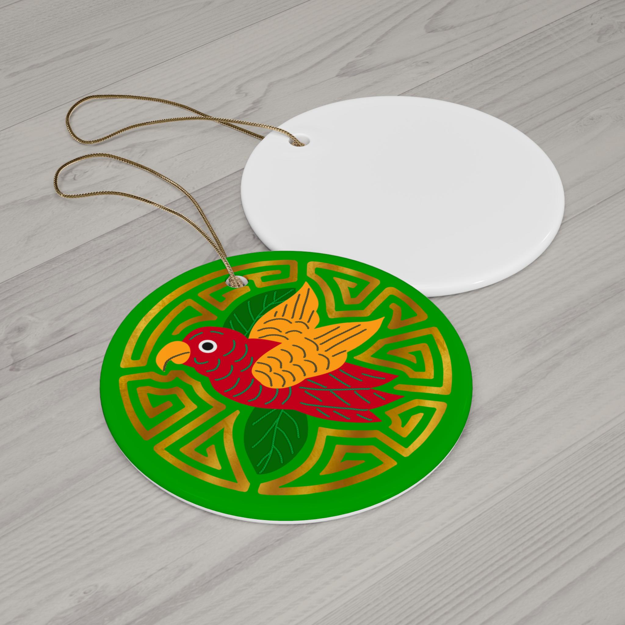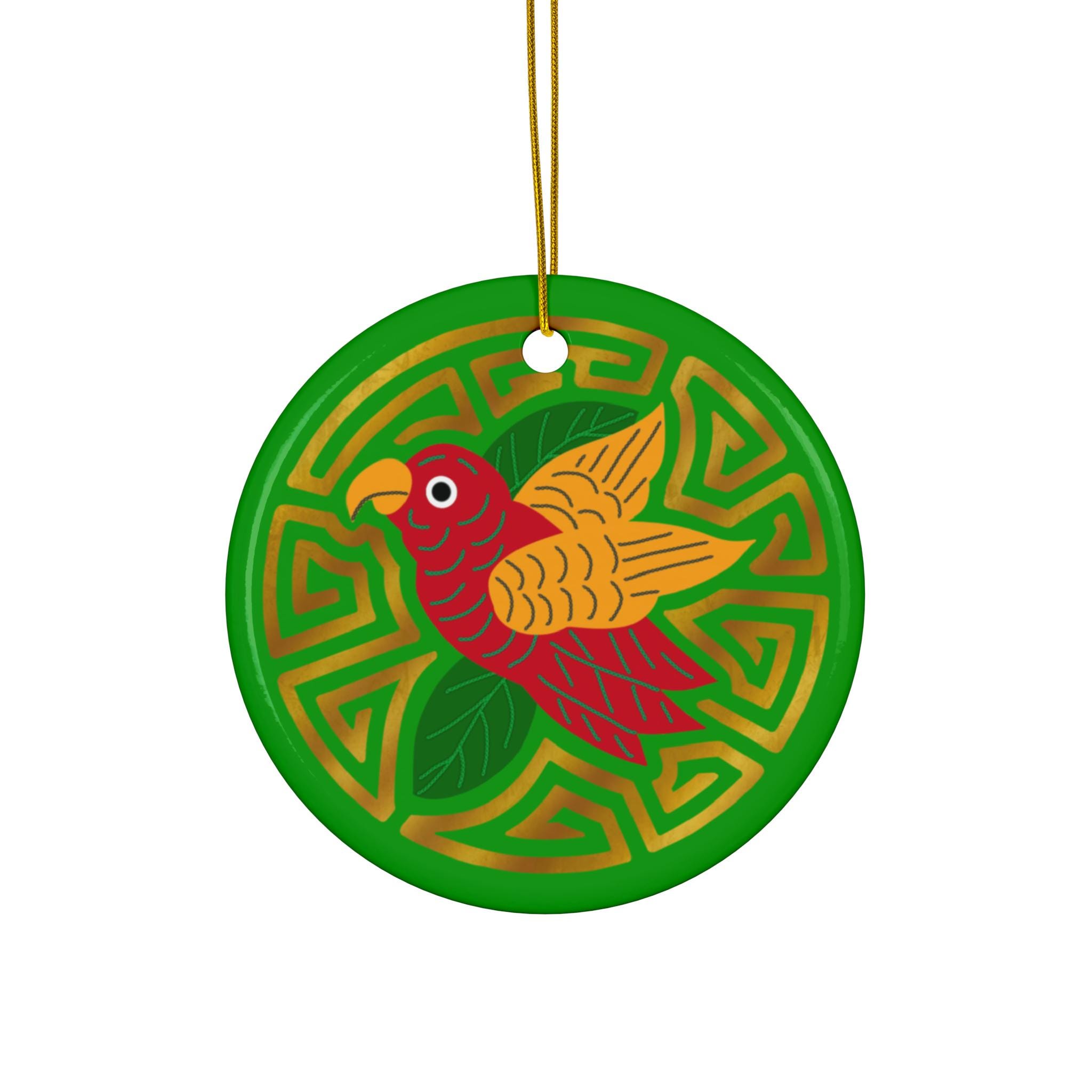 A bright, joyful ceramic ornament that brings color and handcrafted charm to holiday trees, window hangings, or year-round décor. This single-sided glossy ceramic piece features a bold, saturated print of a stylized red-and-gold bird set against a rich green geometric background. The crisp colors and polished finish make the illustration pop, while the included gold-toned hanging string and pre-drilled hole let you display it right away. The ornament’s smooth, solid ceramic construction gives it a satisfying weight and durability — a cheerful accent that slips easily into seasonal displays or a collection of artisan decorations.