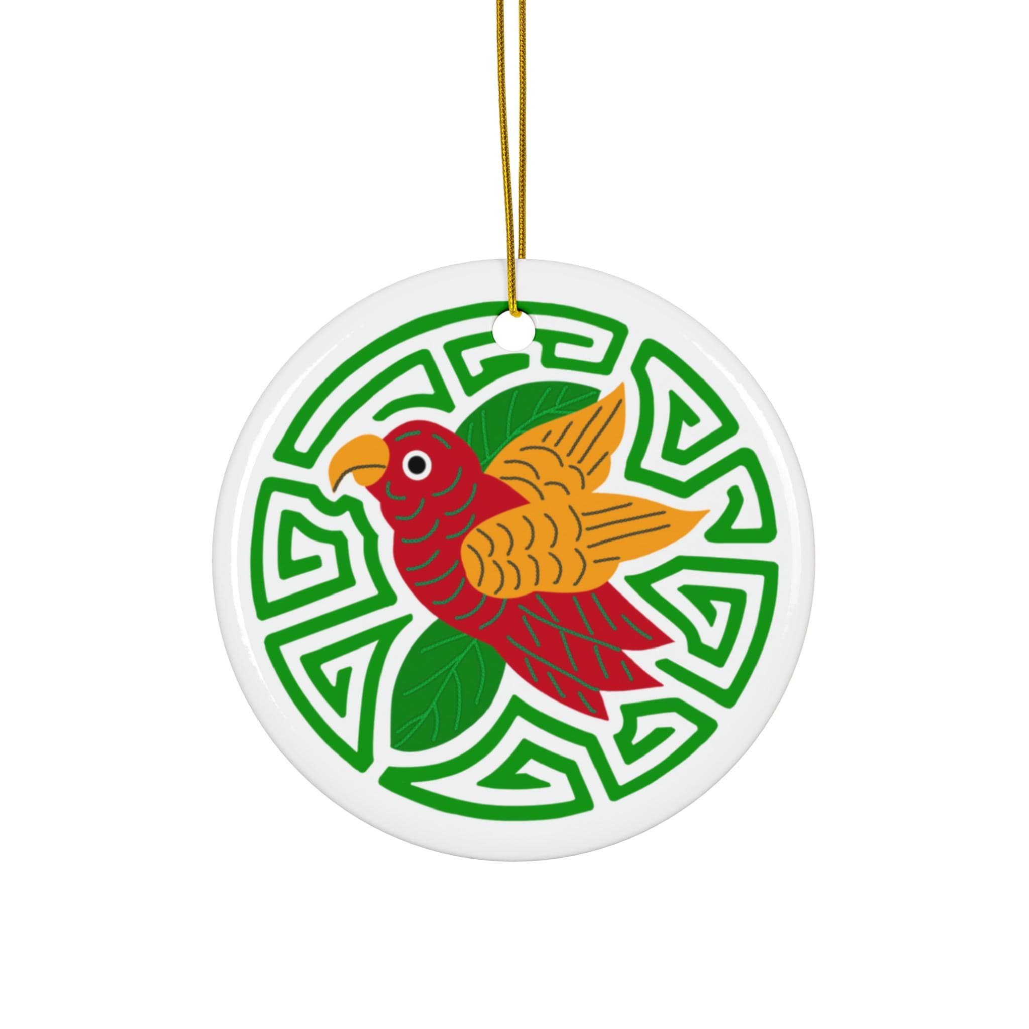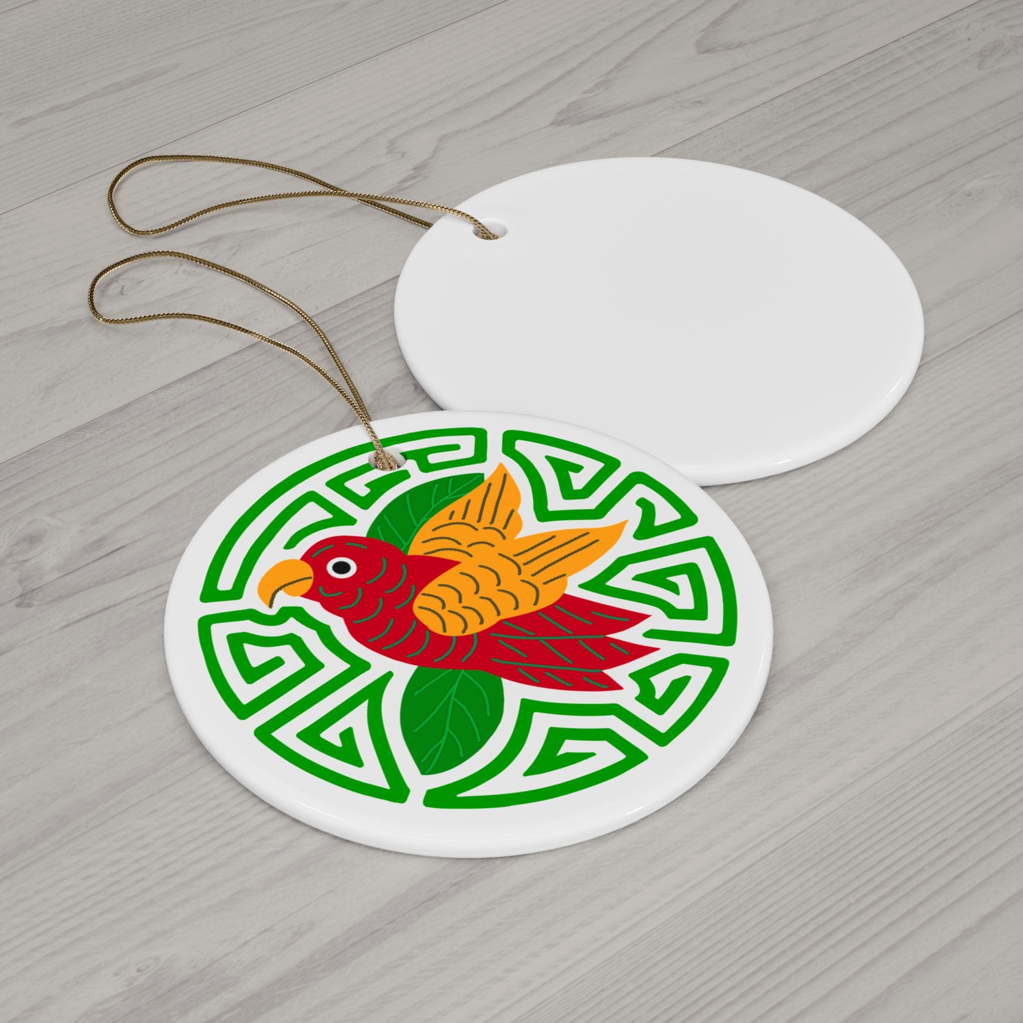 This glossy ceramic ornament brings vibrant color and folk-art energy to any hanging display. A bright red-and-gold bird perches against a green geometric medallion, printed in vivid, durable inks on a solid one-piece ceramic disk. Lightweight but sturdy at 3mm thick, it arrives ready to hang with a gold-toned string through a pre-drilled hole. Use it to add a splash of color to holiday greenery, a window, or a seasonal vignette — it reads like a small talisman that warms a room.