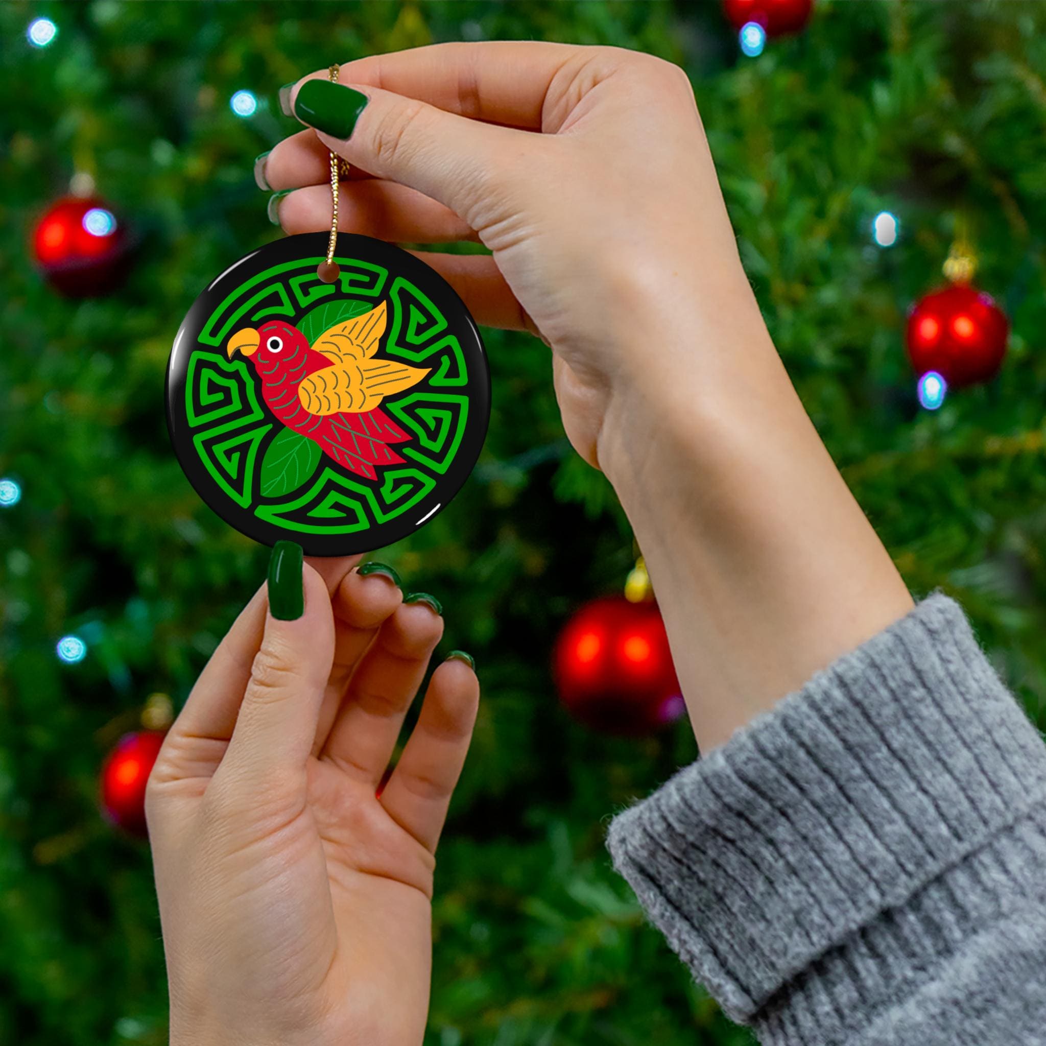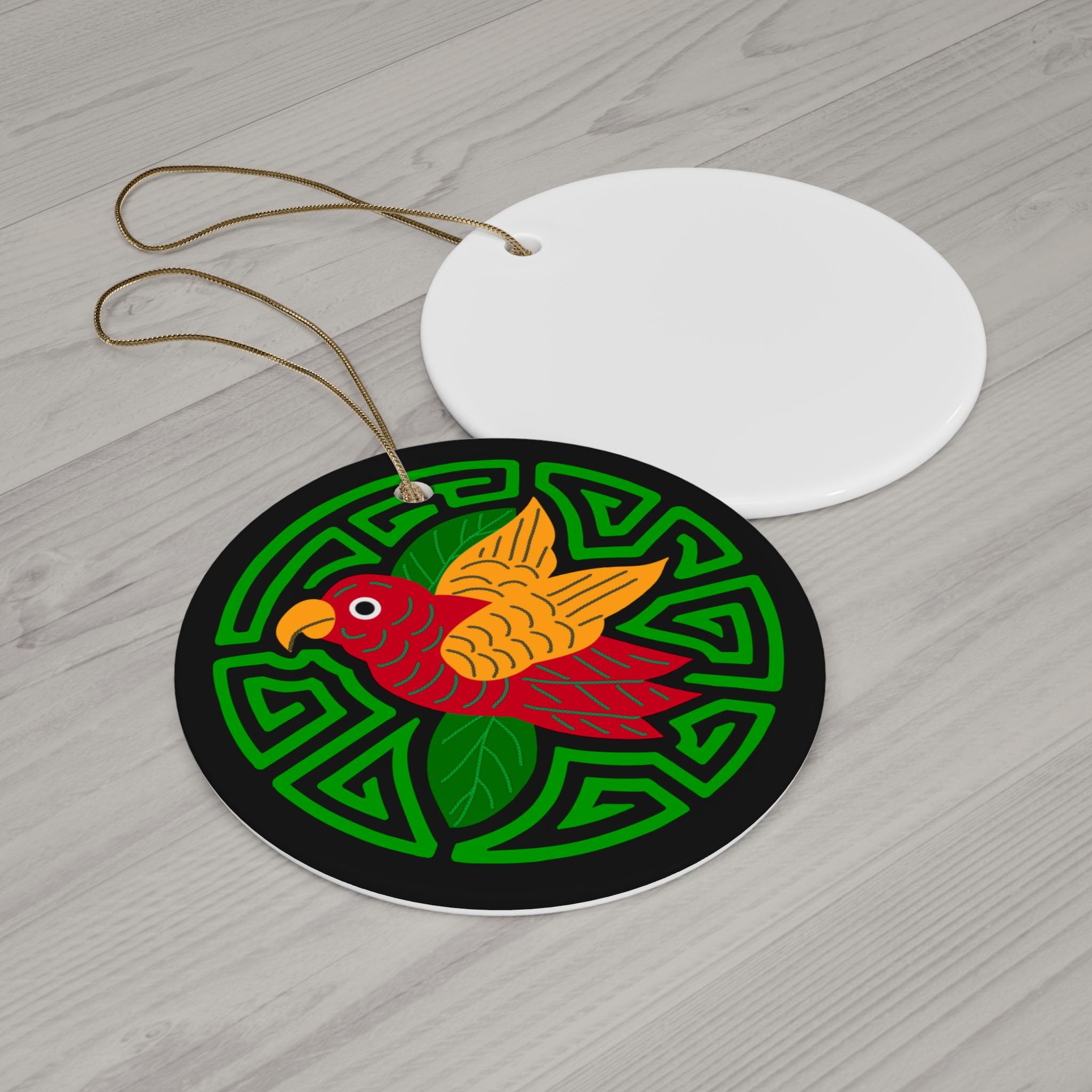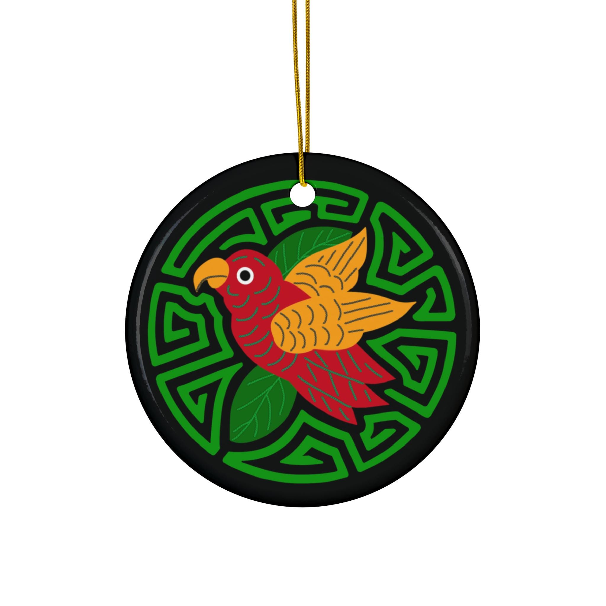 A single, vibrant ceramic ornament that brings a burst of color and handcrafted charm to holiday trees, windows, or cozy corners. The glossy one-sided print showcases a bold, folk-inspired parakeet motif set against a geometric green medallion on a deep black background. At 3mm thick with solid one-piece ceramic construction and a gold-toned hanging string, this ornament feels substantial and durable. The bright, crisp colors pop thanks to modern printing techniques, and the finished gloss adds a jewel-like sheen. Each pack contains one ornament with a pre-drilled hole for easy hanging.