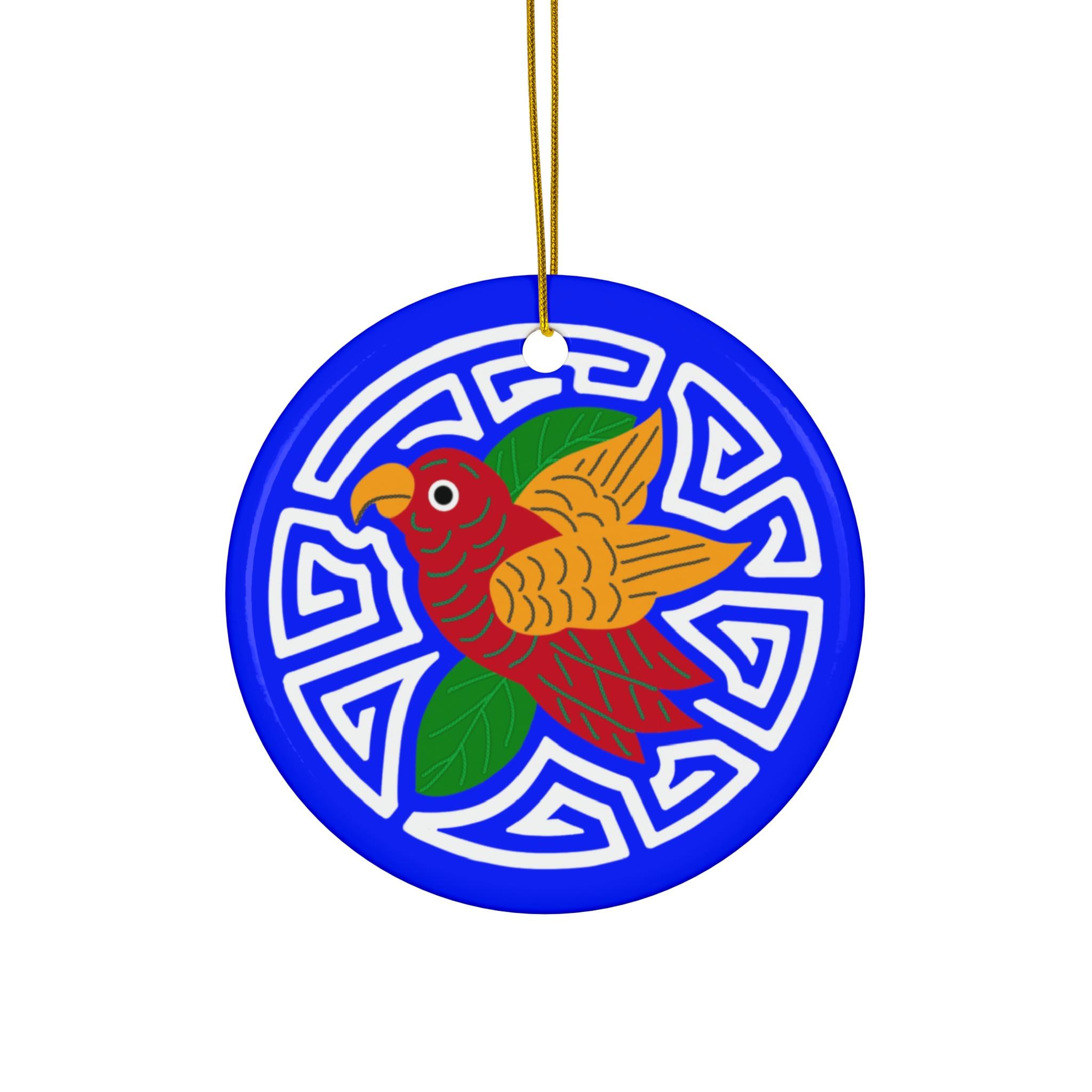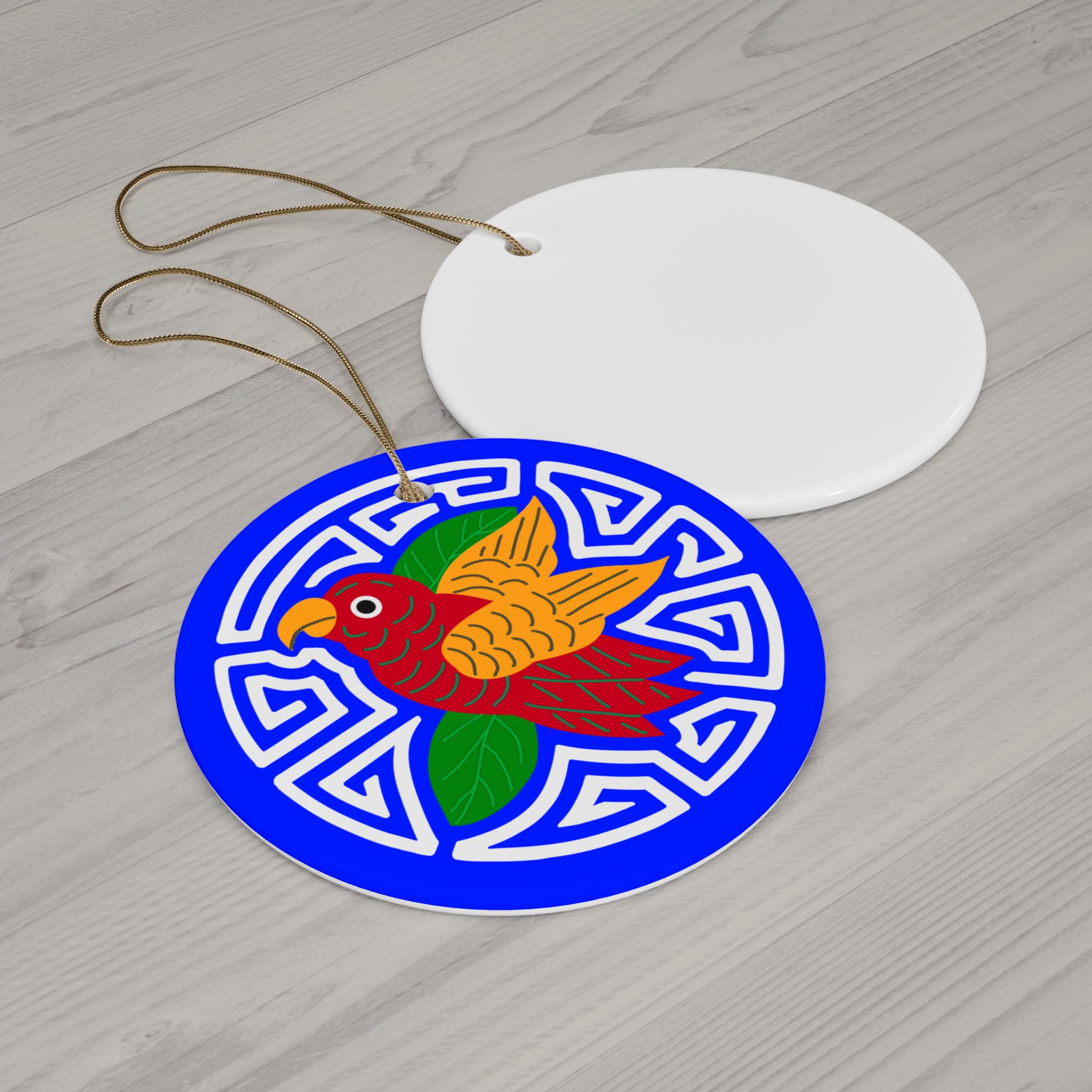 Bright, cheerful ceramic ornament that brings a playful pop of color to holiday trees, windows, or year-round displays. A stylized, folk-art bird in warm reds, oranges and greens perches against a vivid cobalt-blue background framed by a geometric circular motif. The glossy one-sided print catches light and highlights the crisp, saturated colors. Lightweight yet solid ceramic with a gold-toned hanging string included — a small, handcrafted-feel accent that lifts a cozy corner or adds personality to seasonal decor.