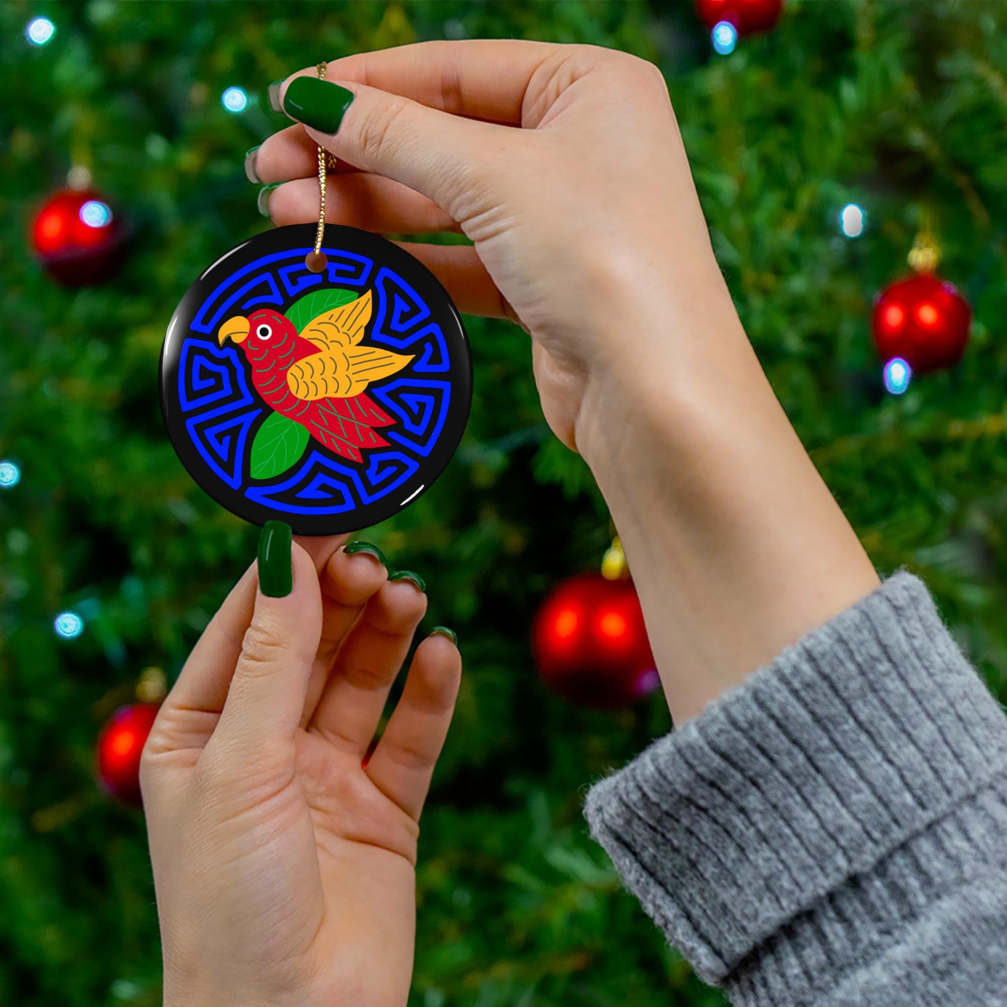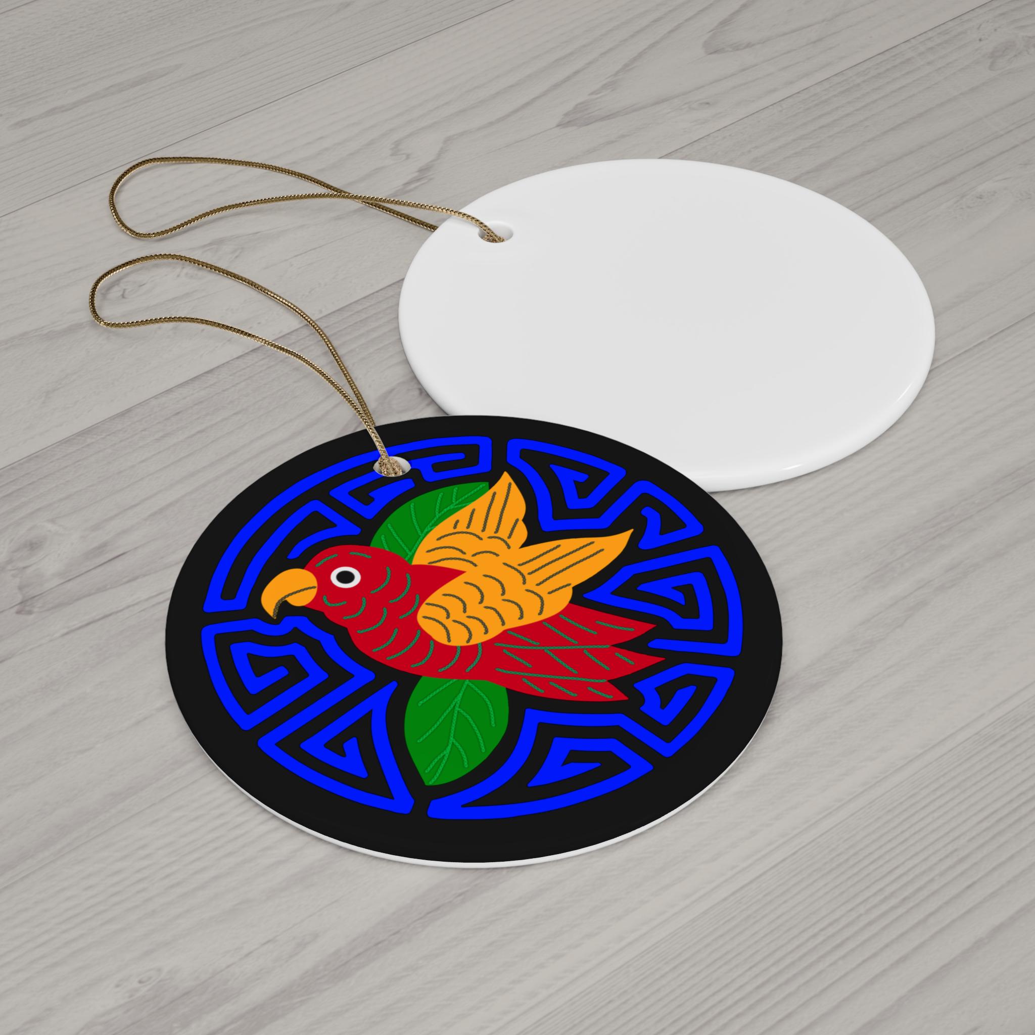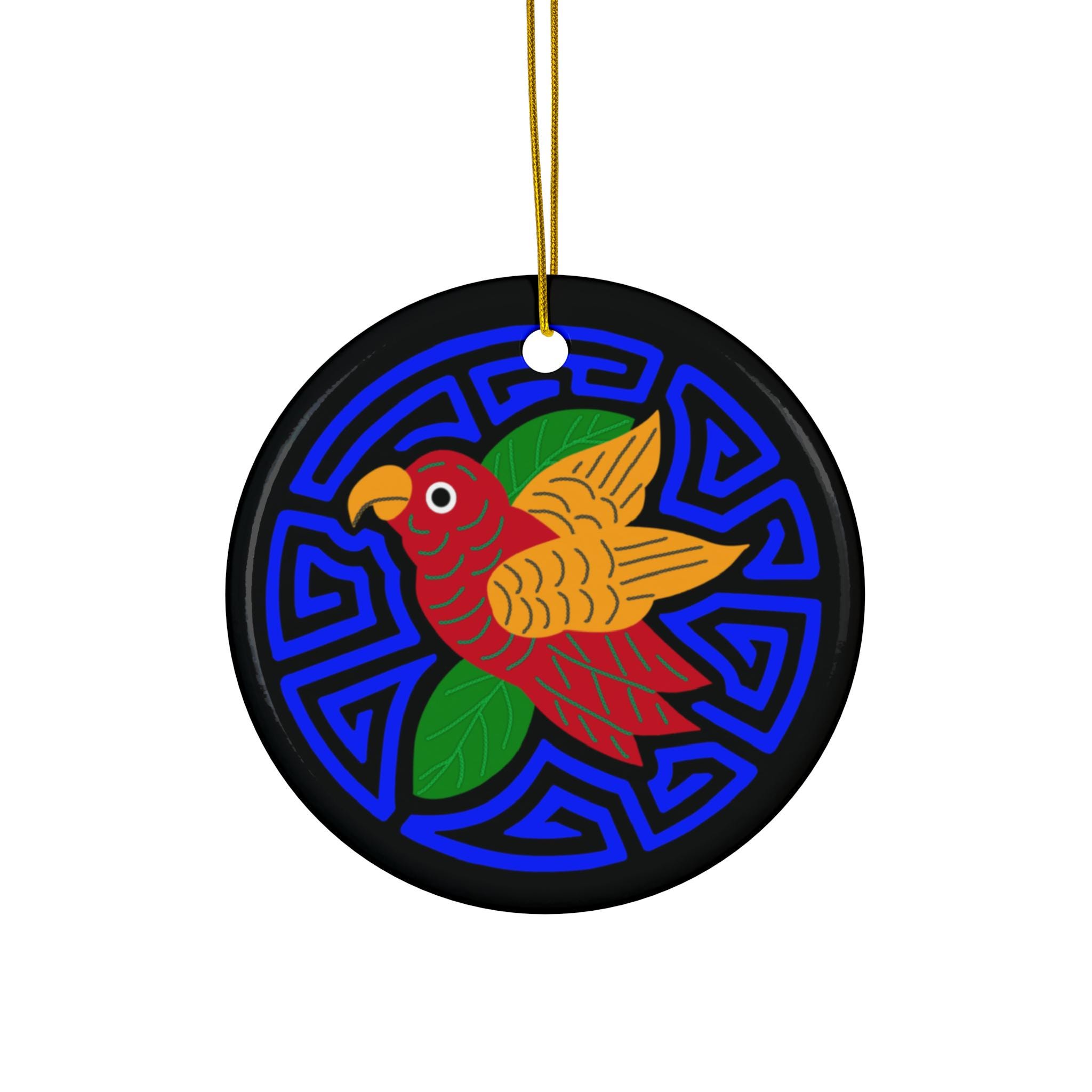 Bright, joyful ceramic ornament featuring a hand-drawn parakeet set against a bold blue geometric medallion. The glossy one-sided print makes the colors sing — rich reds, warm golds, and fresh greens pop from a deep black background. Lightweight yet sturdy ceramic and a gold-toned hanging string let this piece hang confidently on a tree branch, in a sunny window, or from a hook on a wall. The compact 3mm thickness keeps it feeling delicate while standing up to seasonal display. Each ornament ships singly and arrives ready to hang.
