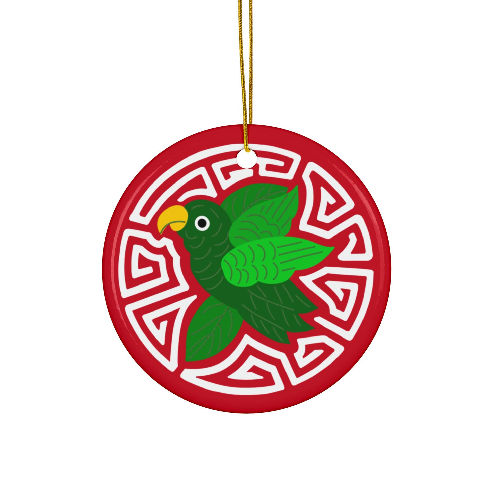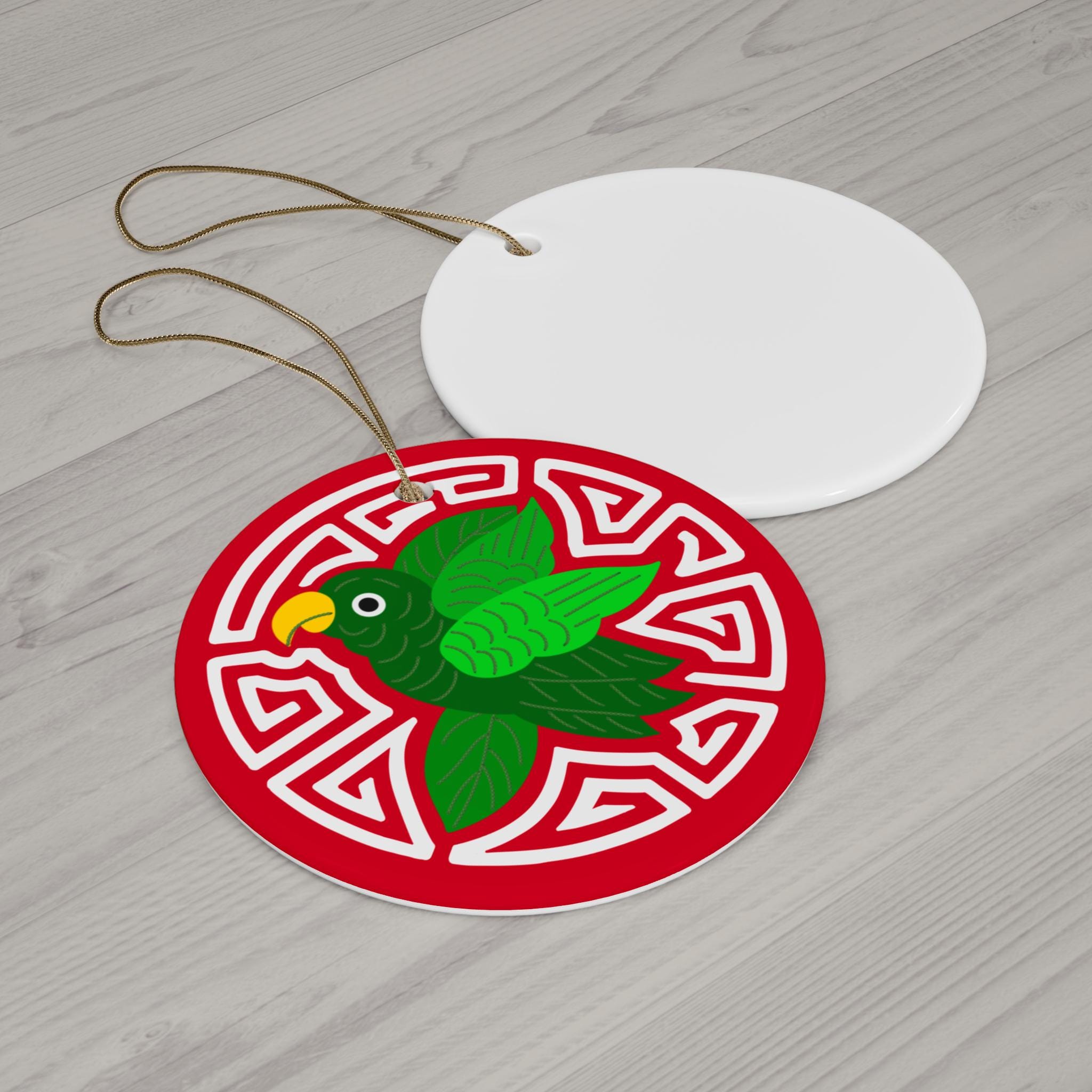 Hand-painted energy in a small, glossy circle — this ceramic ornament brings a bright, joyful note to holiday trees, windows, or a favorite wall hook. A vivid green parakeet appears mid-flight against a bold red background with geometric white accents, giving it a lively, slightly folk-art feel. The single-sided print sits on a durable 3mm ceramic disc with a shiny finish and a gold-toned hanging string ready to display. It’s the kind of little accent that sparks conversation and lifts a room’s mood during seasonal gatherings or everyday moments when you want a splash of color and personality.