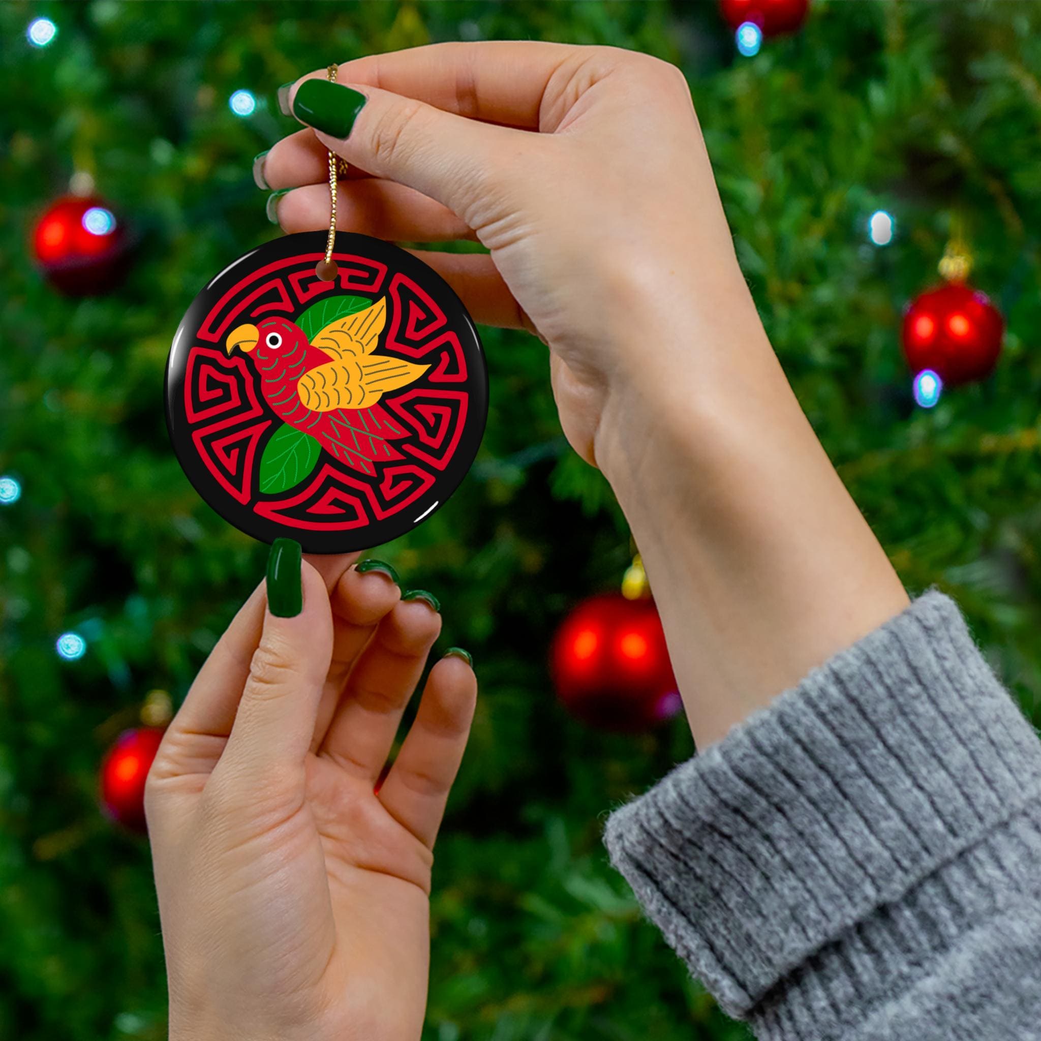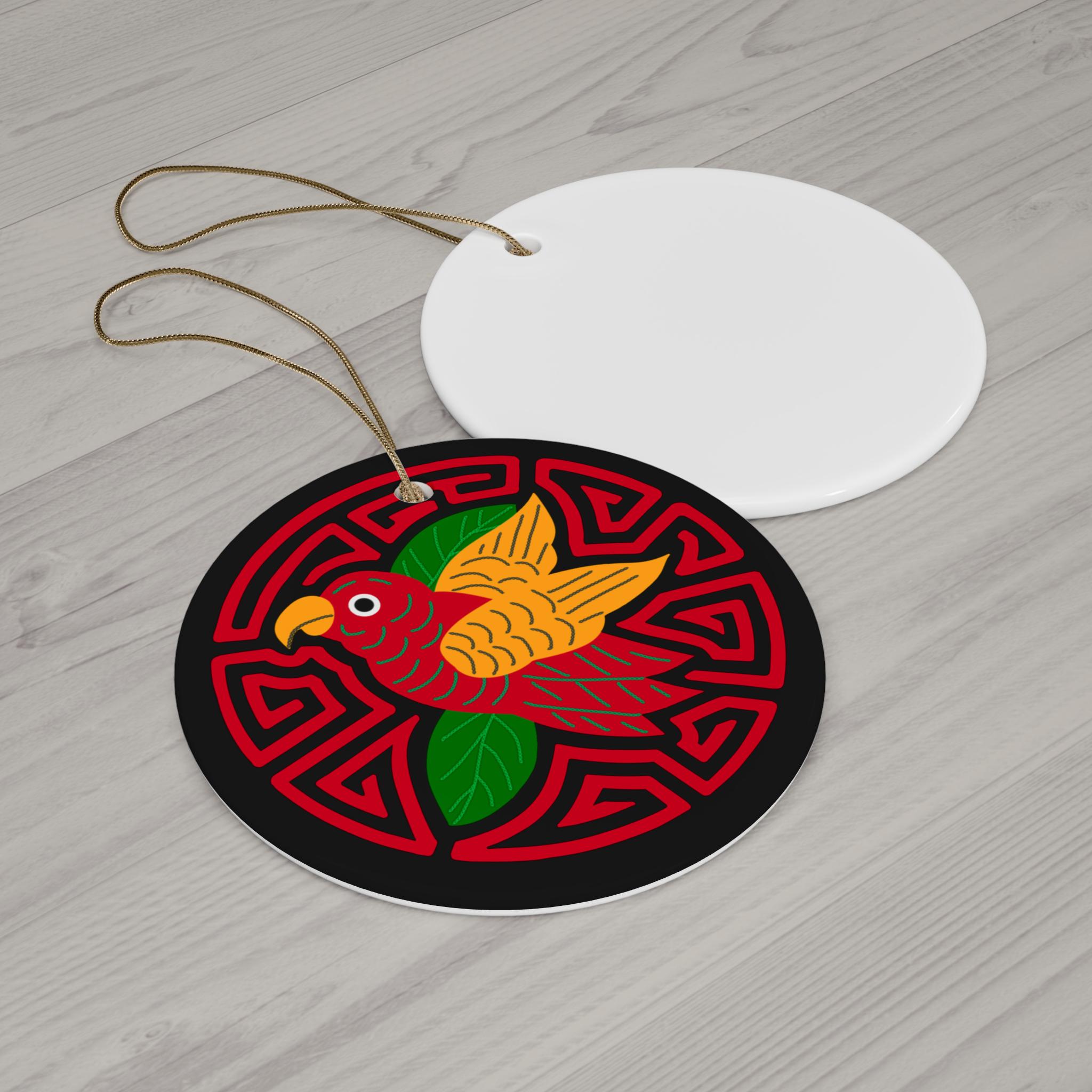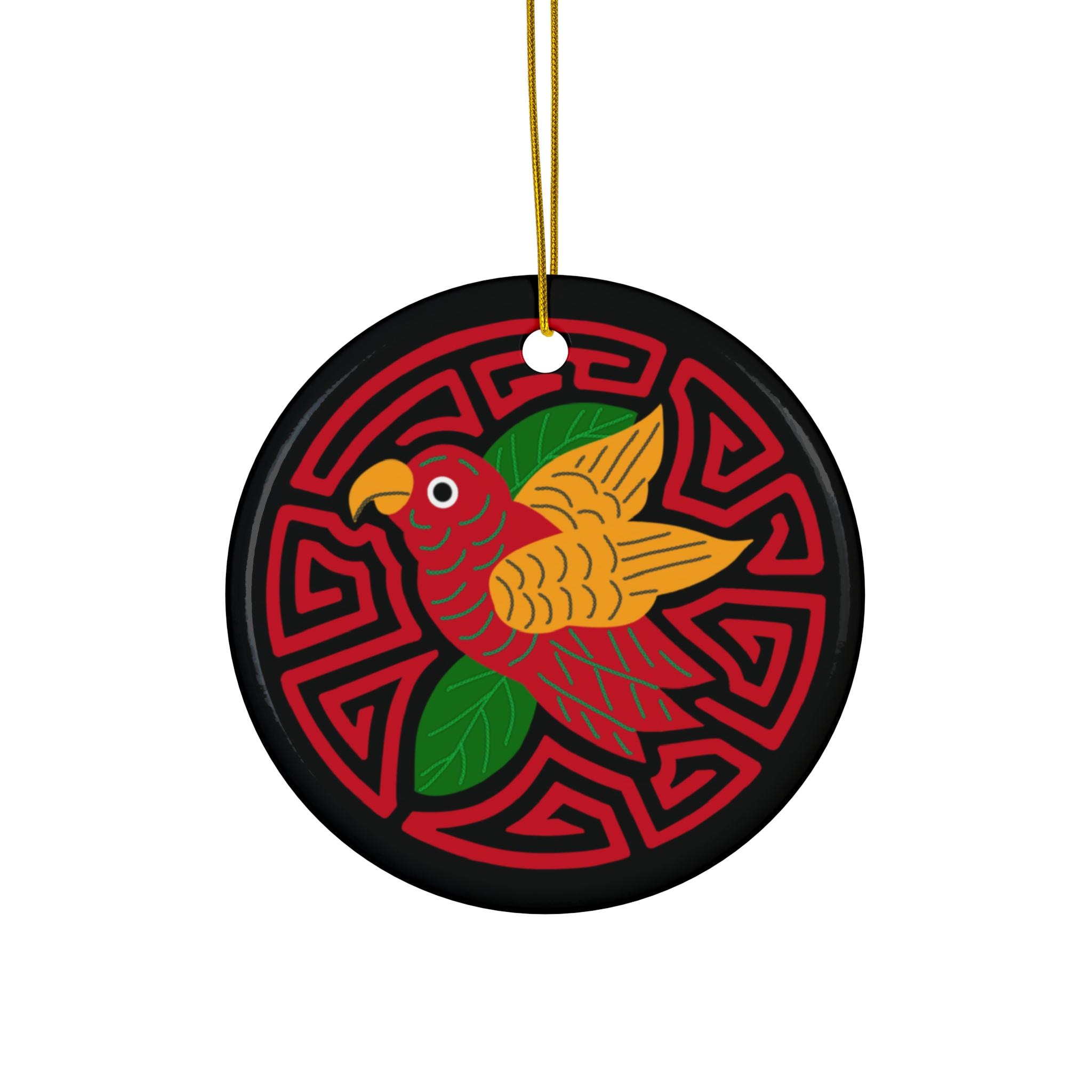 A bright, single-sided ceramic ornament that brings bold color and playful charm to your holiday decor. This 3mm-thick glossy ornament features a vibrant parrot motif set against a striking red circular mola on a deep black background. Lightweight but sturdy, it arrives ready to hang with a gold-toned string threaded through a pre-drilled hole. The rich, crisp print and solid one-piece construction ensure the design stays vivid year after year, whether it’s tucked into a wreath, hung on a branch, or given as a thoughtful keepsake.