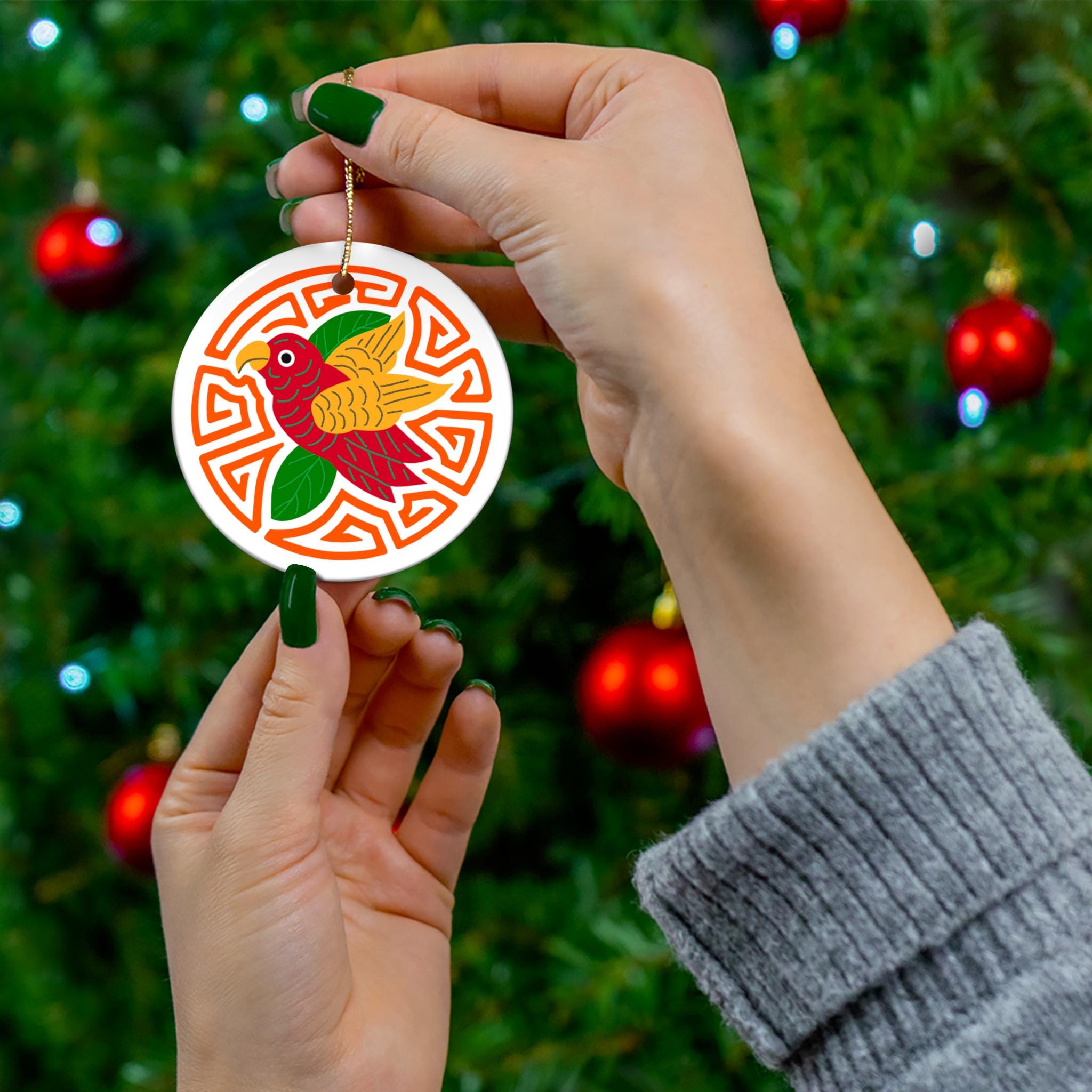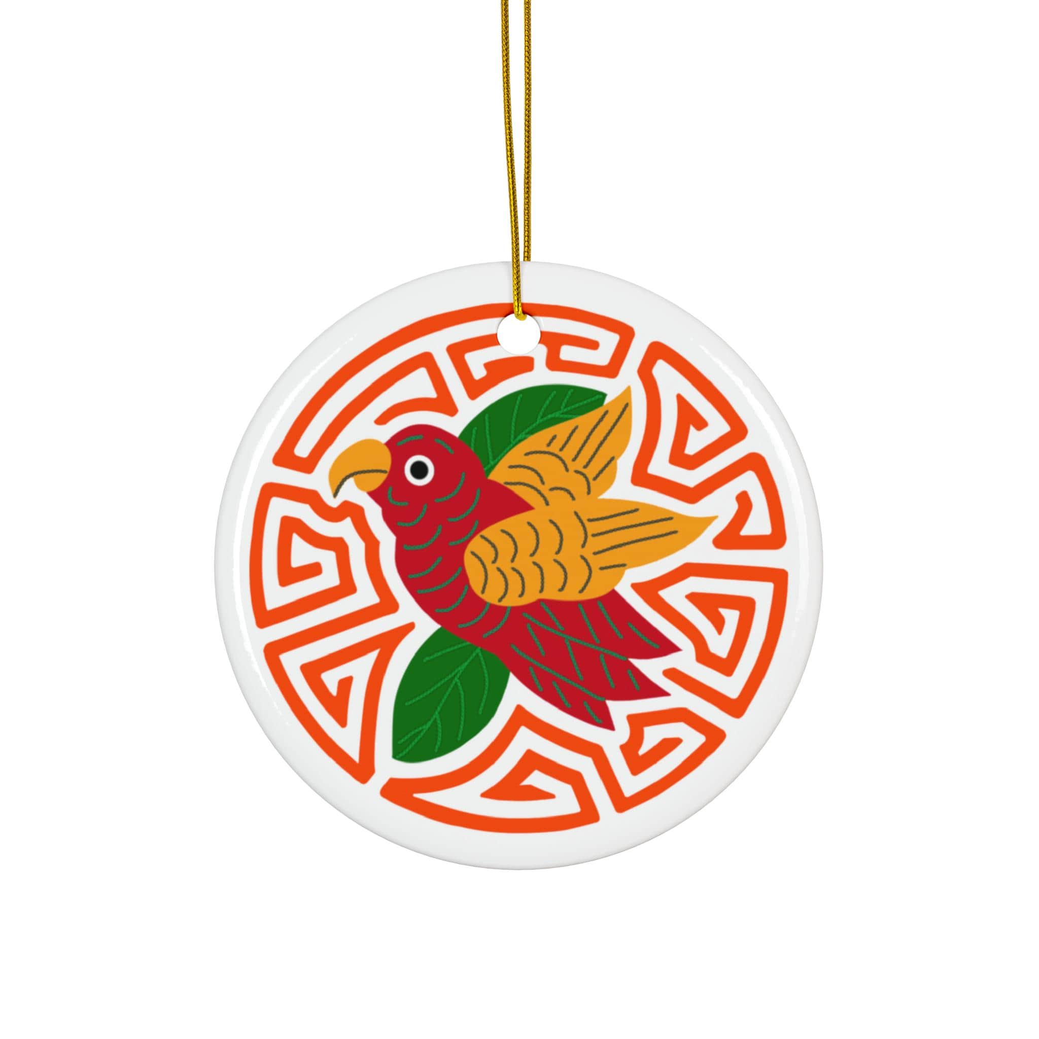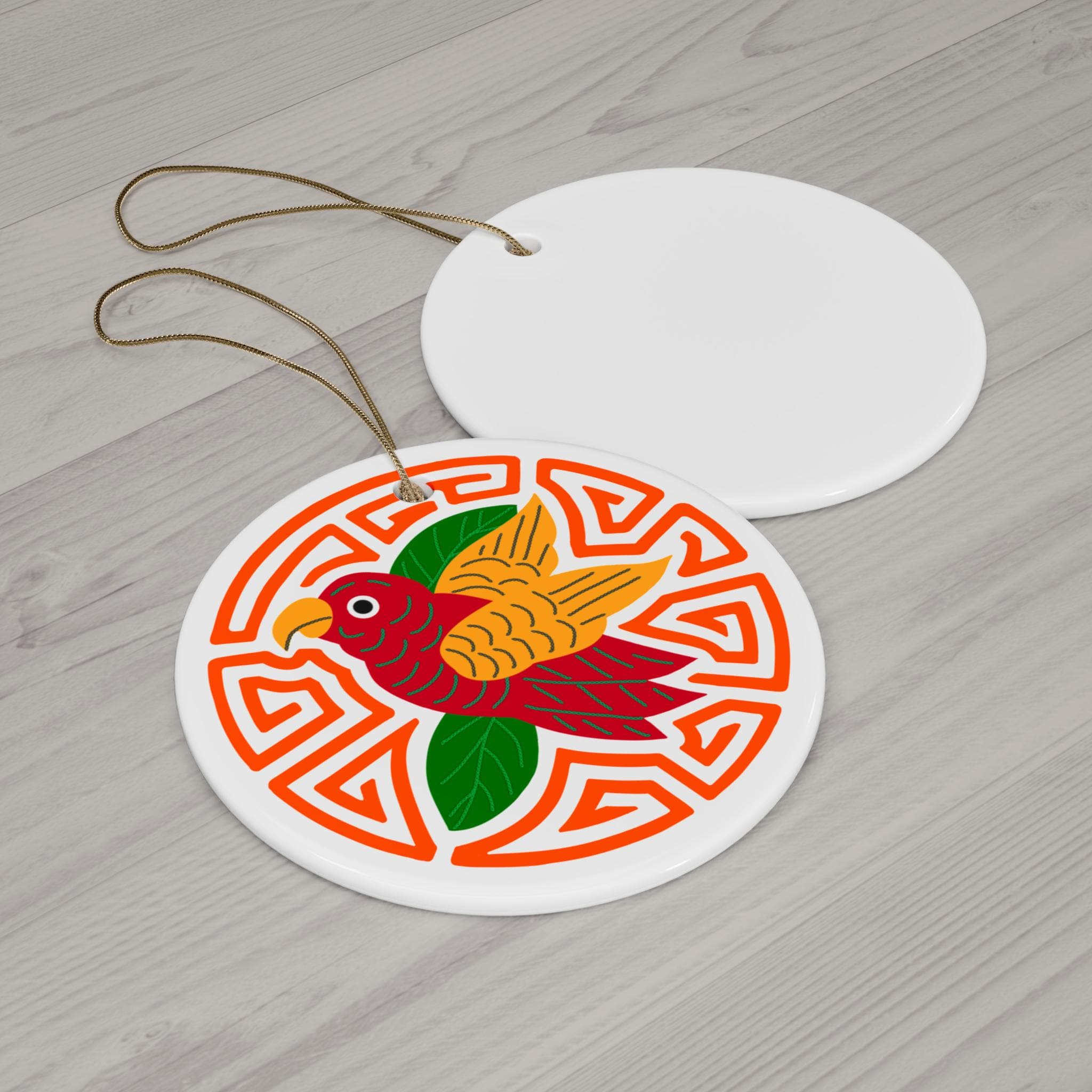 A bright, cheerful ceramic ornament that brings bold color and playful charm to holiday décor or everyday display. The single-sided glossy print showcases a stylized parakeet with warm reds, golden wings, and deep green leaves set against an orange and white mola background. Lightweight but sturdy 3mm ceramic holds vibrant detail and a high-shine finish. A gold-toned hanging string threads through a pre-drilled hole for easy hanging on branches, hooks, or wall pegs. Add a pop of color to mantel displays, gift tags, or seasonal collections.