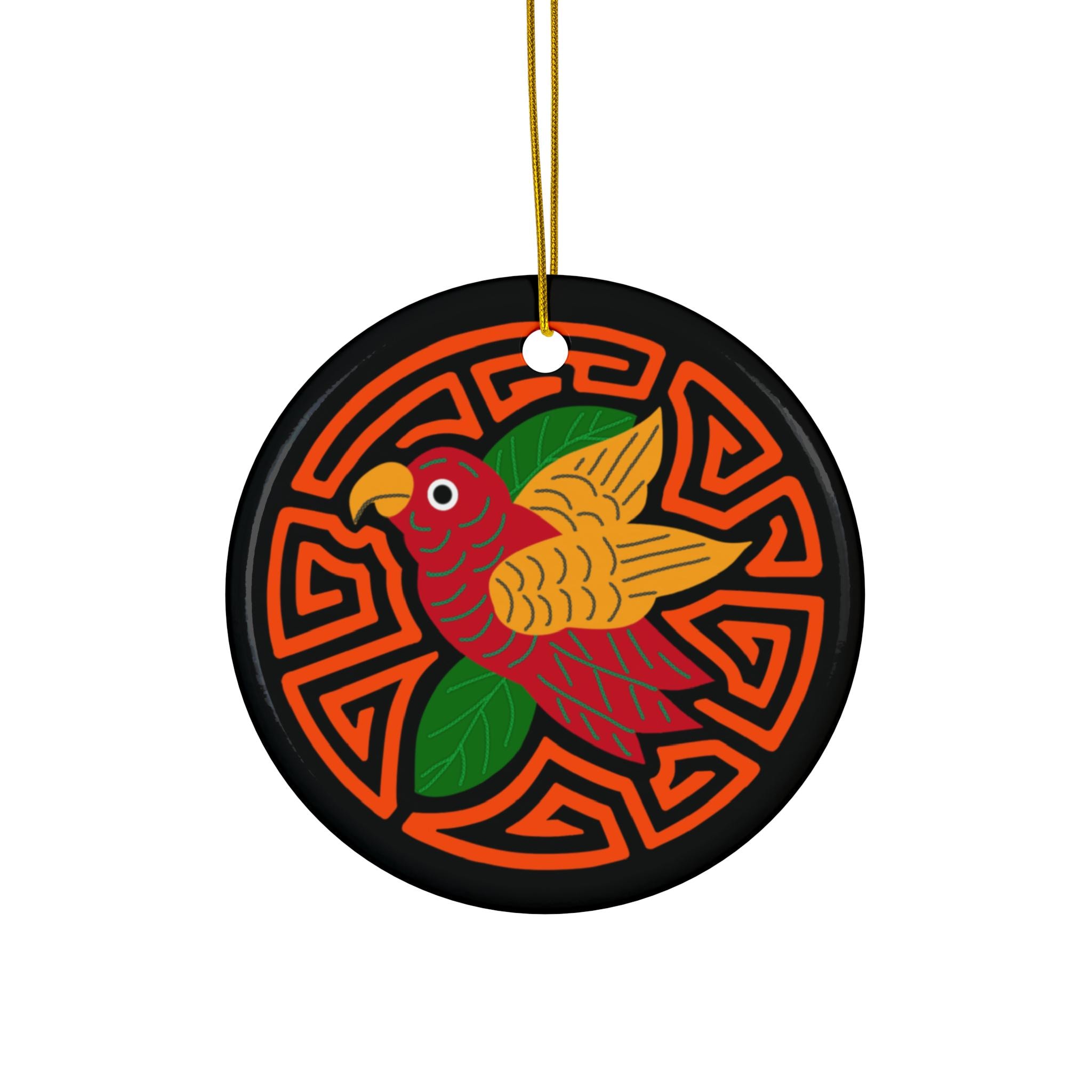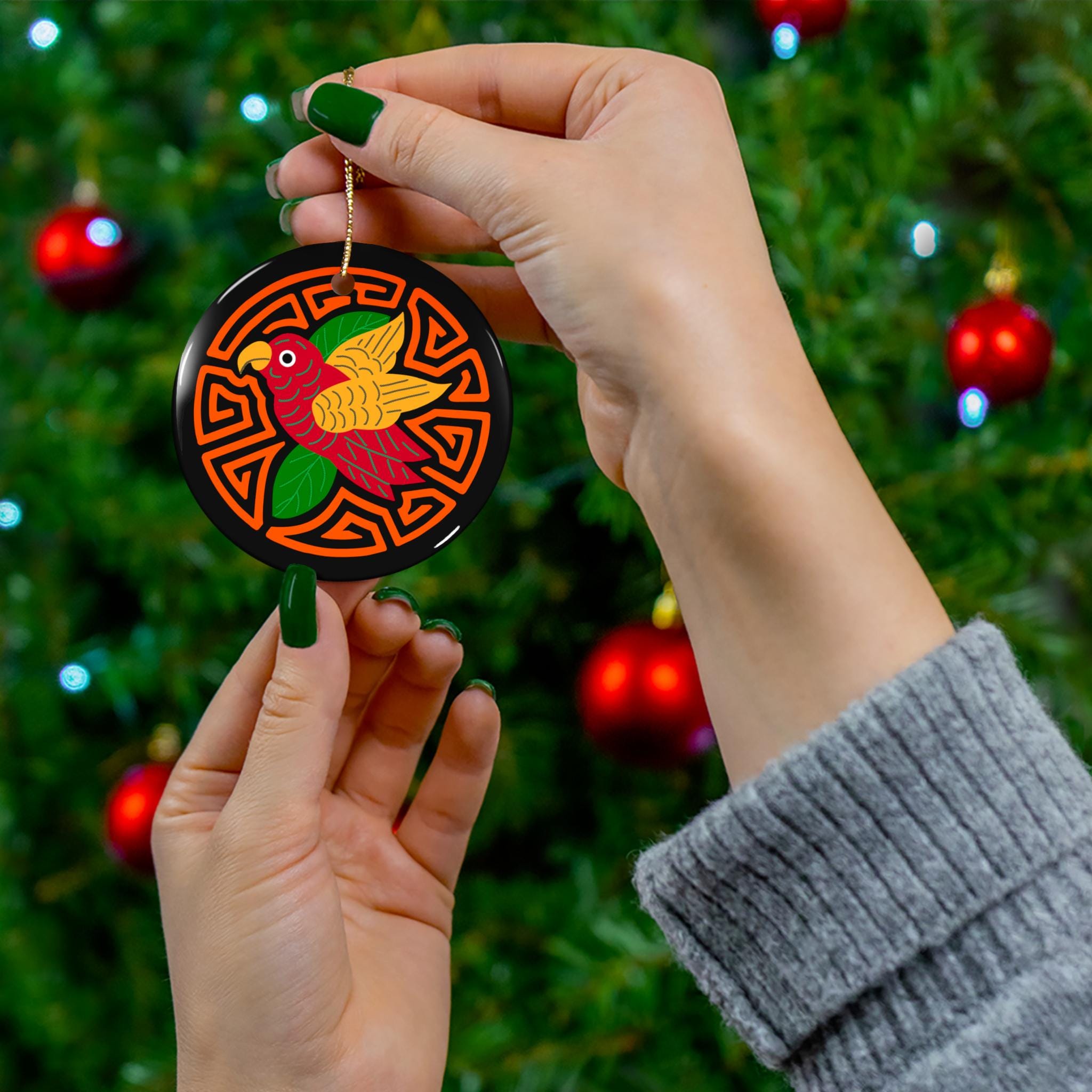 A small ceramic ornament that brings bold color and folk-art warmth to your space. The one-sided, glossy print shows a stylized red and gold bird perched on green leaves against a striking black-and-orange Mola background. Lightweight yet sturdy at 3mm thick, each piece is a single solid ceramic disc with a neatly drilled hole and a gold-toned hanging string included. Hang it on a tree, in a window, or from a rearview mirror to add a splash of handcrafted charm to holiday gatherings, seasonal decor swaps, or everyday displays.