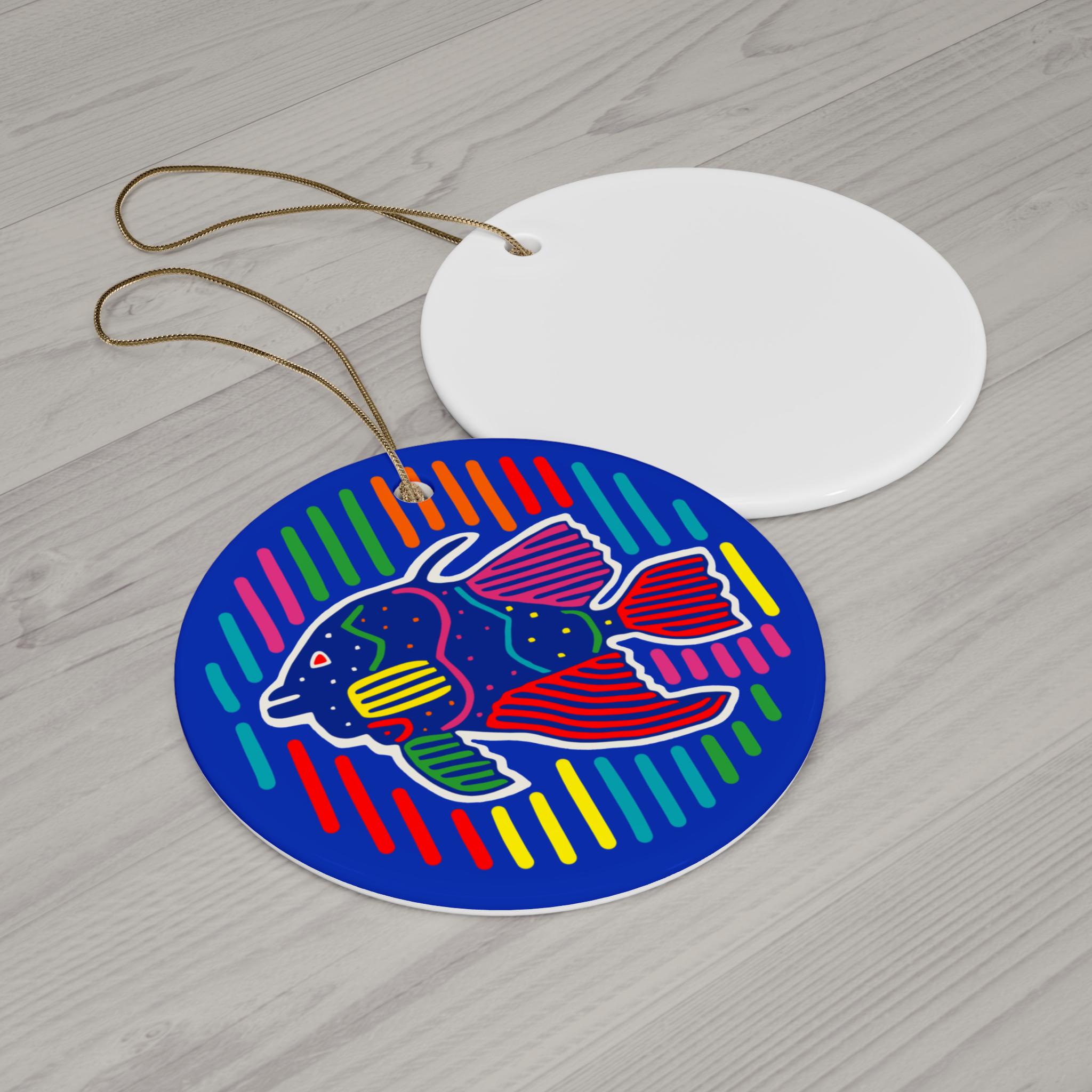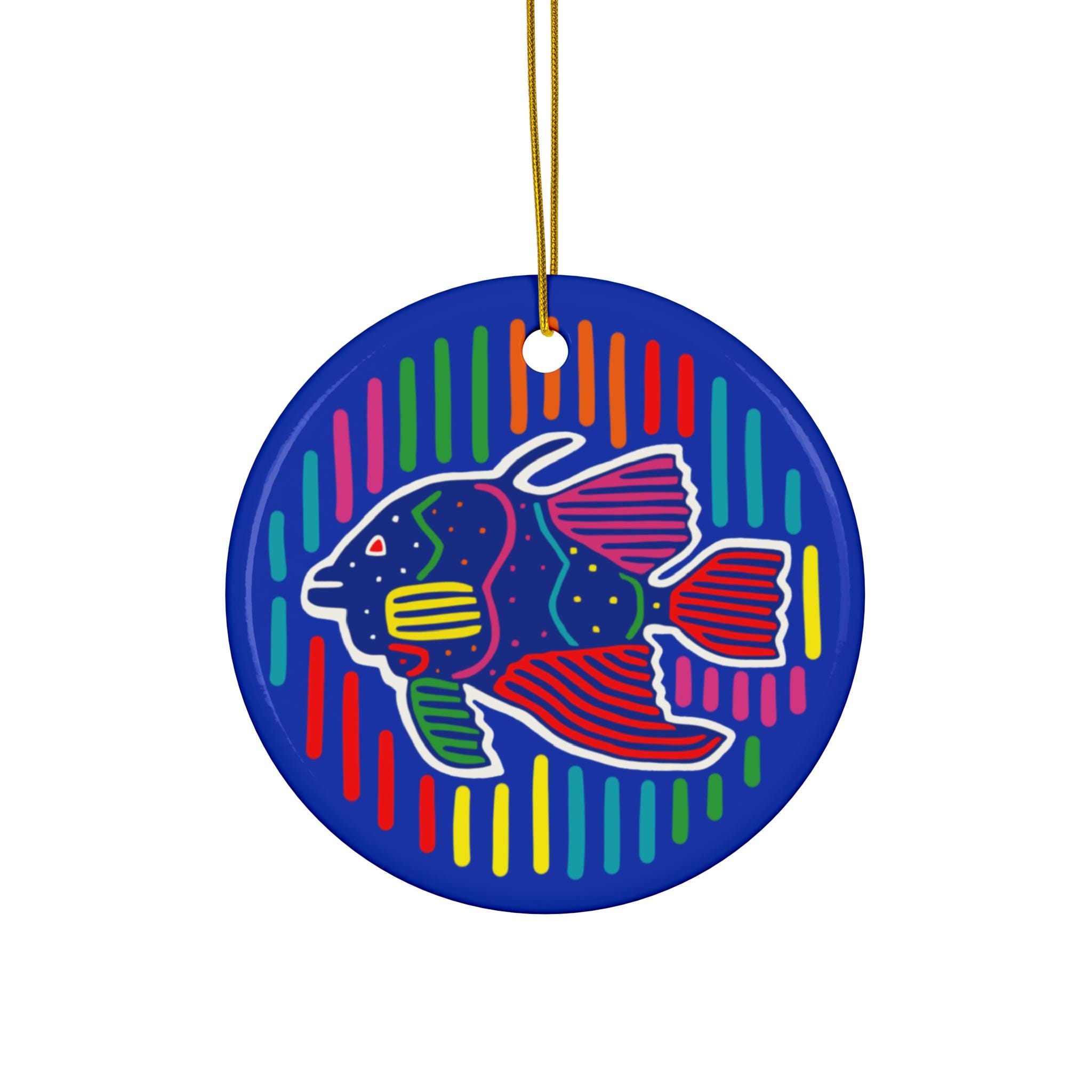 Bring a splash of joyful color to your tree or home with this glossy ceramic ornament. The one-piece, 3mm-thick ornament feels substantial in the hand and shows off bright, crisp printing that keeps the playful, bold fish design vivid against a deep blue background. A gold-toned hanging string threads through the pre-drilled hole so it’s ready to hang straight from arrival. This single-sided ornament gleams under lights and adds an energetic, hand-crafted vibe to holiday décor, coastal-themed displays, or an artful everyday accent.