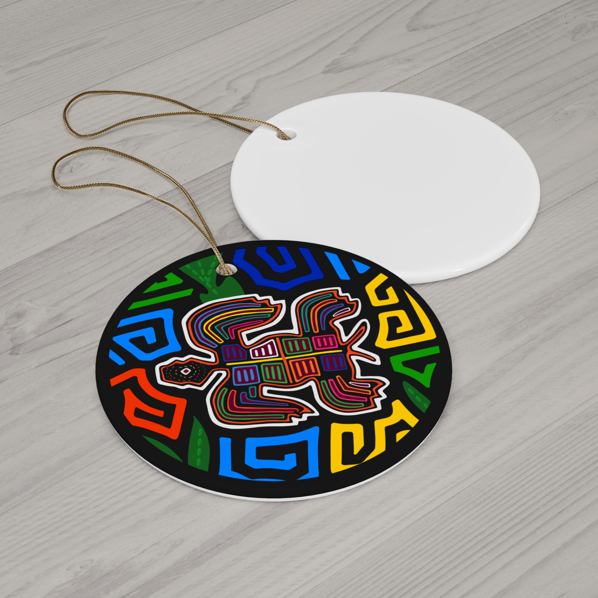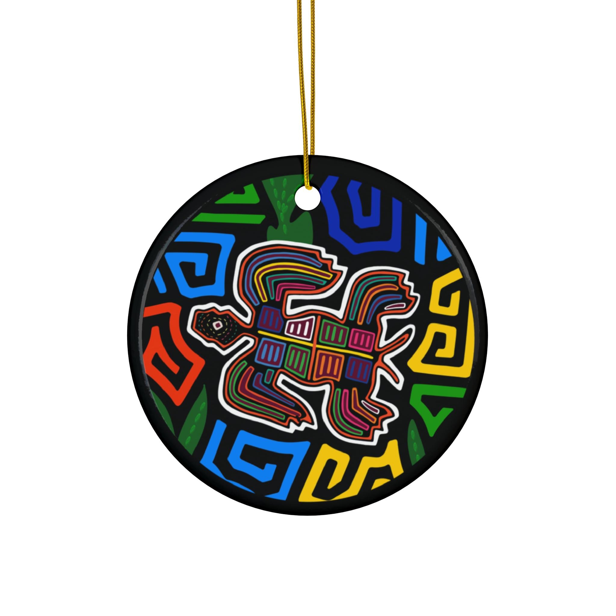 A bright, ceramic ornament that brings bold color and folk-art energy to holiday trees, windows, or cozy corners year-round. The glossy one-piece ceramic holds a single-sided, full-color print of a vibrant turtle motif set against a geometric, multicolored background. Lightweight but sturdy at 3mm thickness, it arrives ready to hang with a gold-toned string threaded through a pre-drilled hole.