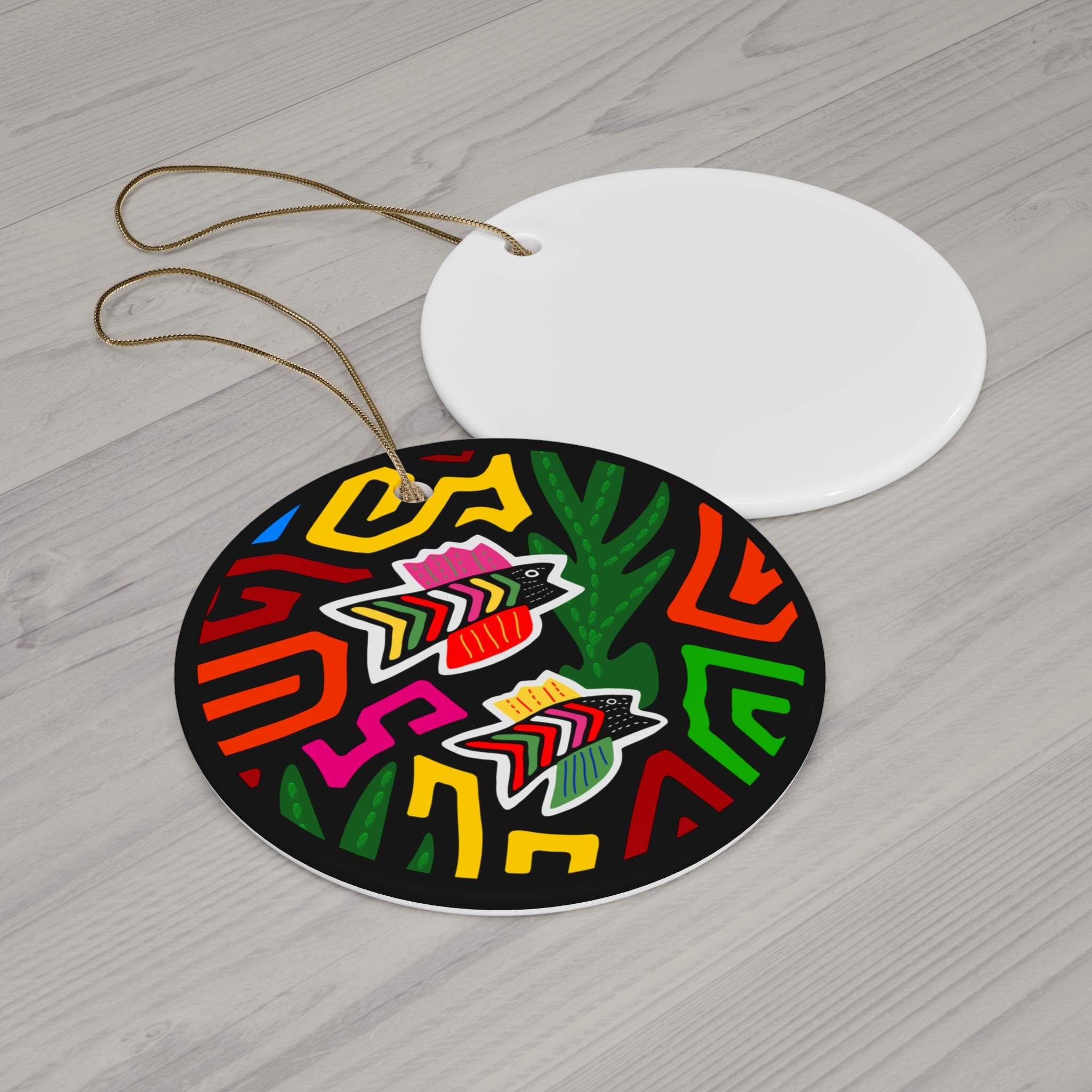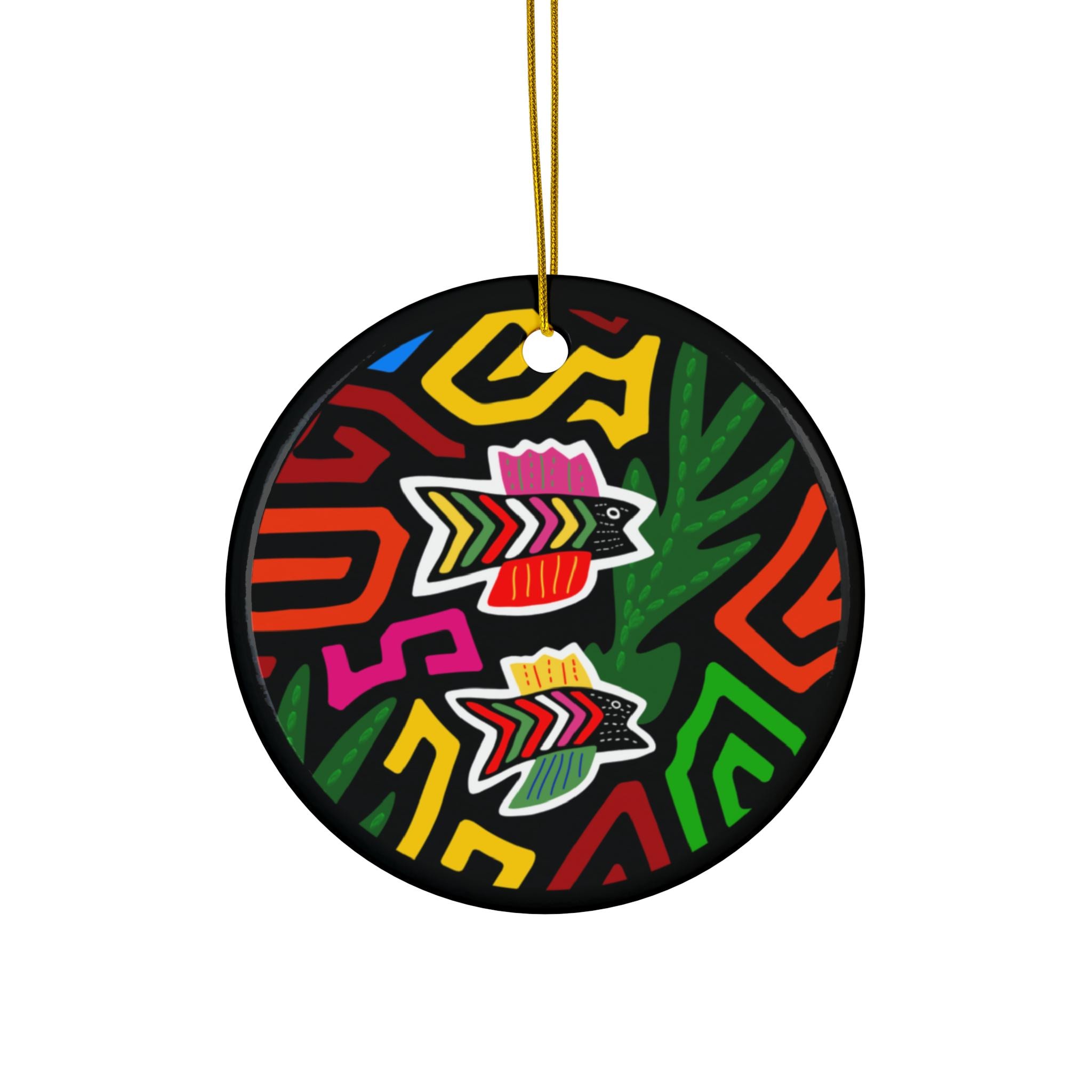 A bright ceramic ornament that brings bold color and playful energy to tree branches, window sills, or gift tags. The design pops with vivid, saturated hues and cheerful graphic fish motifs set against a deep background — it reads like a happy talisman from a summer market. Lightweight but sturdy, each round ceramic piece has a glossy finish that makes the artwork shimmer and a gold-toned hanging string ready to display. Choose this ornament when you want a splash of color that feels joyful, artisanal, and made to last.