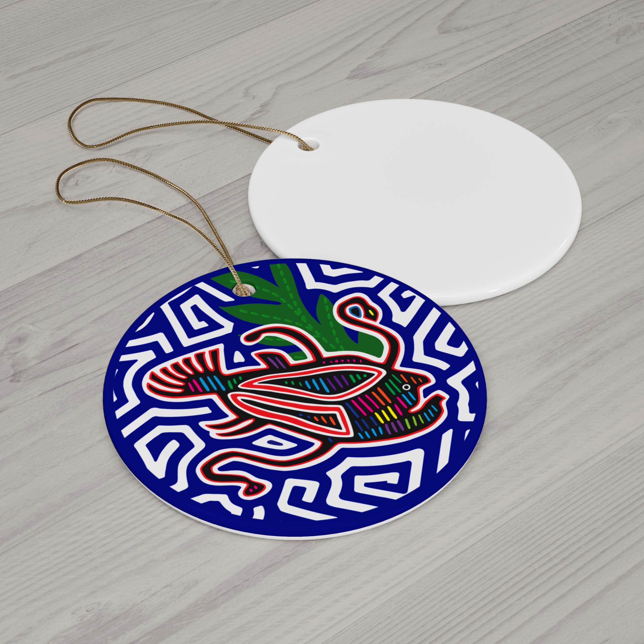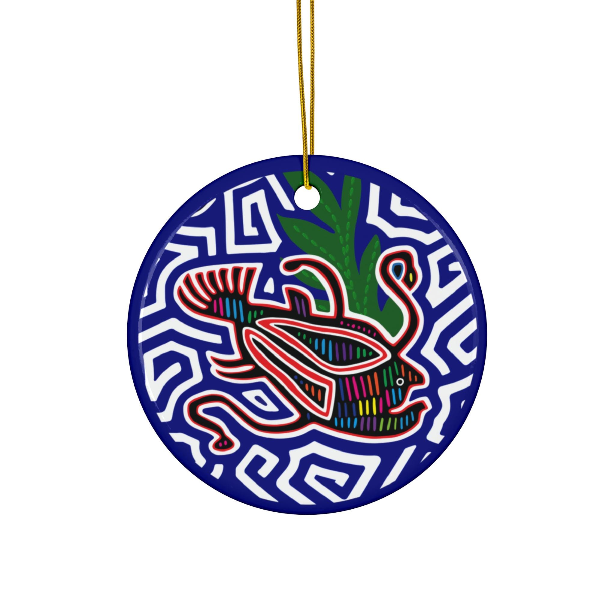 Handmade ceramic ornament that brings bold color and playful pattern to any hanging display. This single-sided, glossy ornament showcases vivid, high-resolution printing on a solid one-piece ceramic disc, edged in black and finished with a gold-toned hanging string. The artwork’s lively shapes and deep blues add a pop of modern folk-art energy to trees, windows, or everyday decor. It hangs light and flat, catching light on the glossy surface while the durable 3mm ceramic holds up season after season. Each package includes one ornament with a pre-drilled hole; small variations in hole placement are normal and do not affect the overall look.