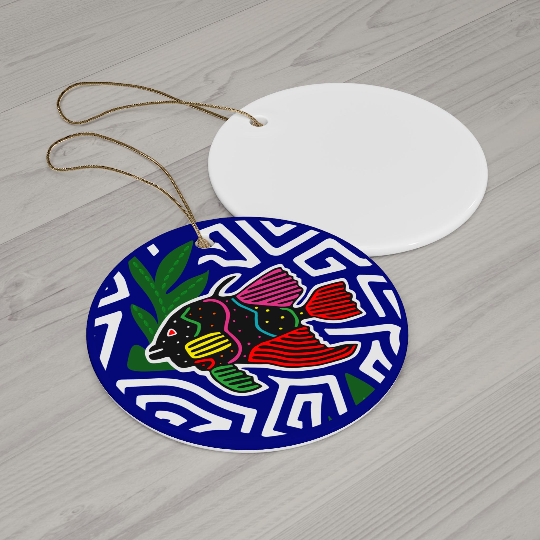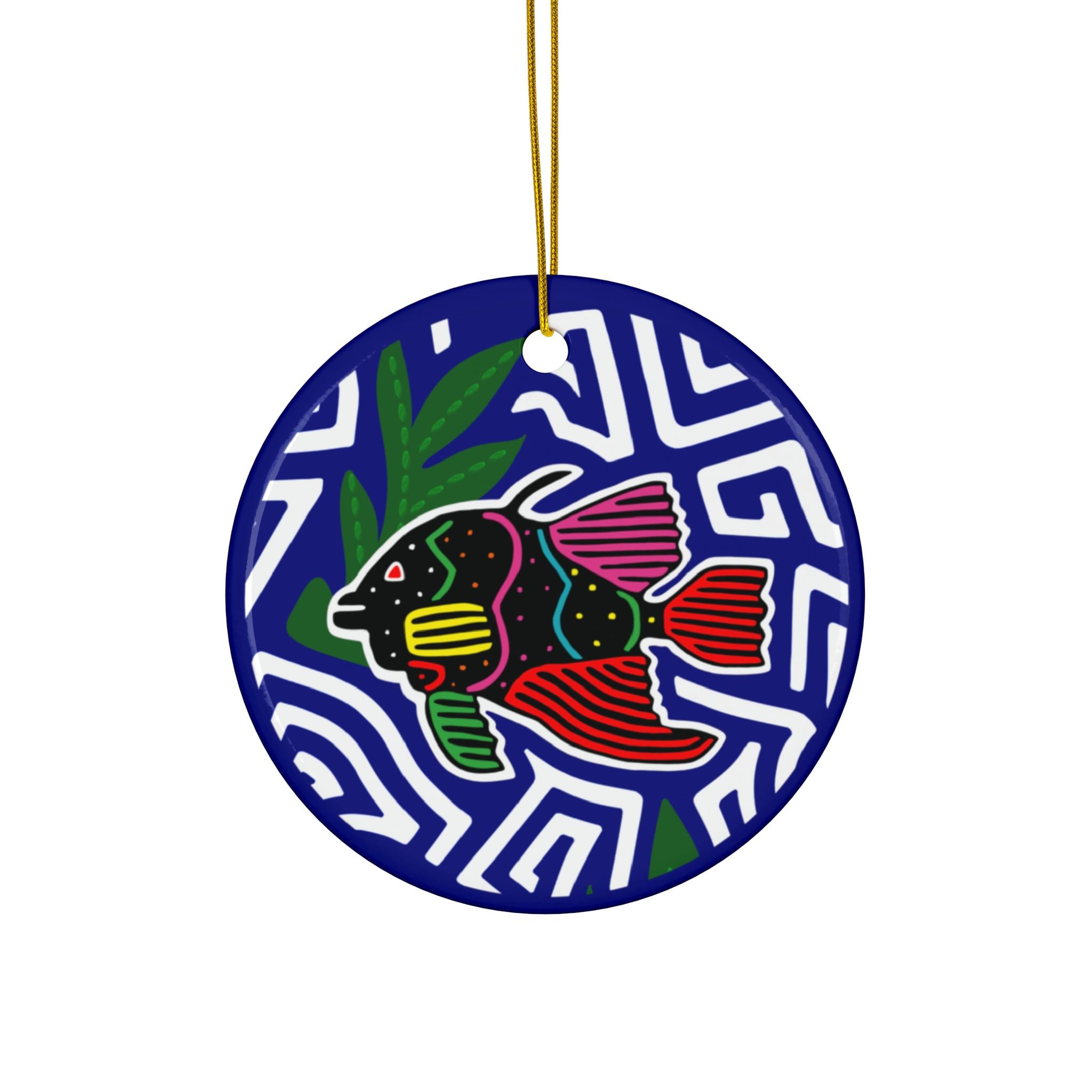 Hand-painted energy meets evergreen tradition in this glossy ceramic ornament. A vibrant, folk-art fish swims against a bold, maze-like blue background—colorful fins, dotted accents, and leafy green touchpoints bring a playful, handcrafted feel. The one-sided print pops on smooth white ceramic with a reflective gloss that catches holiday lights or window sun. A gold-toned hanging string threads through the pre-drilled hole so it’s ready to hang on a tree, in a window, or layered into a seasonal mobile.