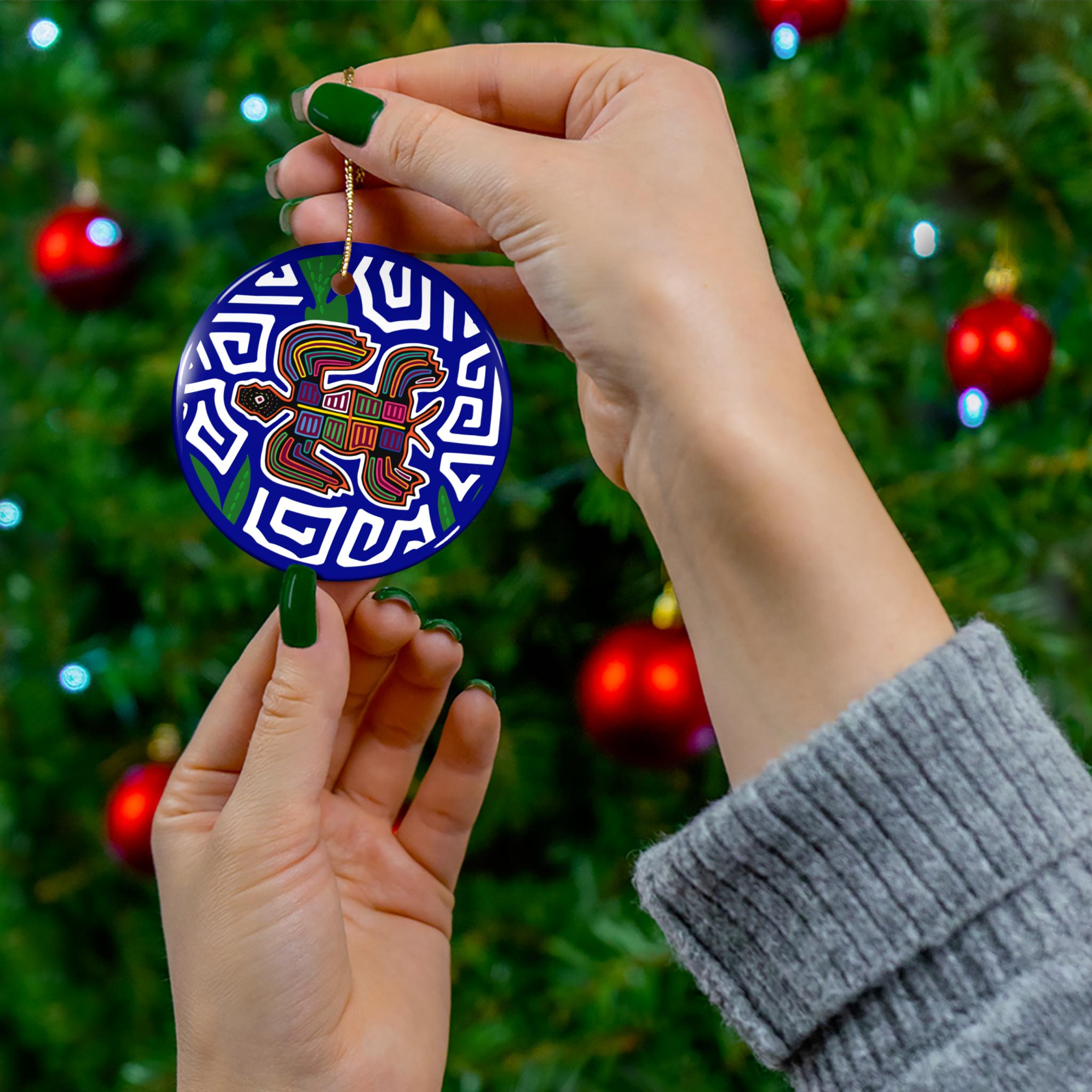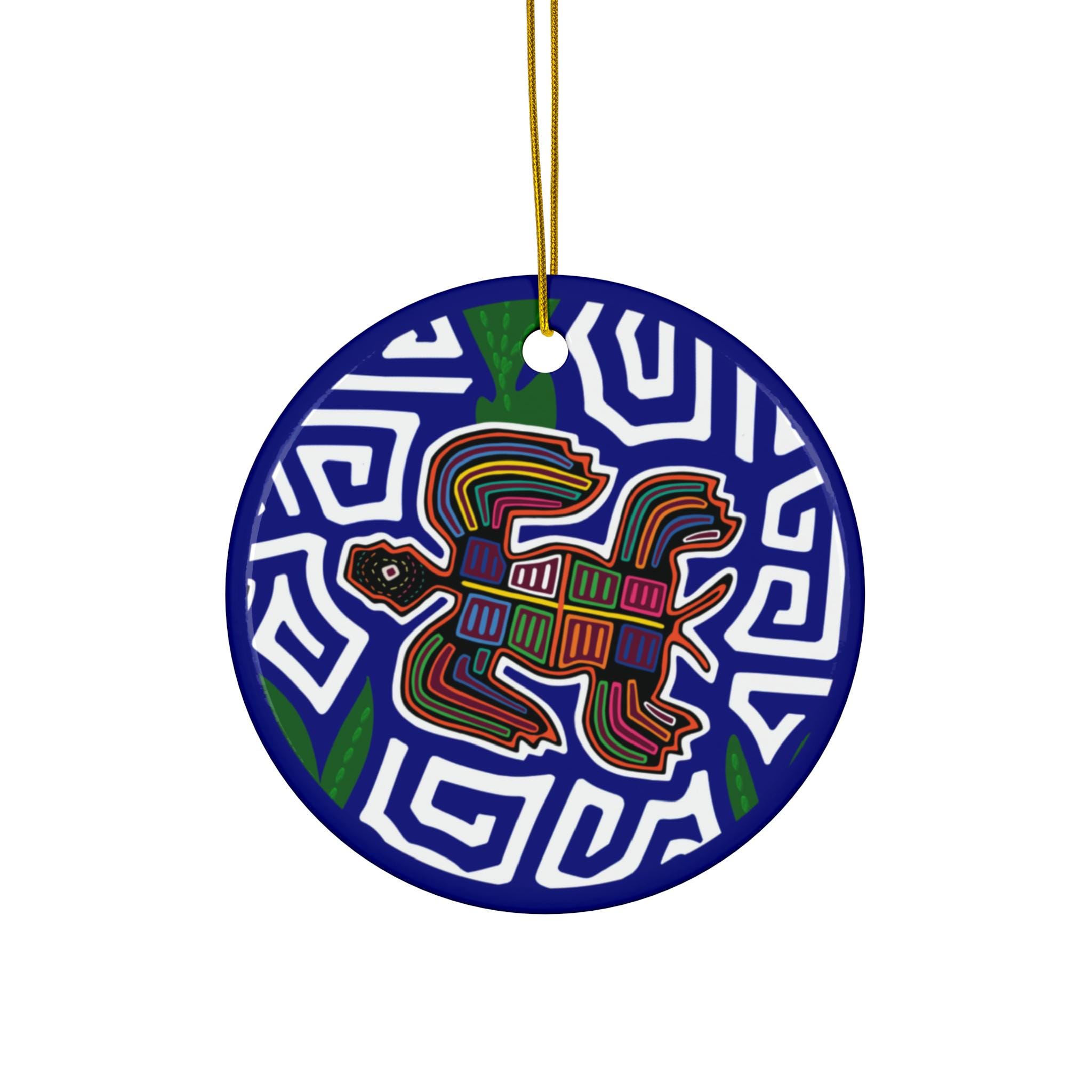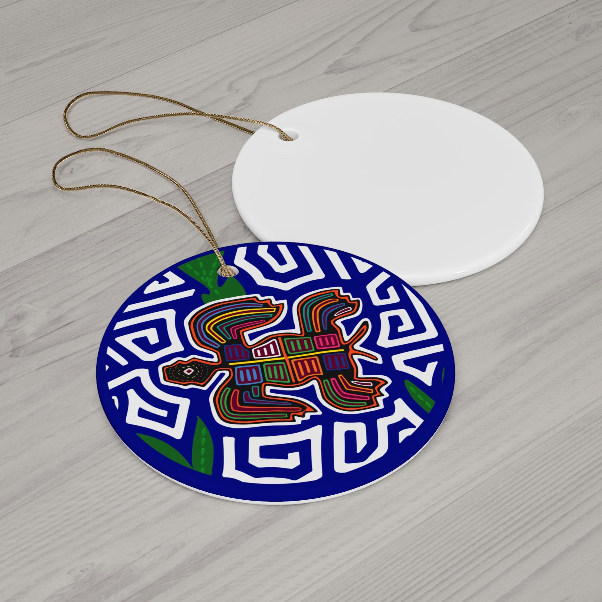 Hand-painted energy captured in glossy ceramic — this round ornament brings a vibrant, inspired turtle motif into any space. The rich blues and jewel tones pop against the shiny finish, and the one-piece ceramic keeps the image crisp for years. Hang it from a window, a favorite plant, or an entryway hook to catch light and start conversations. It feels like a small talisman carried home from a colorful market: bold, handcrafted in spirit, and playful in personality.