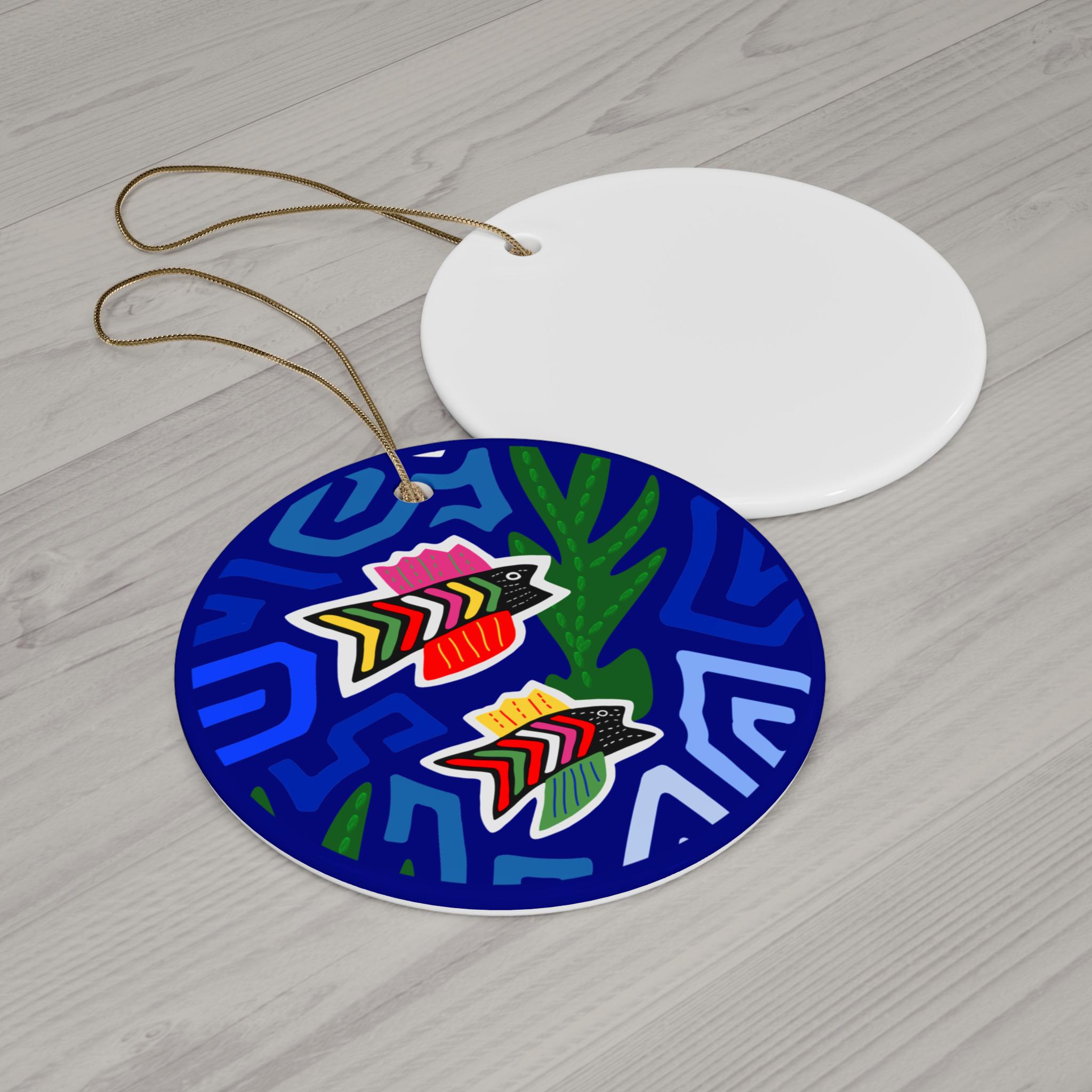 A bright, ceramic ornament that brings bold color and playful pattern to holiday trees, windows, or cozy corners of the home. The glossy surface makes the blues pop and highlights the layered, arrow-like motifs for a lively, modern folk-art feel. Lightweight but solid, it hangs from a gold-toned string and adds an instant spark to seasonal decor or everyday displays.
