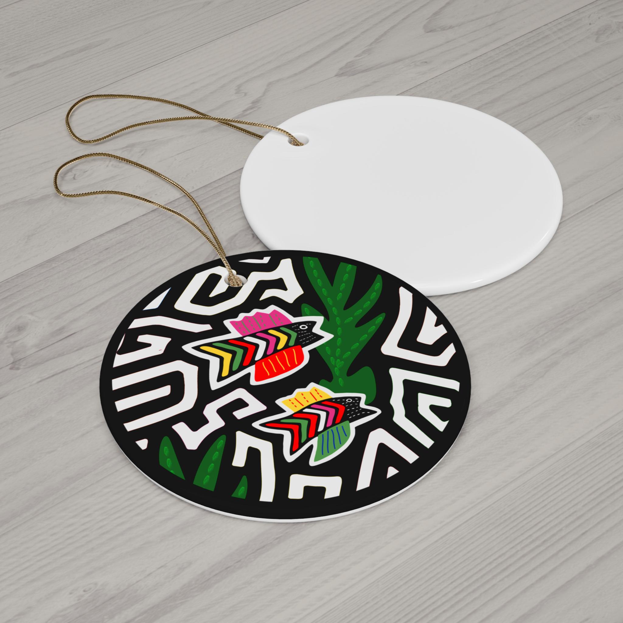 Bright, glossy ceramic ornament with bold, hand-drawn energy. The rich black-and-white maze background makes the tropical-inspired, multicolored fish and green foliage pop—like a tiny framed moment of summer on your tree or in your window. Lightweight yet sturdy, each one-piece ornament arrives ready to hang on the included gold-toned string. Use the playful round, star, heart, or snowflake shape to add a splash of color to holiday décor, a beach-house mantel, or a bright reminder on a rearview mirror. Short, tactile, and graphic—this ornament keeps a fun, artful feel without the fuss.