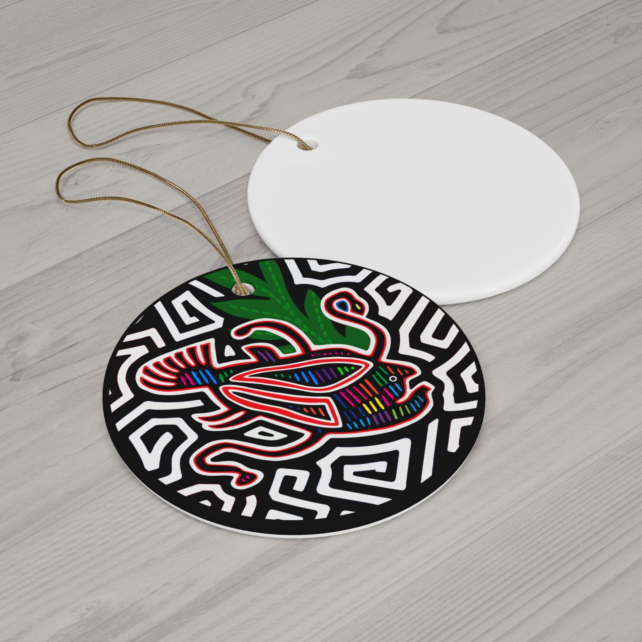 A hand-finished ceramic ornament that brings bold energy to your holiday decor or everyday hanging display. The glossy one-sided print shows a vibrant, maze-like black-and-white background with a colorful, angler fish floating at its center — detailed lines in red, green, blue, and pink pop against the high-contrast field. Lightweight but sturdy at 3mm thick, it arrives ready to hang with a gold-toned string threaded through a pre-drilled hole. Hang it from a branch, a wall hook, or tuck it into a gift as a keepsake that feels lively and modern.
