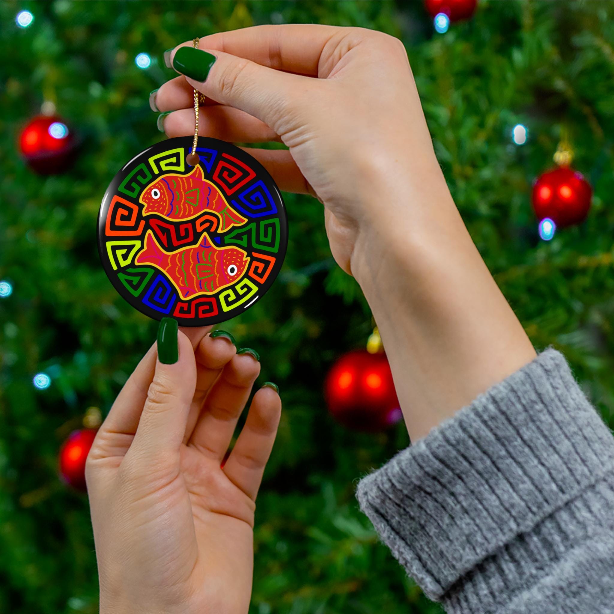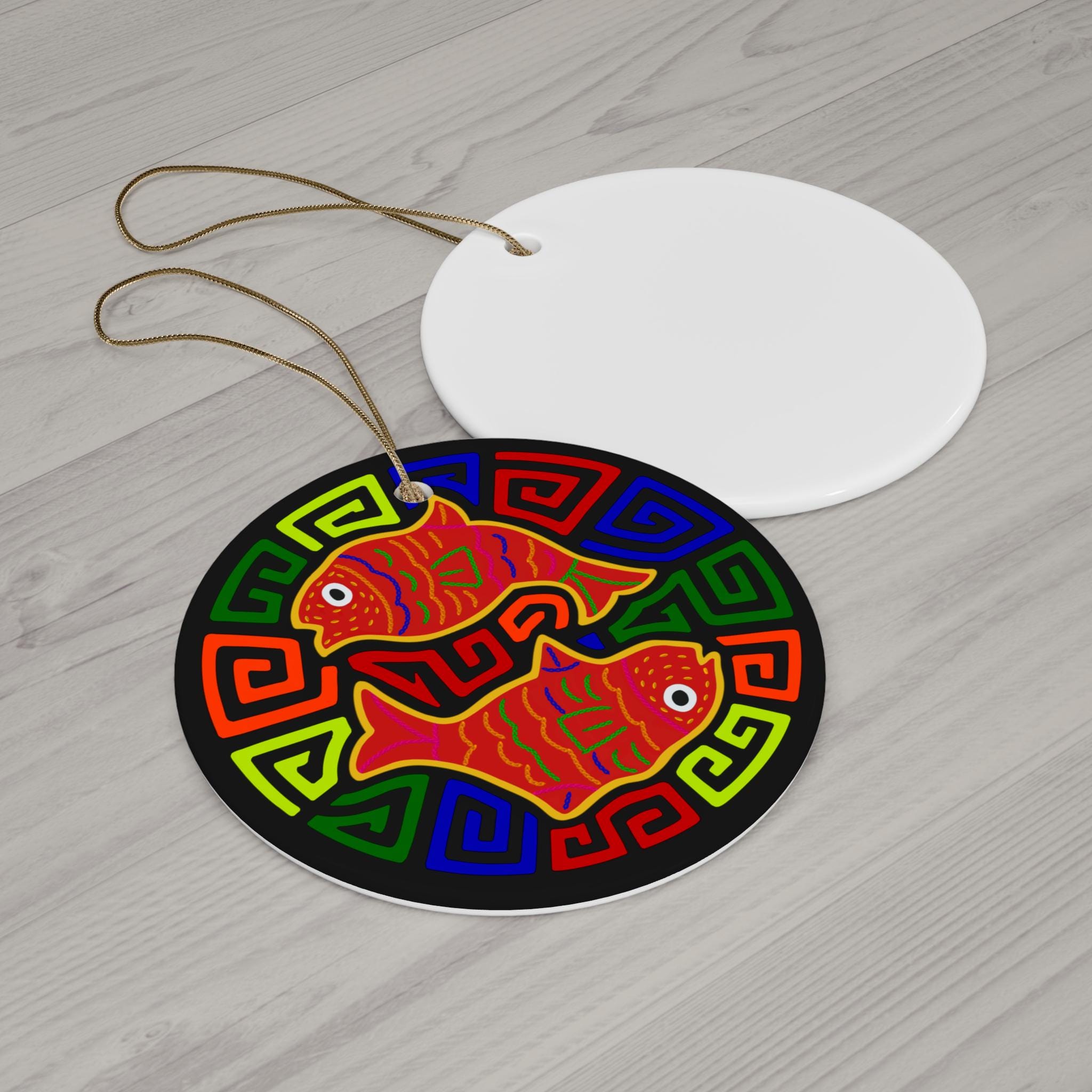 Bright, joyful ceramic ornament that brings a splash of color and folk-art charm to holiday trees, windows, or wall displays. This single-sided, glossy ornament features two vibrant, stylized fish set against a bold geometric border — colors stay crisp thanks to high-quality printing on durable 3mm ceramic. A pre-drilled hole and gold-toned hanging string make it ready to hang straight away. The compact size and sturdy one-piece construction mean this piece will hold up year after year, adding a playful, handcrafted feel to celebrations or everyday spaces.