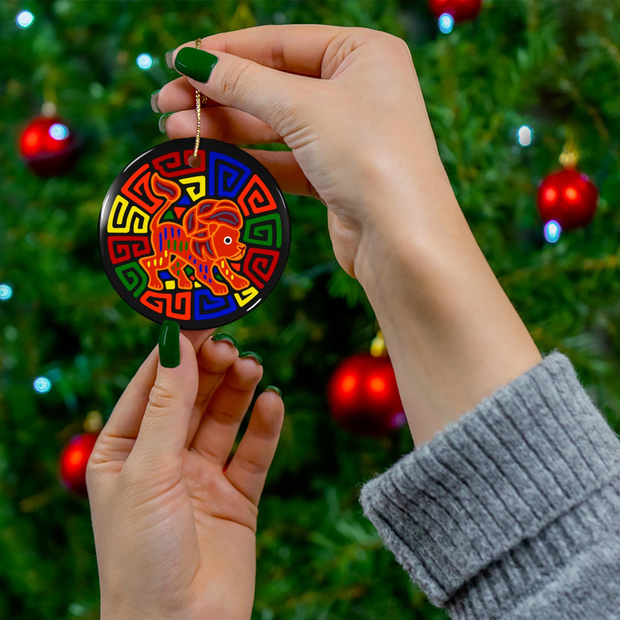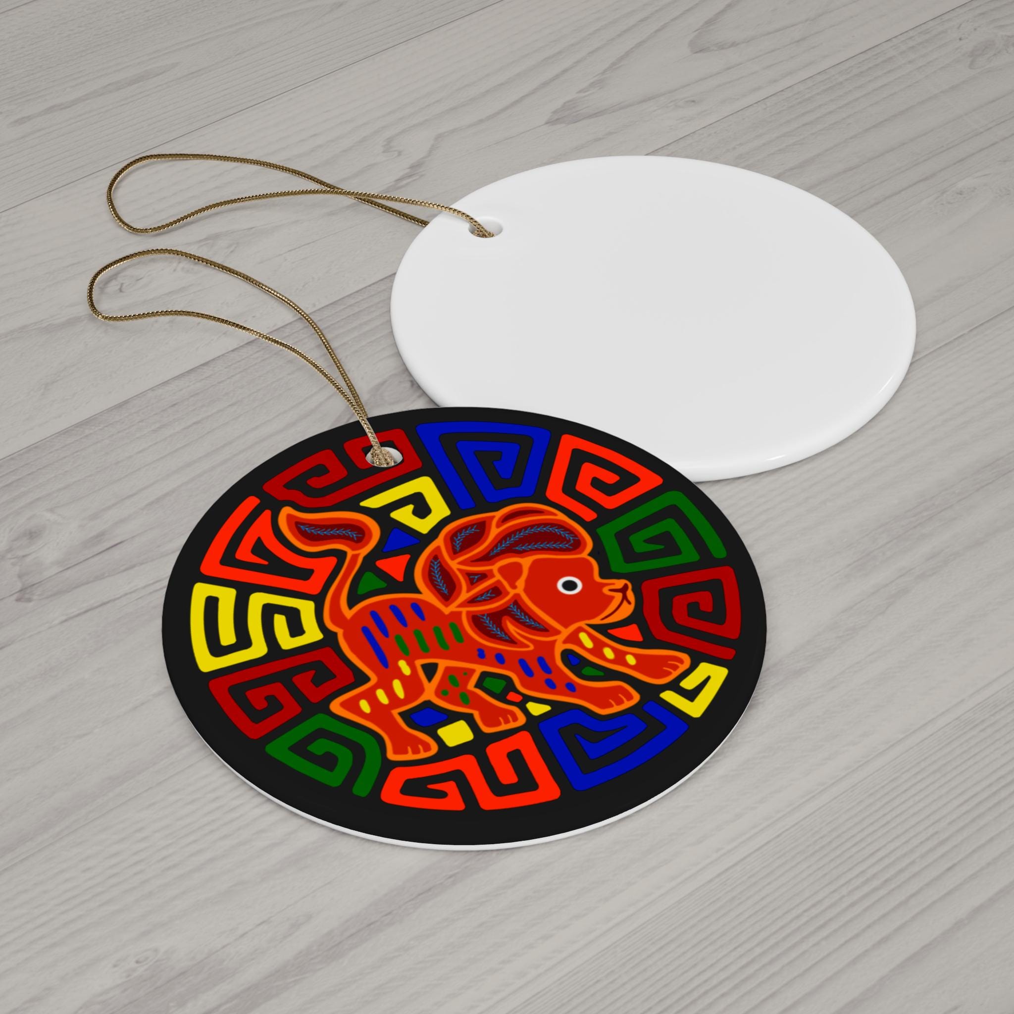 This glossy ceramic ornament brings bold color and playful charm to seasonal décor. The one-sided, high-definition print shows a stylized, brightly hued lion motif framed by geometric patterns — vivid reds, blues, yellows and greens pop against a black border. At 3mm thick with a durable one-piece ceramic construction and a shiny finish, the ornament feels solid in hand and resists peeling or delamination. A pre-drilled hole and included gold-toned hanging string make it ready to display on trees, garlands, or as year-round wall or window décor. Each purchase contains a single ornament.