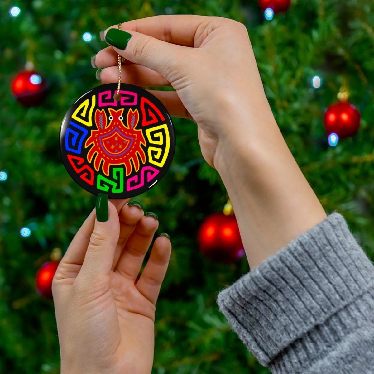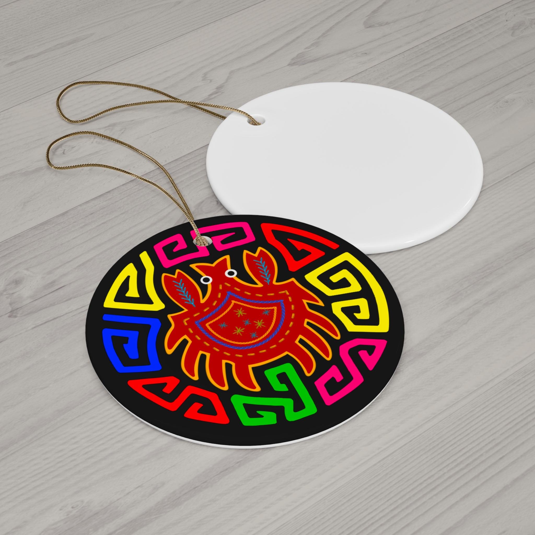 Bright, playful ceramic ornament that brings bold color and folk-art charm to holiday trees, windows, or wall hooks. The single-sided glossy print showcases a vibrant crab motif surrounded by geometric, maze-like patterns in bright hues against a black background. Lightweight yet sturdy, the one-piece ceramic disk hangs from a gold-toned string and keeps its crisp colors through the latest printing process. Use it to punctuate a boho-themed tree, add a splash of color to a coastal or eclectic room, or tuck it into a stocking for a cheerful surprise.
