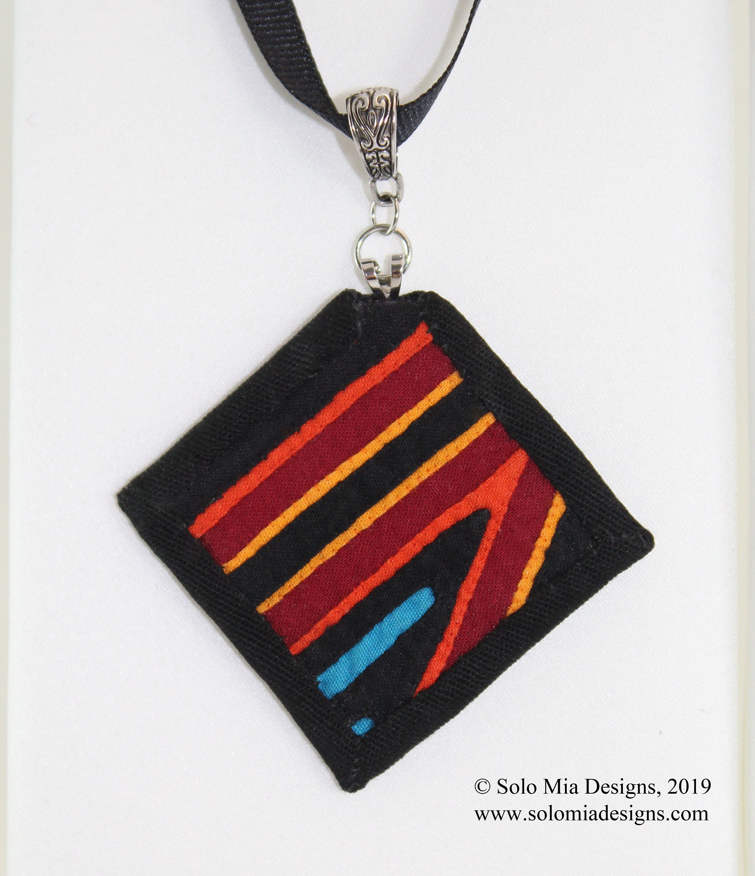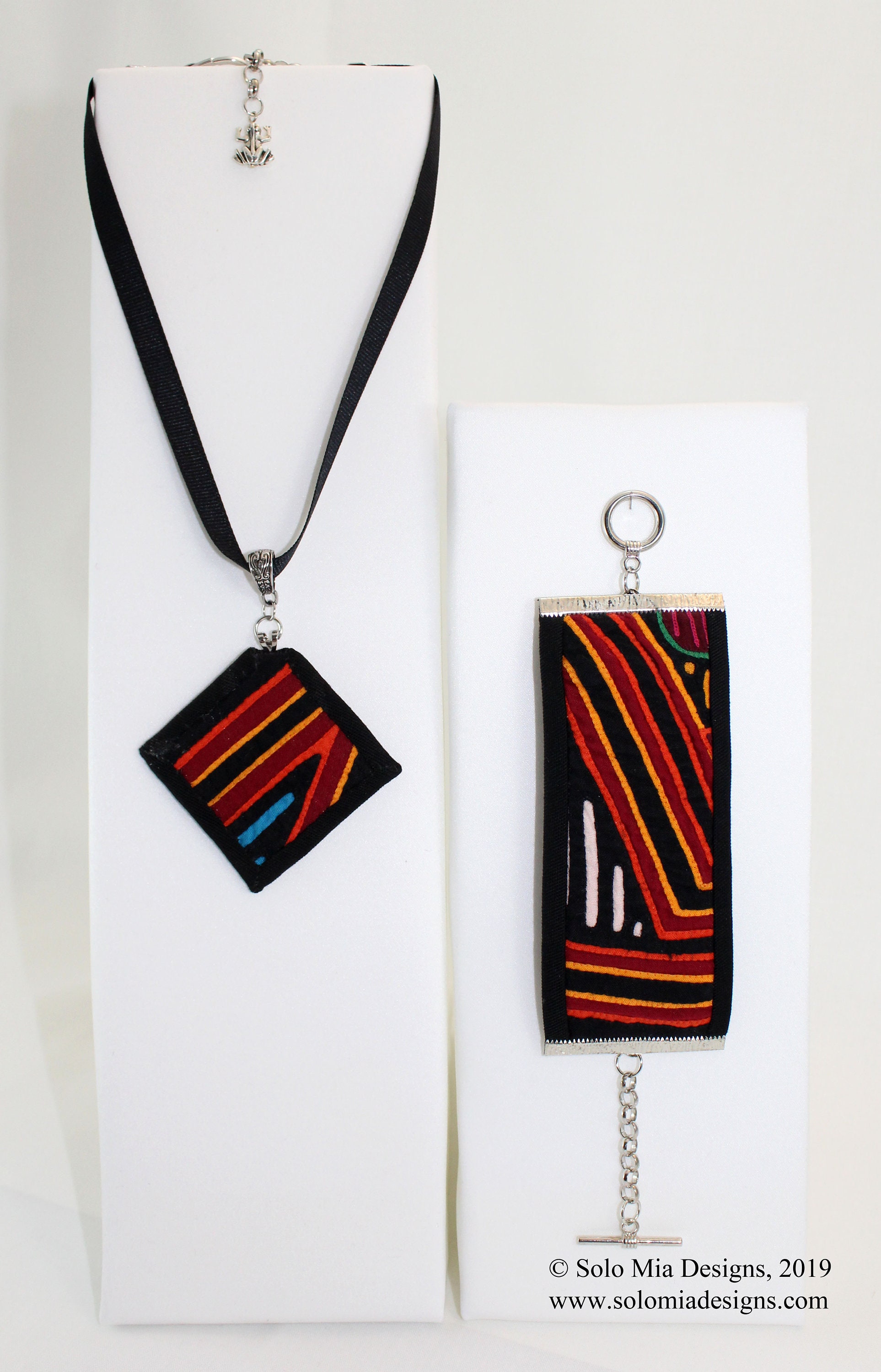 This one of a kind necklace and bracelet set are made from a mola, a form of textile art made by the Guna tribe of Panama (formerly known as Kuna or Cuna). The women of the tribe use the mola as part of their blouse in their traditional clothing. Every set of pendant and bracelet are made from different part of the mola and no two will be alike. Small frog charm on the necklace chain.